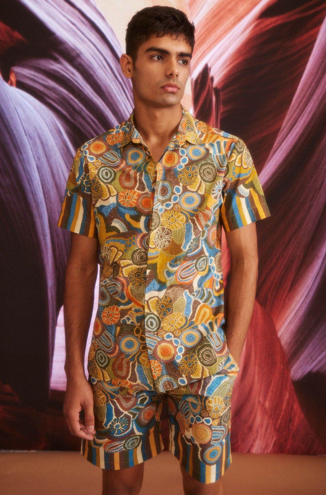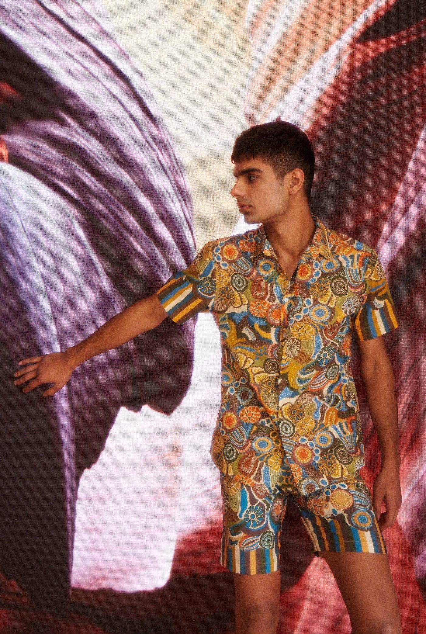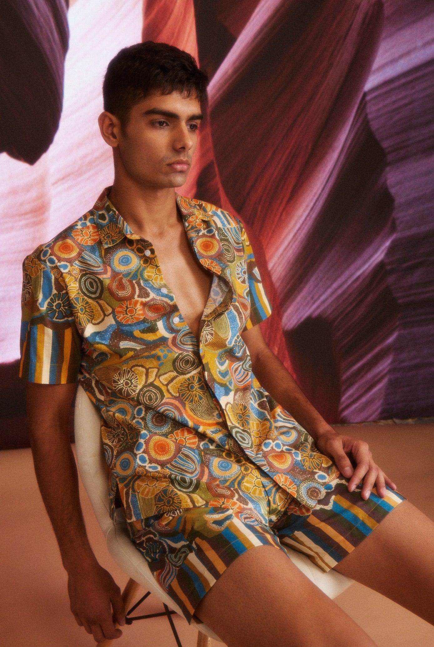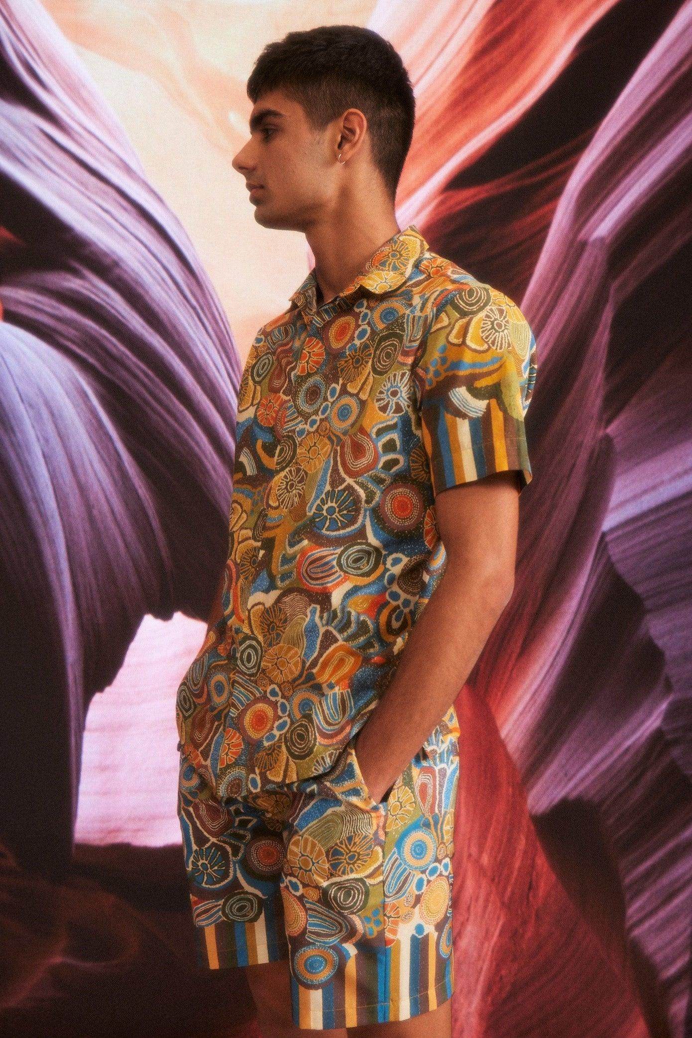 Abstract printed half sleeve swim shorts in earth tones. Elasticated at the back. Pockets on the side and back. Button closure and zip at the front. Placed stripe border on the hem of the shorts.