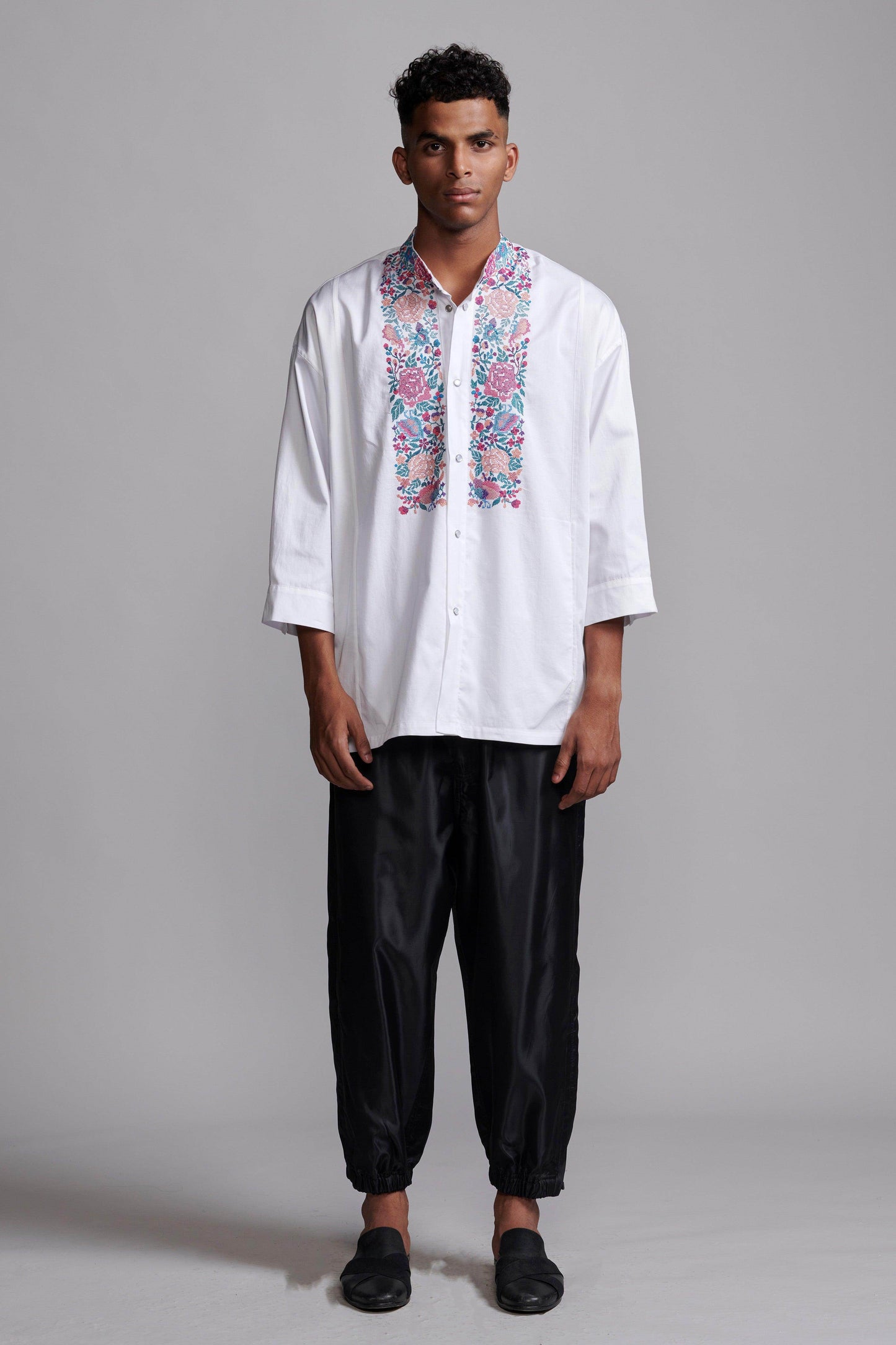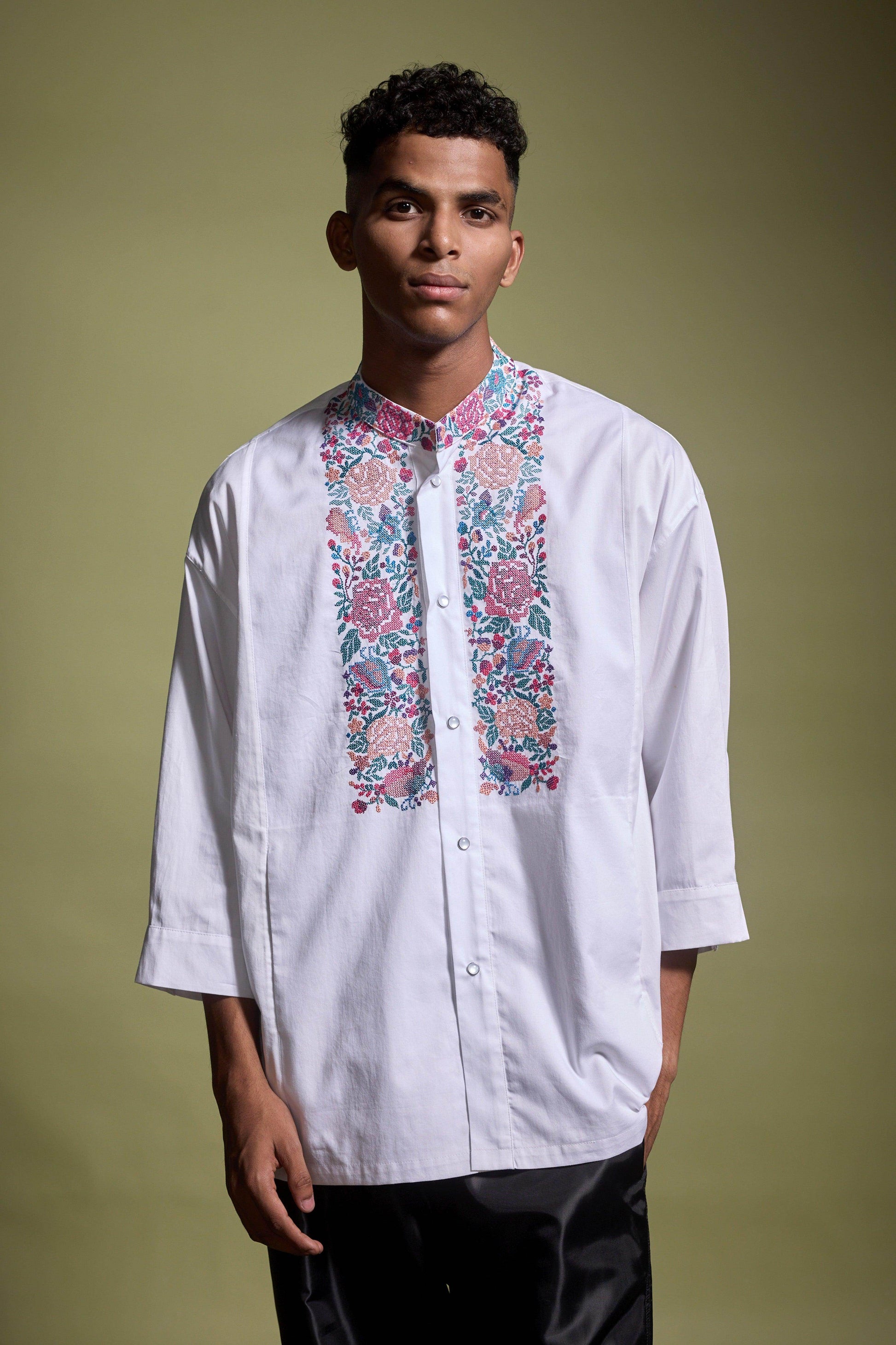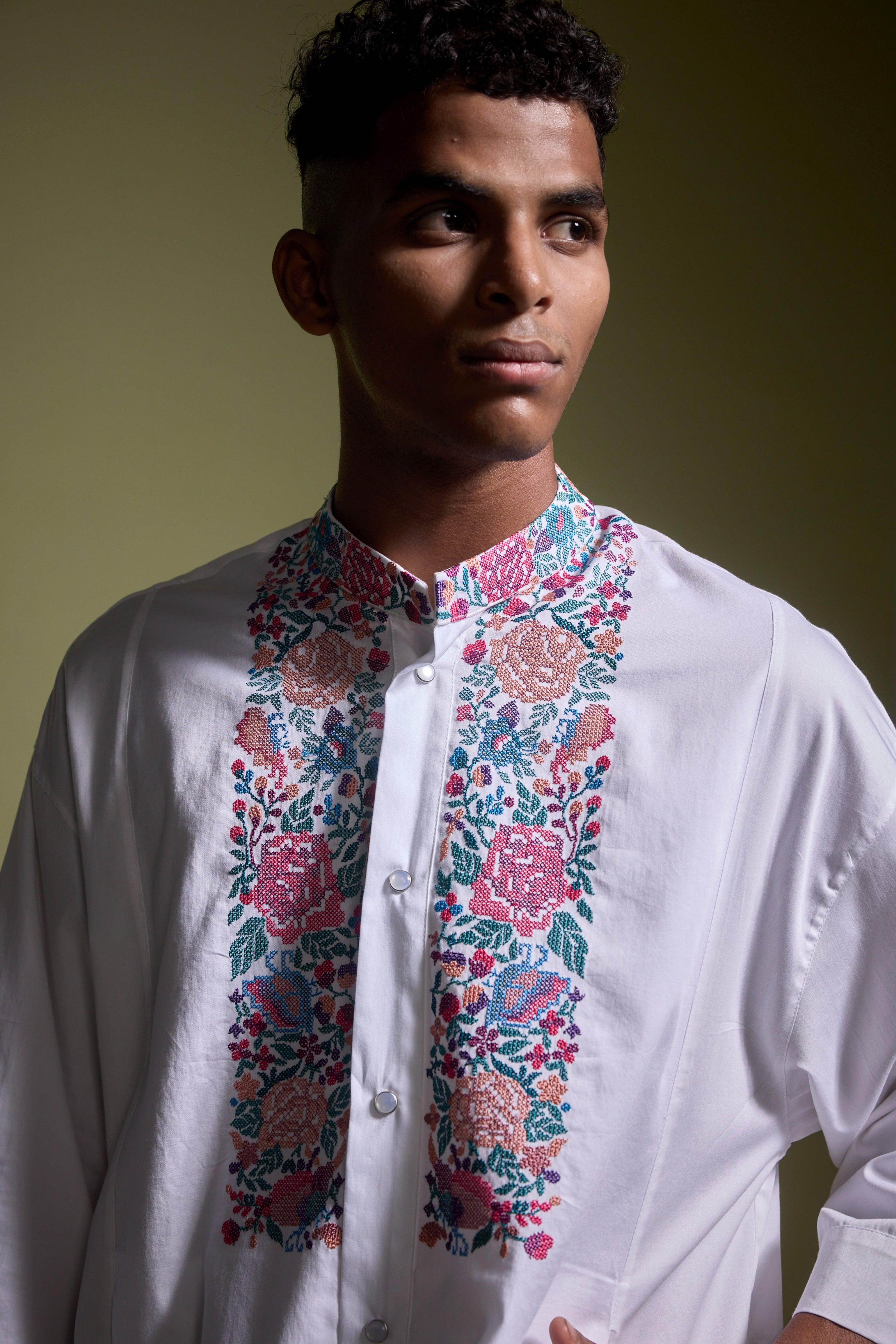 Organic cotton poplin cropped sleeve shirt with band collar. Cross stitch multicolour embroidery placed on the collar and front placket. Pockets in the front. Snap button closures on the front and sleeves. Relaxed fit.
