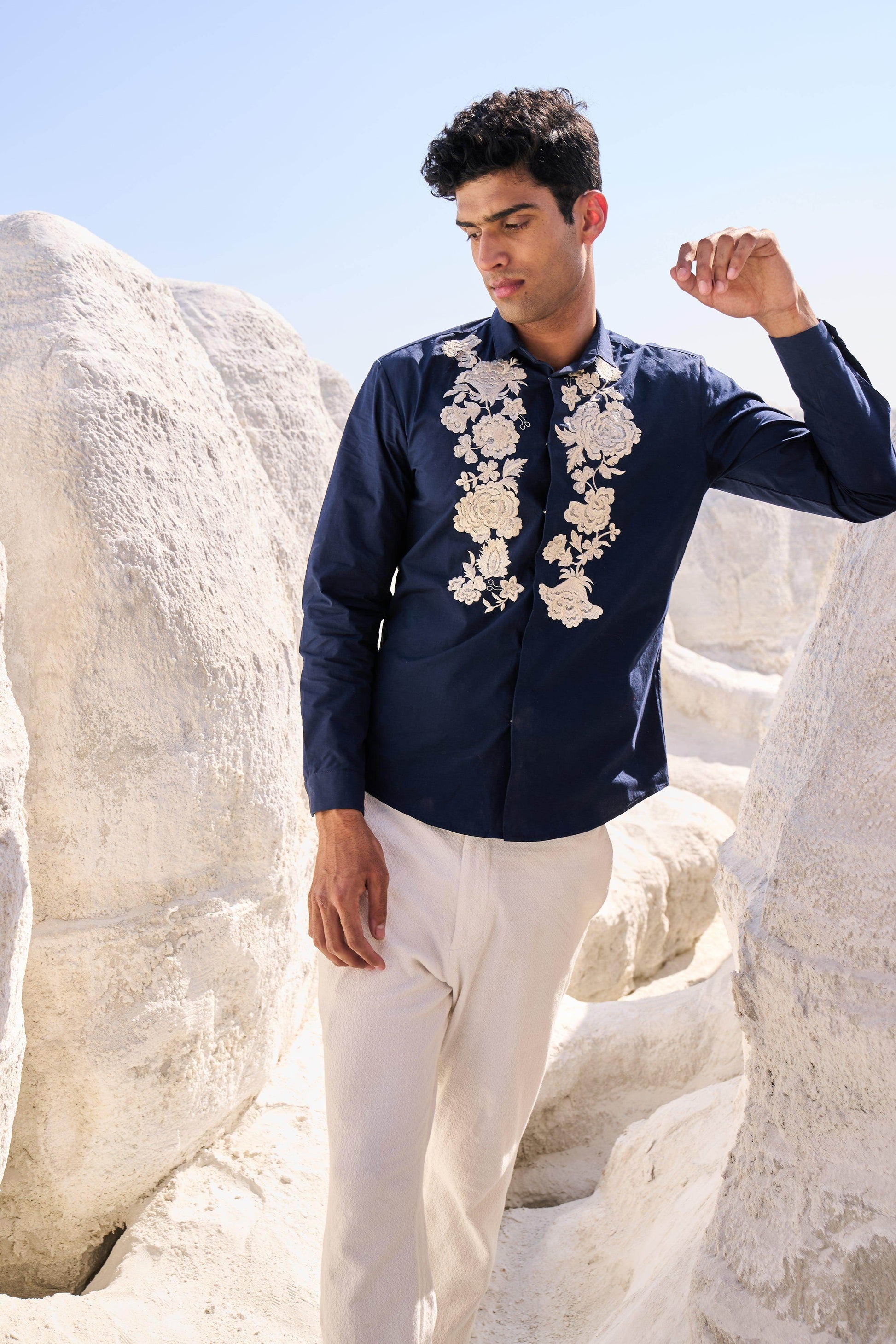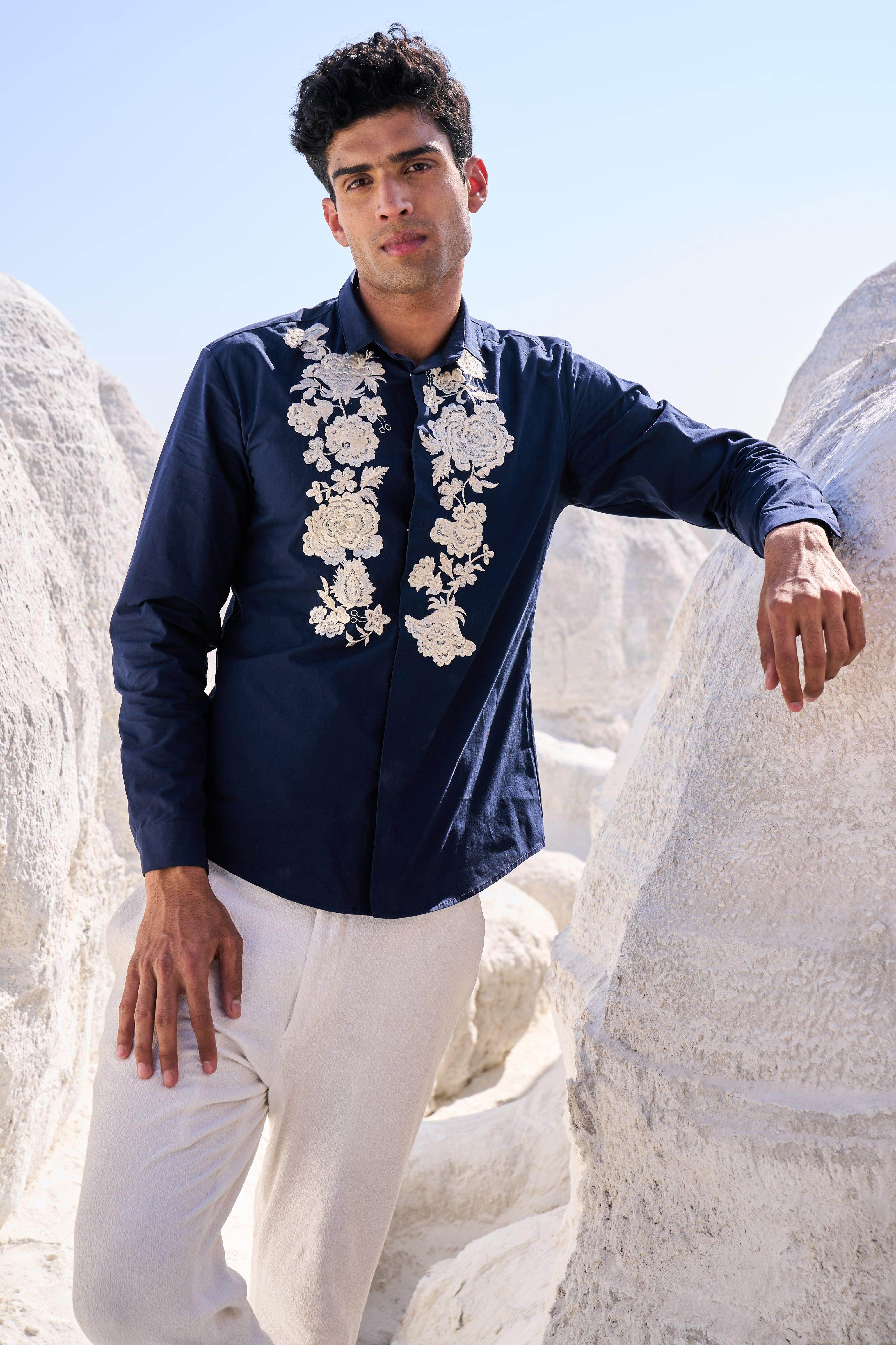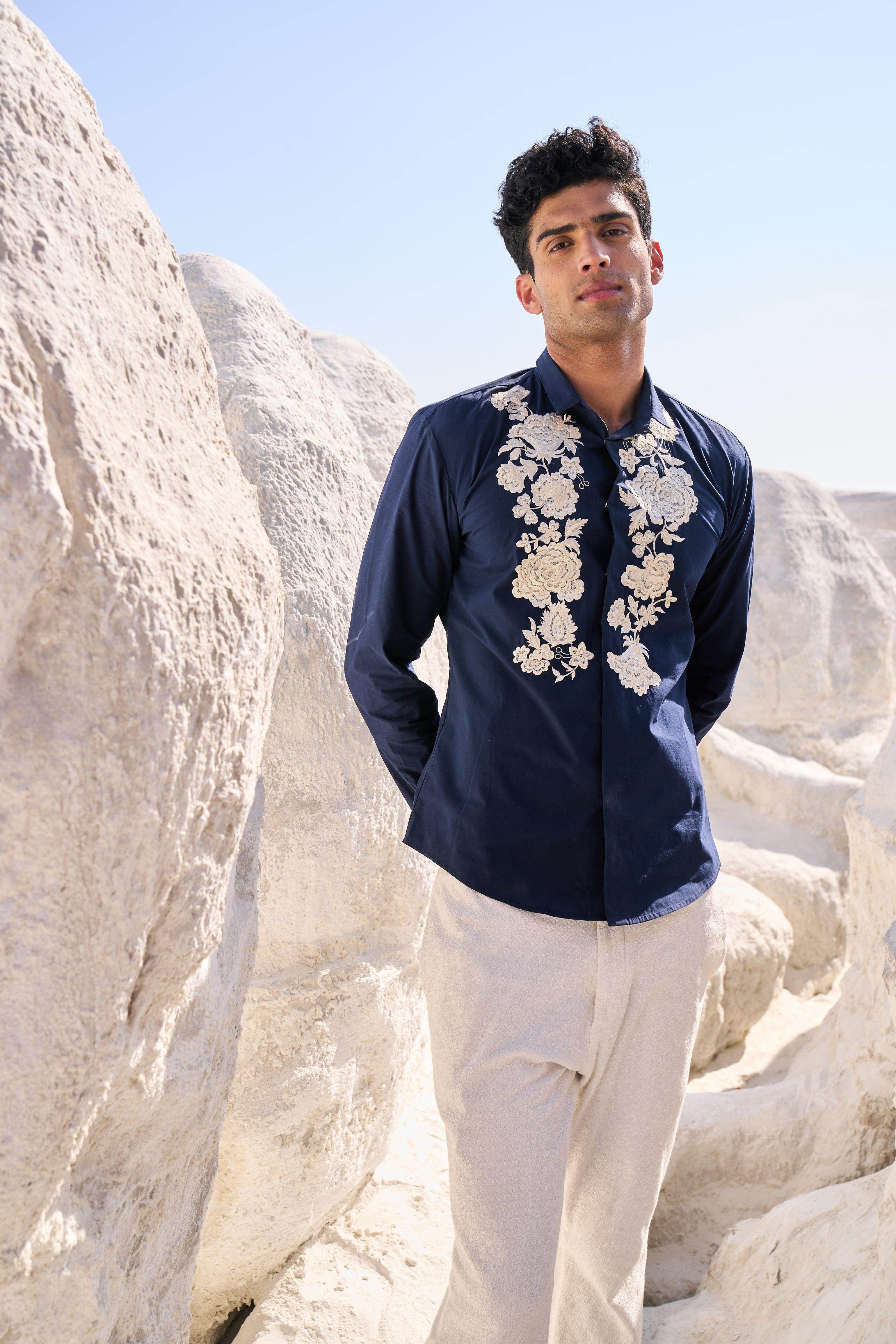 Blue cotton poplin shirt with Gara stitch inspired embroidery running down the center front placket. Long-sleeves. Snap button closure at the front and the cufff. Regular fit.