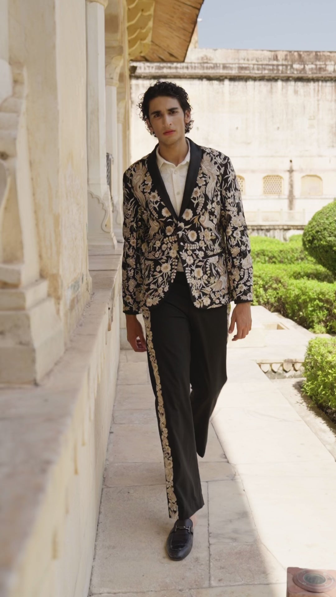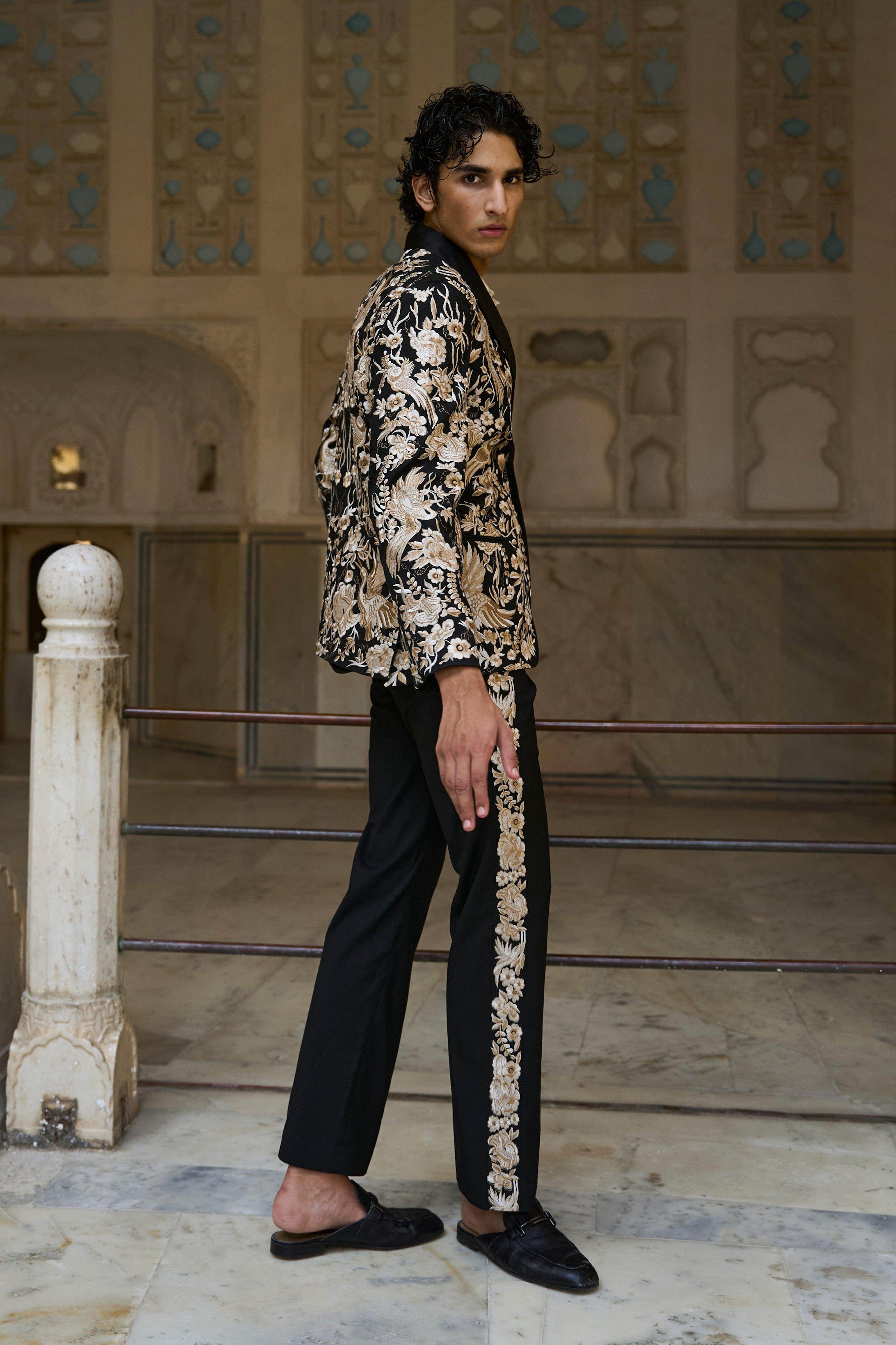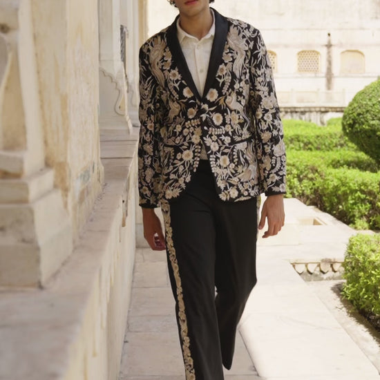 Shawl collar jacket in our signature all over Gara stitch embroidery with a satin lapel and button closure.