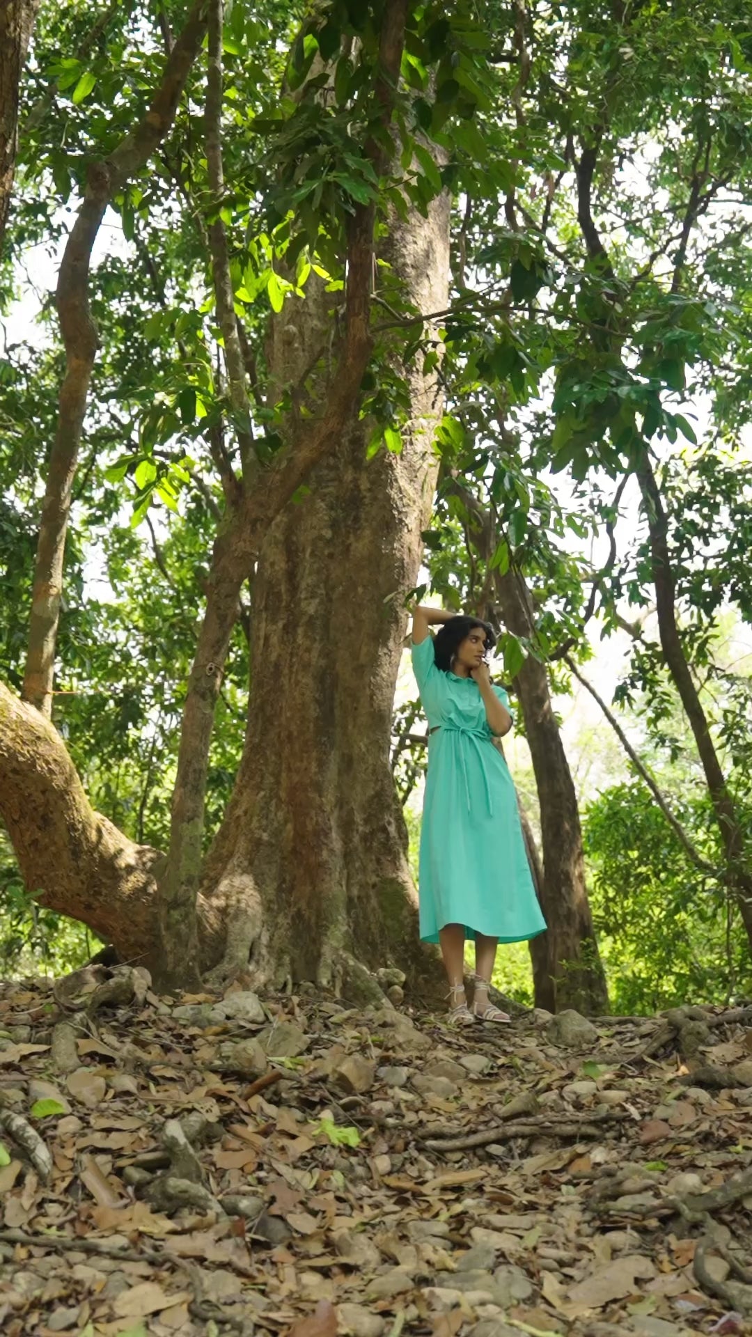 A-line midi dress with a front tie and high waist cut-outs. Shirt collar, front placket and relaxed fit half sleeves. Pockets on the sides.