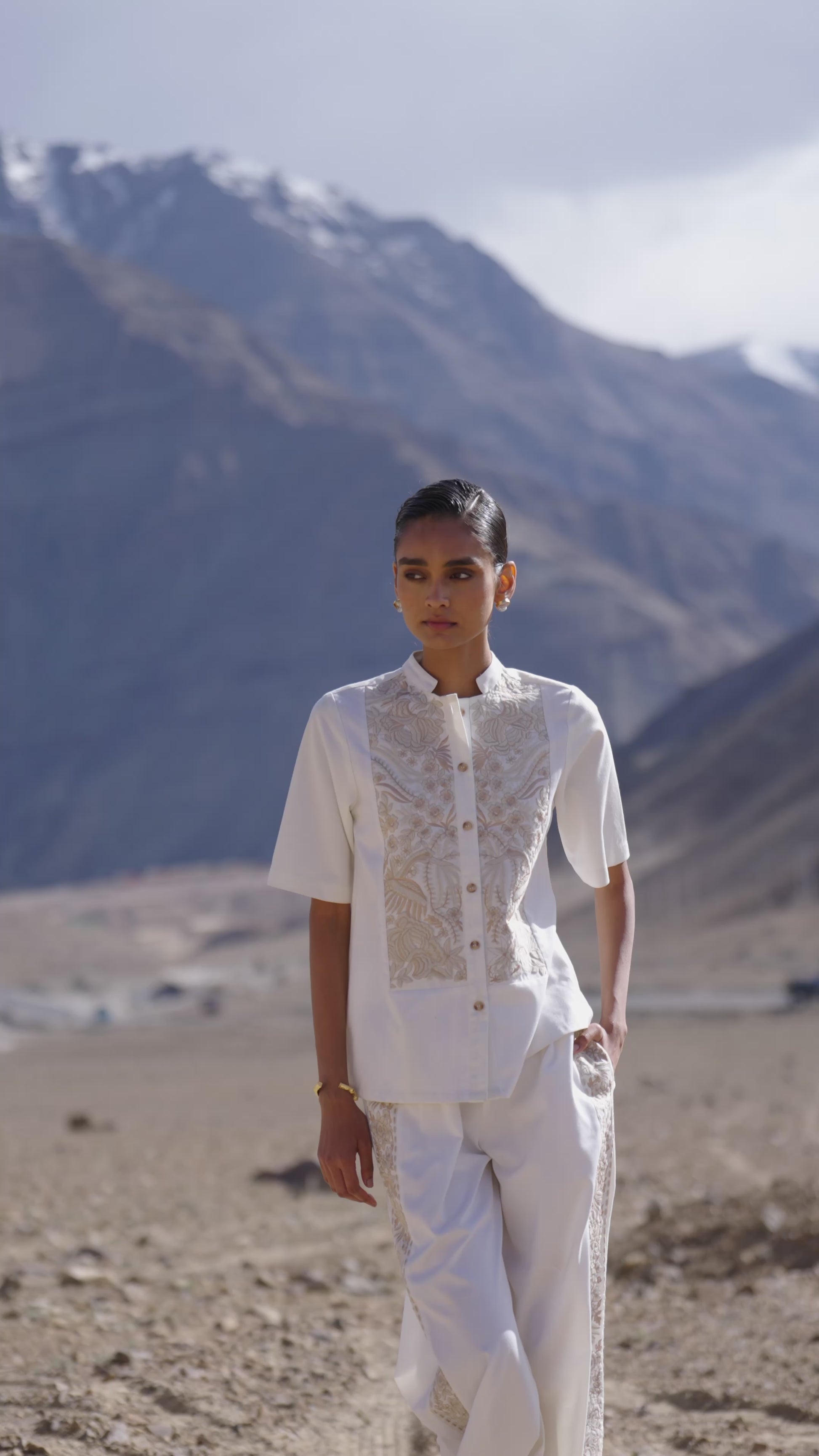 Ivory culottes with Gara stitch inspired embroidery detaling down the sides. Elasticated at the waist. Made in all weather suiting material.  Pockets in the sides.