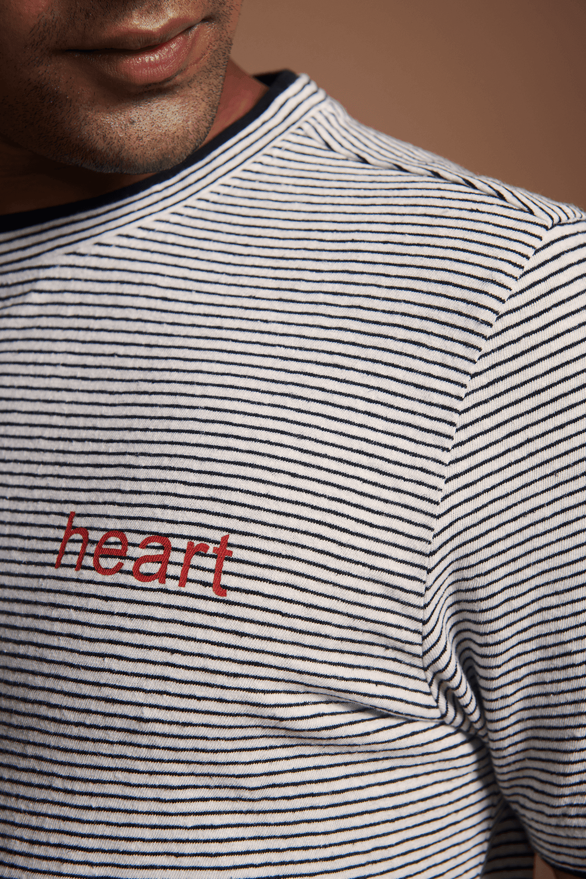 Basic crew neck striped tee with contrast 'heart' print.Sustainably sourced hemp/cotton blend.