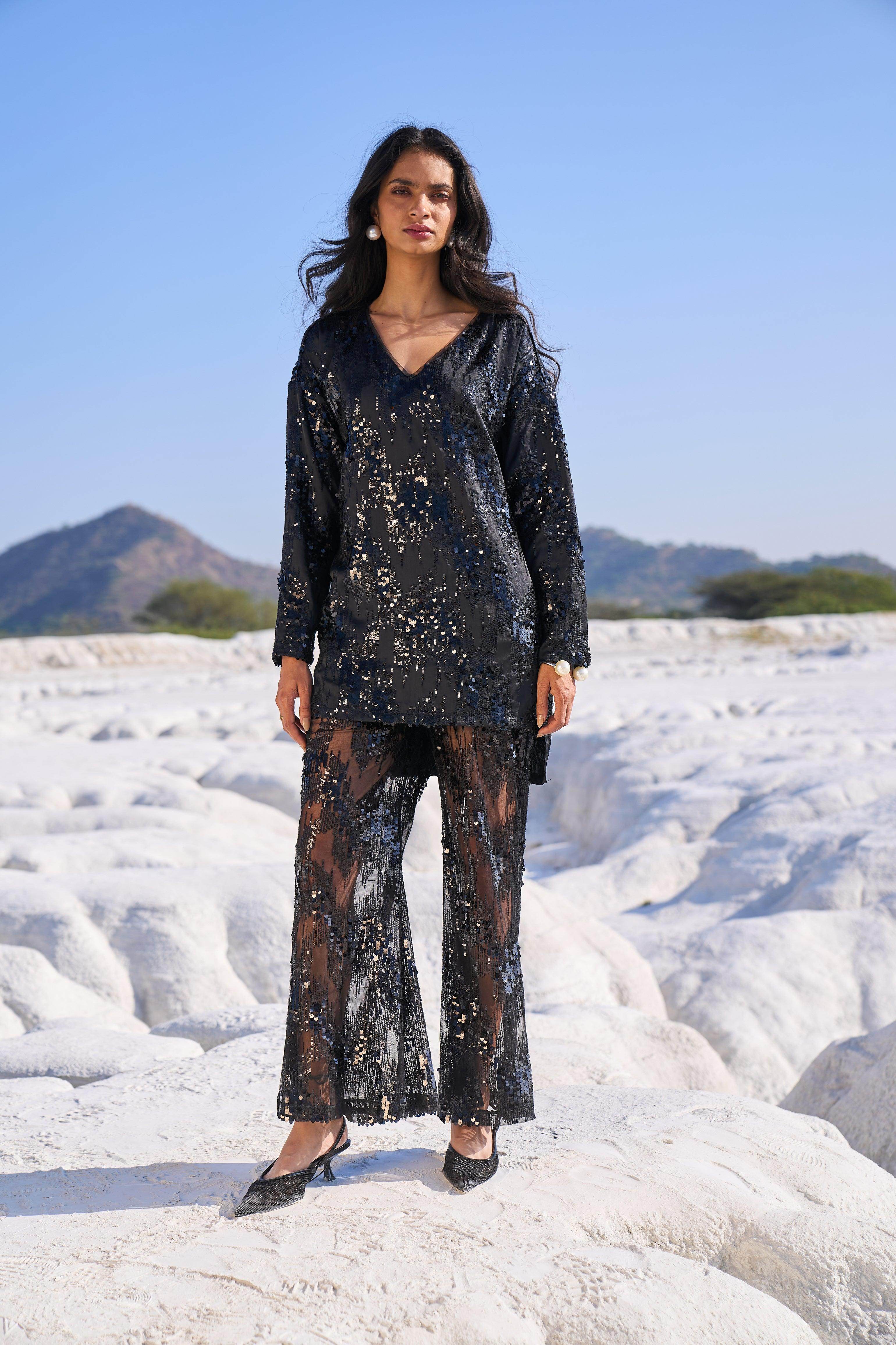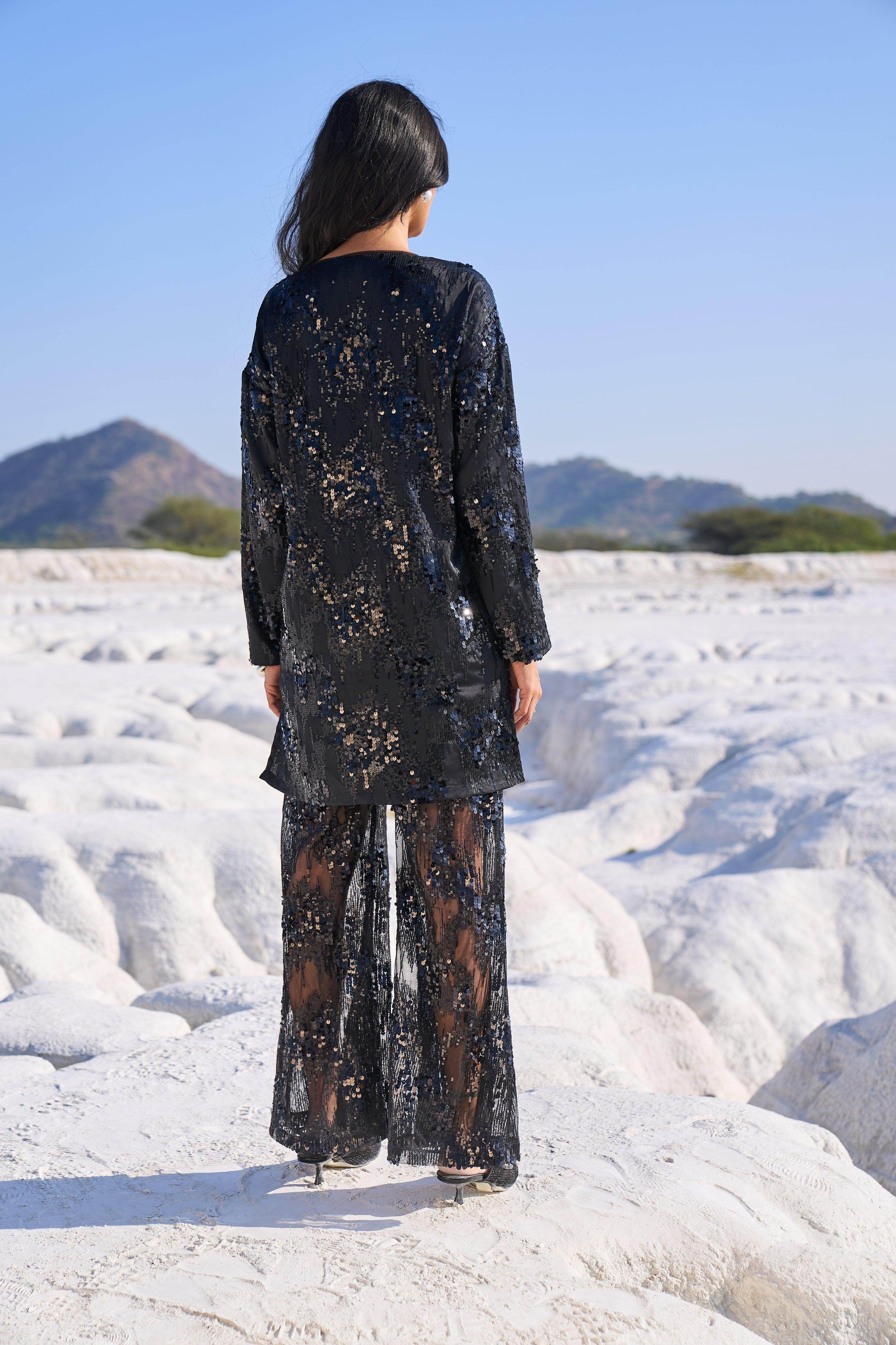 Black paillette and sequin embroidery on tonal satin shirt dress. Popover V-neck with full sleeves. High/low hem. Relaxed fit.
