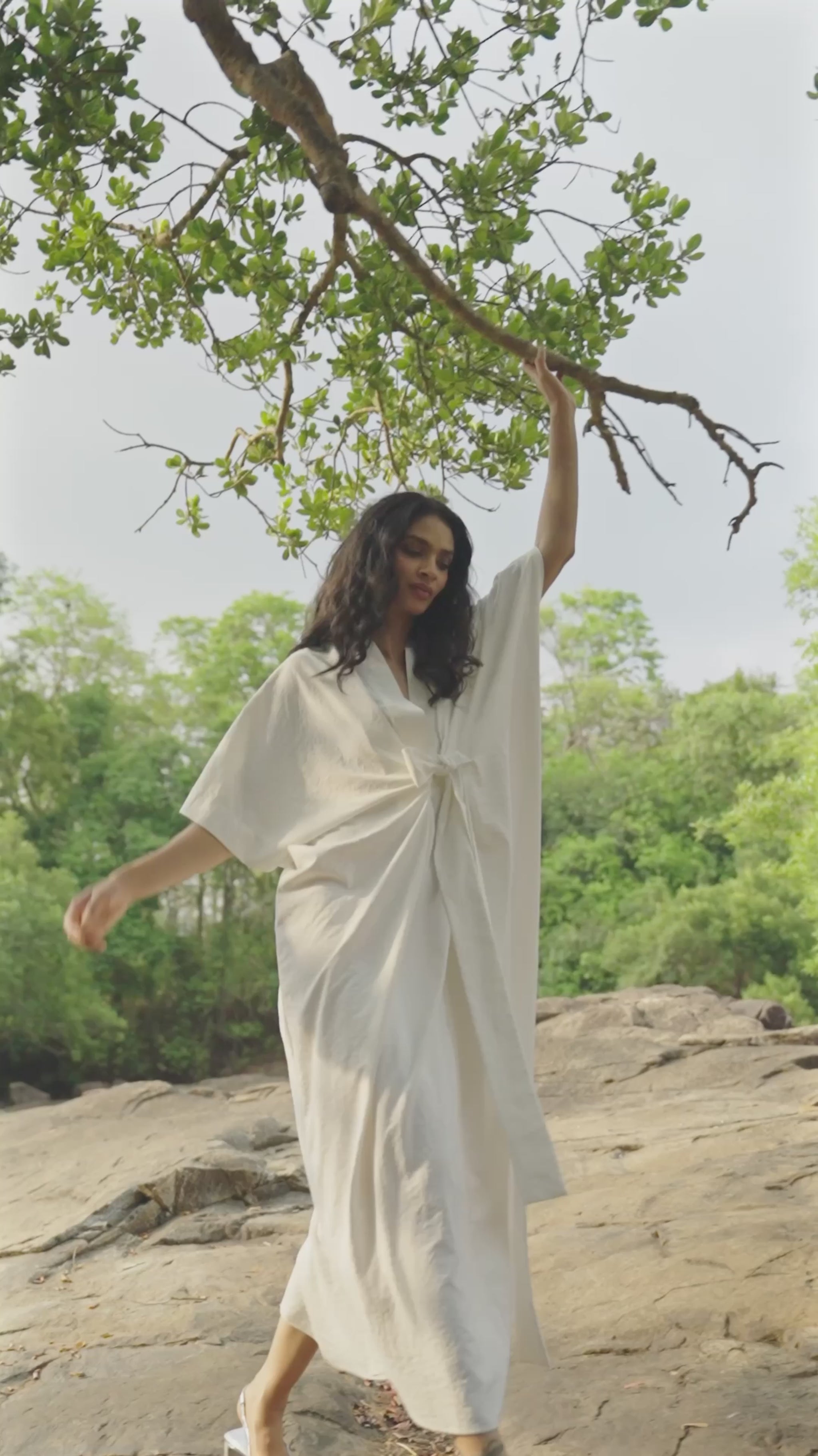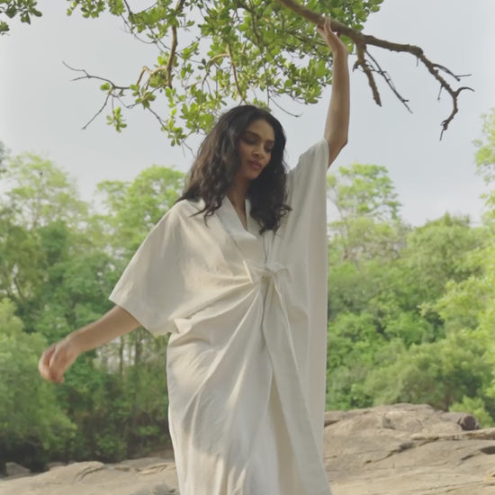 Ivory kaftan dress with a V-neckline and fluid, drop shoulder sleeves. Tie knot detail at the front. Hand applied pleats in the front and back add a flattering shape as the dress tapers toward the hem.