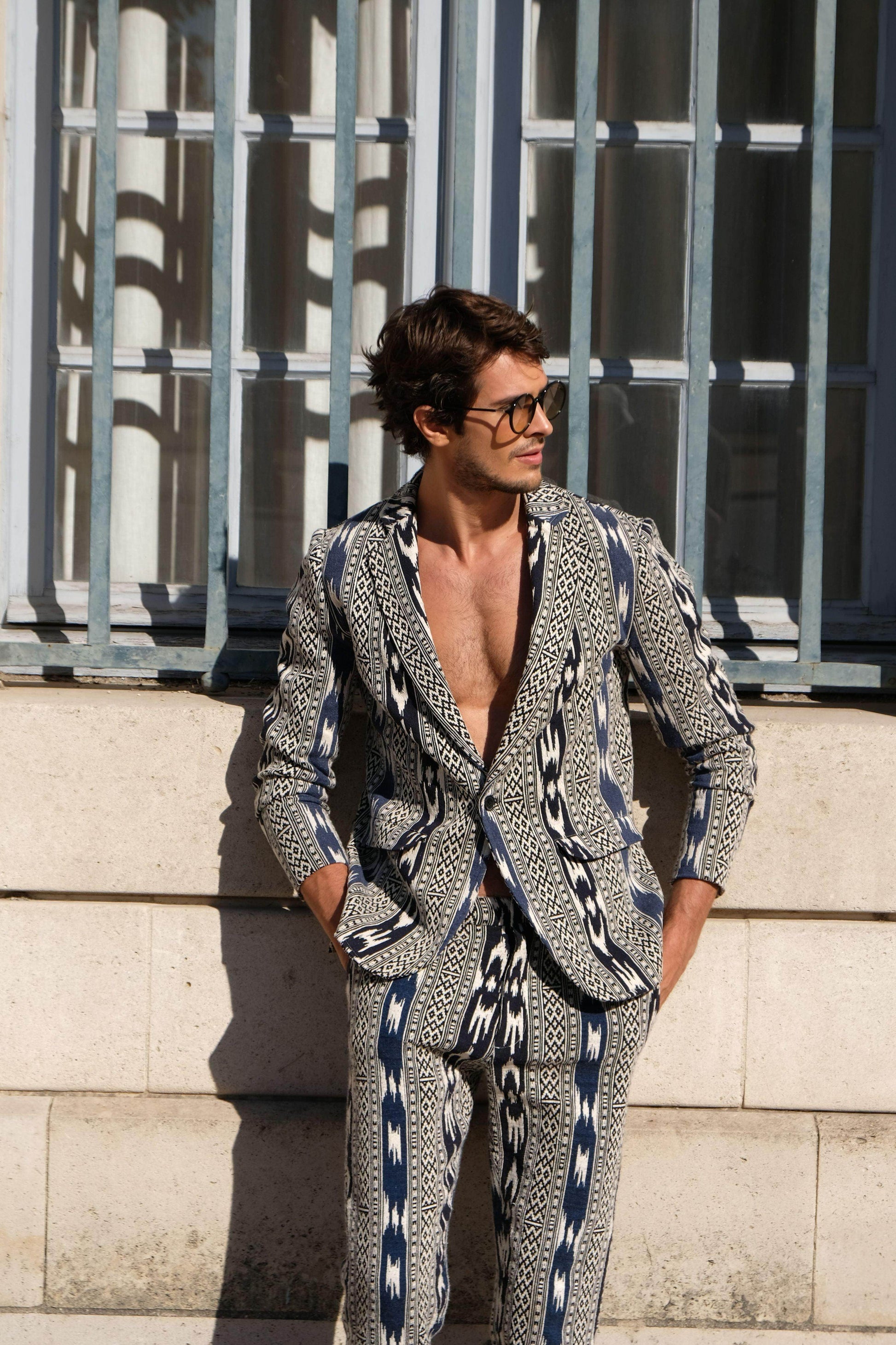 Blazer jacket in ikkat-inspired patterns in jacquard fabric. Lapels and pockets at the front. Paired with matching pants. Pockets in the side and back. Zip closure at the front, belt loops.