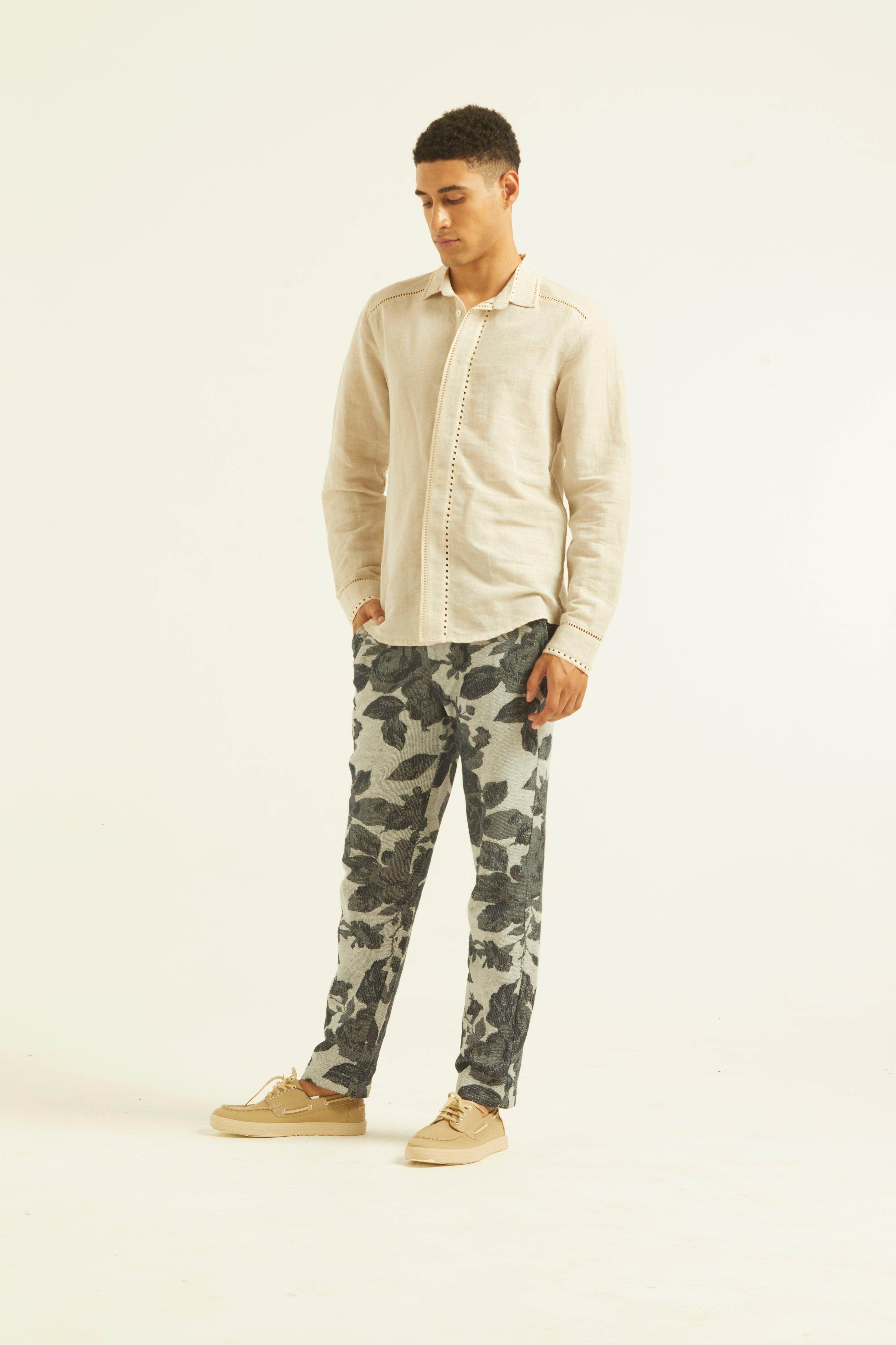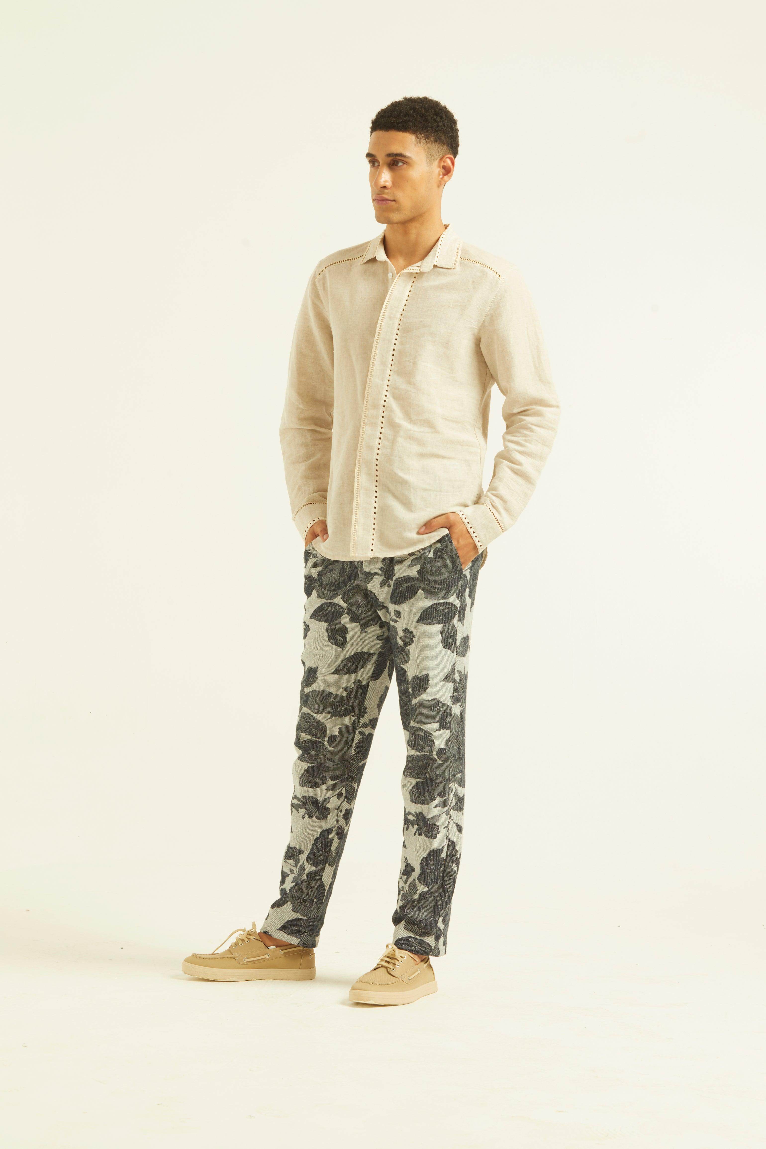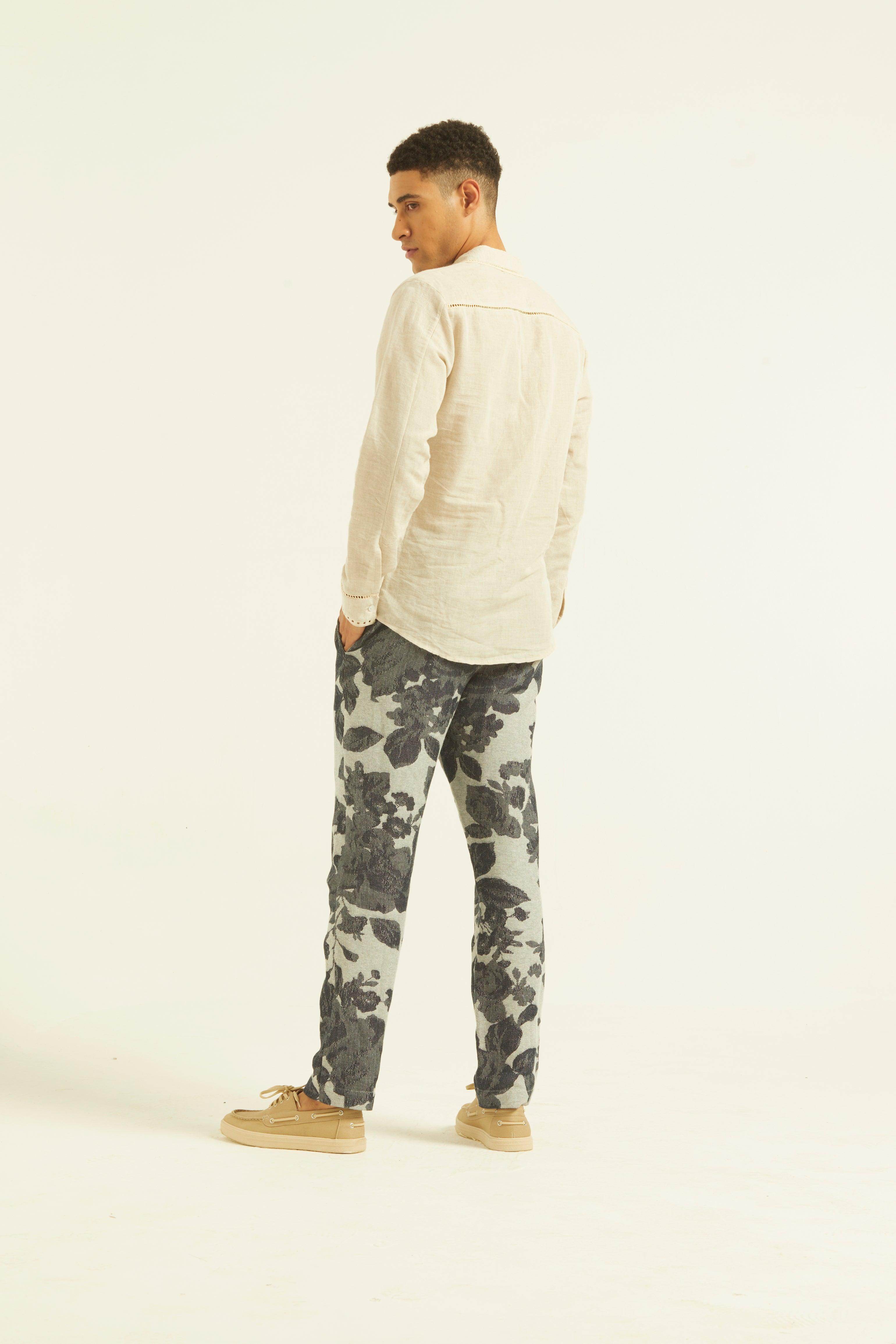 Straight cut pants in an allover tonal floral jacquard design. Pockets in the side. Zip fly.