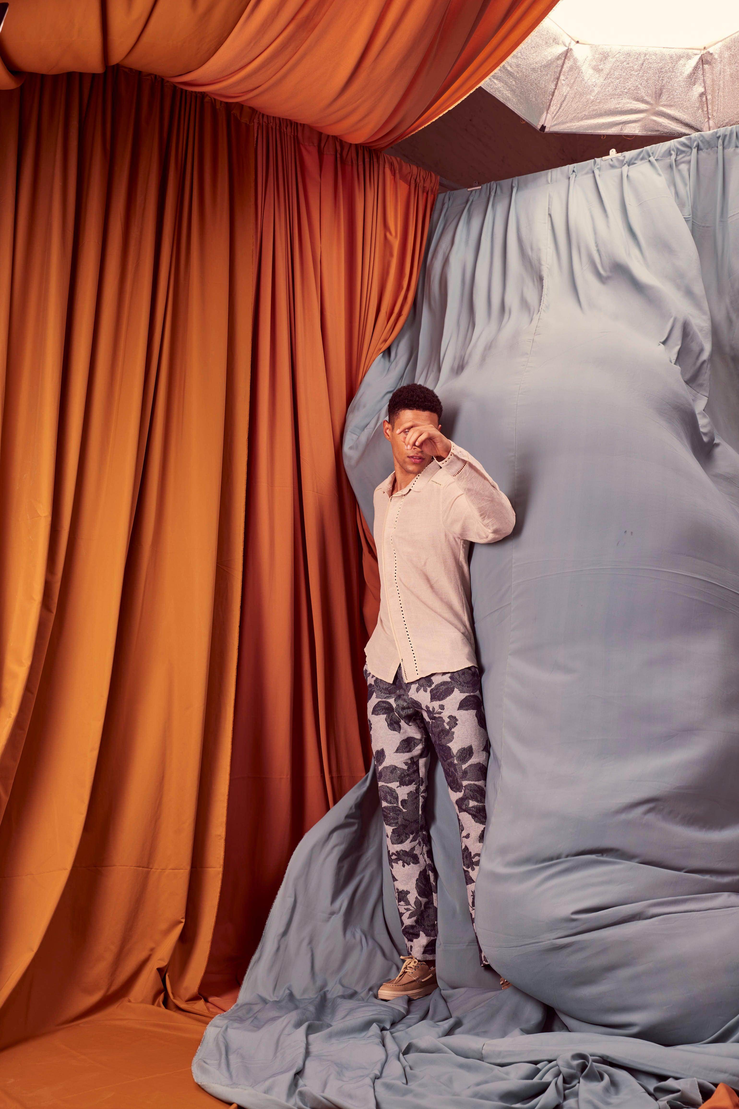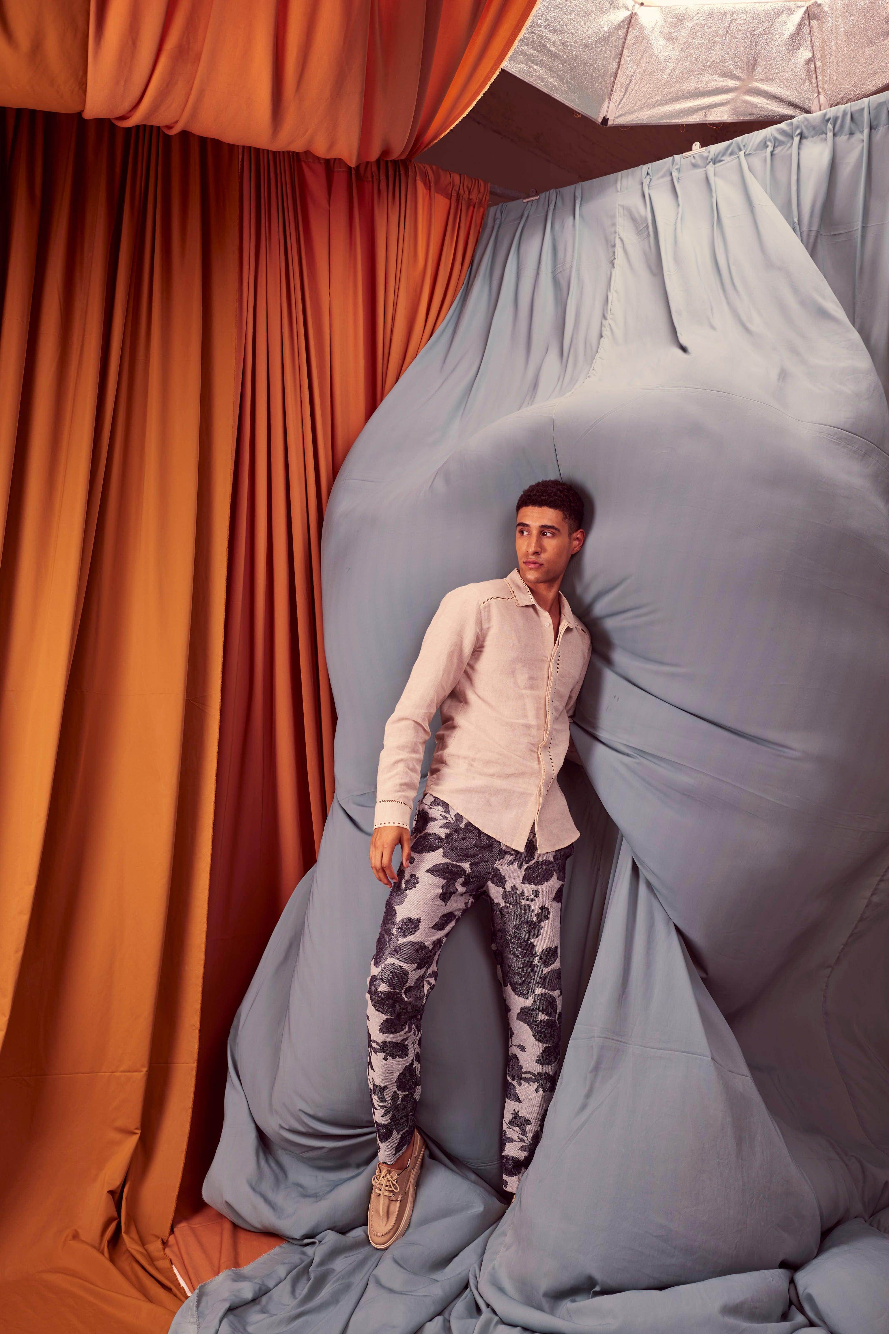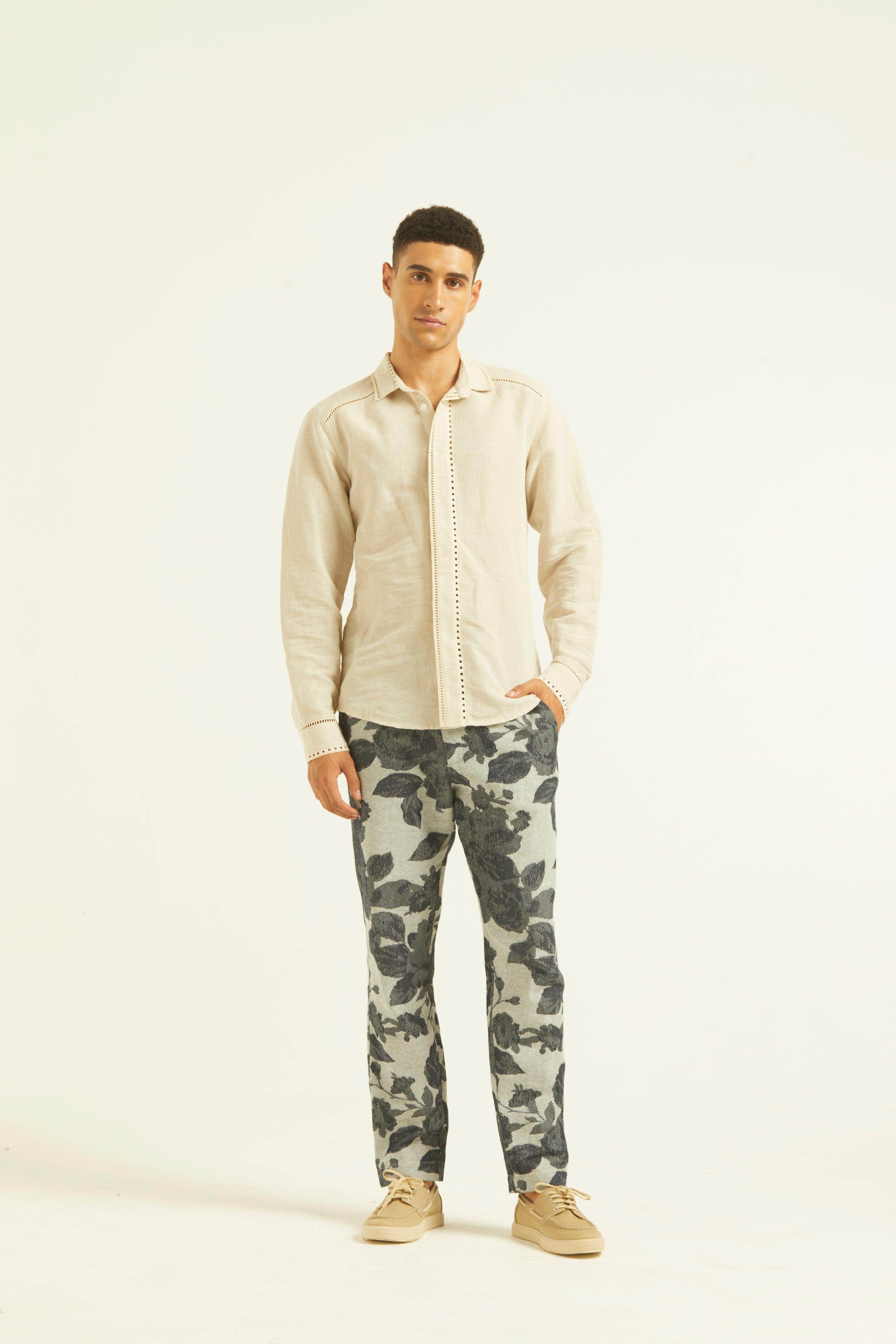 Straight cut pants in an allover tonal floral jacquard design. Pockets in the side. Zip fly.
