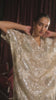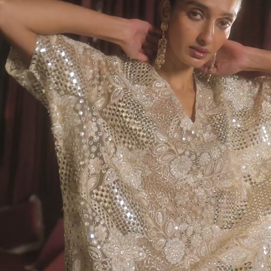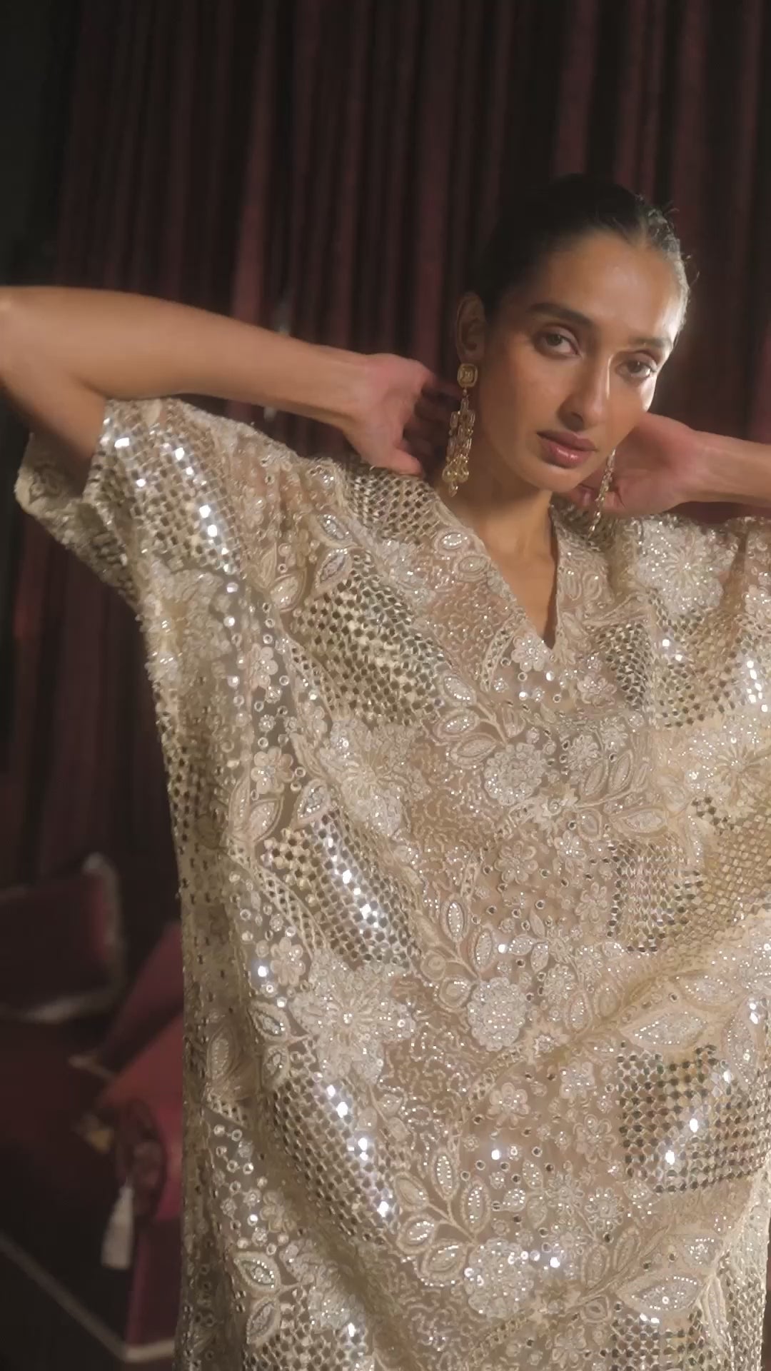 Maxi kaftan in champagne tones with delicate placement embroidery in floral and geometric motifs. Embellished with thread, sequin, bead, and mirror work. Dolman cut sleeves and V-neckline. Thread motifs highlighted with hand-applied sequins and beads, interspersed with geometric mirror detailing. Slits in the sides. Comes with a slip. A statement kaftan ideal for cocktails, dinners, and galas.
