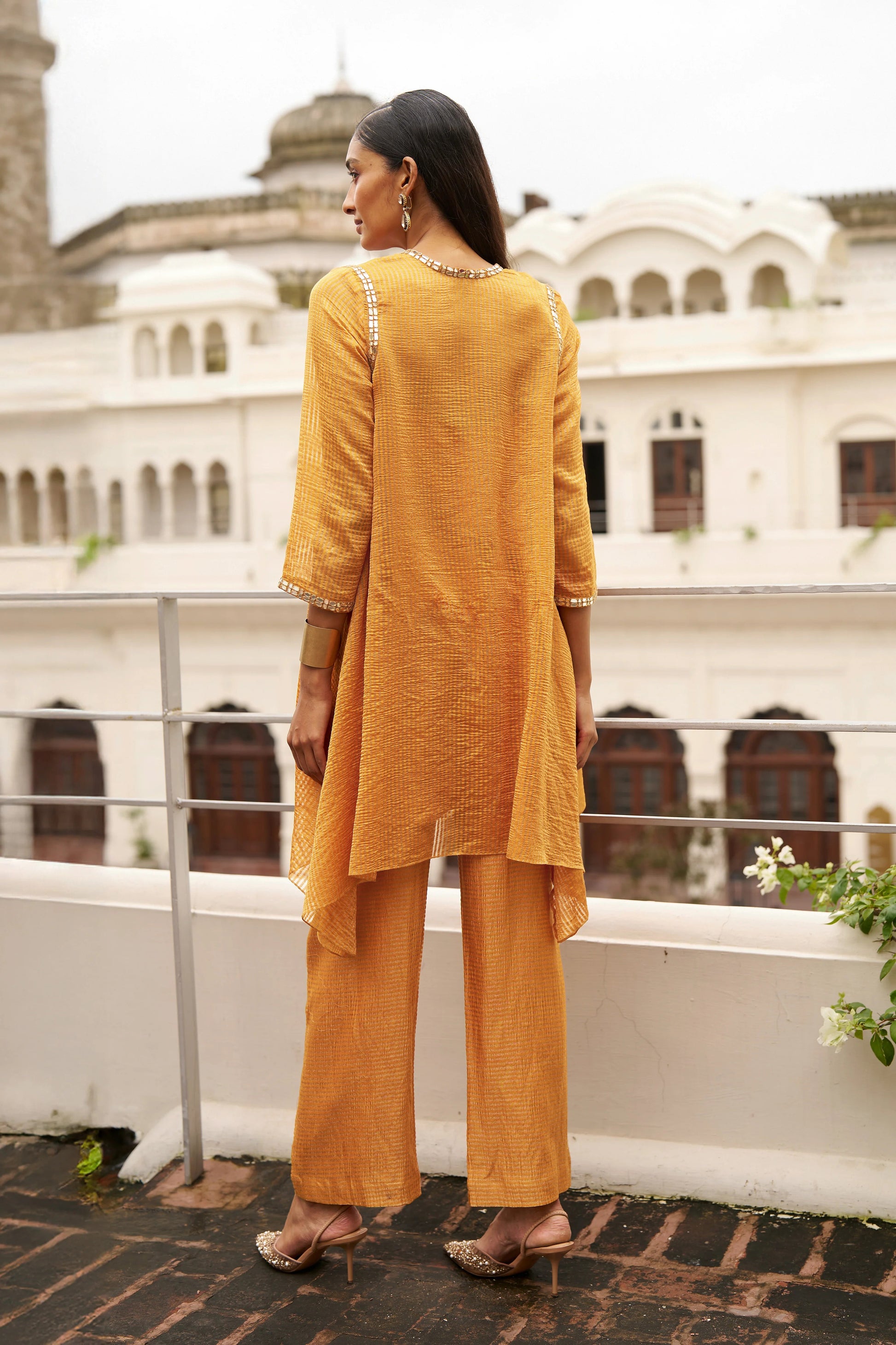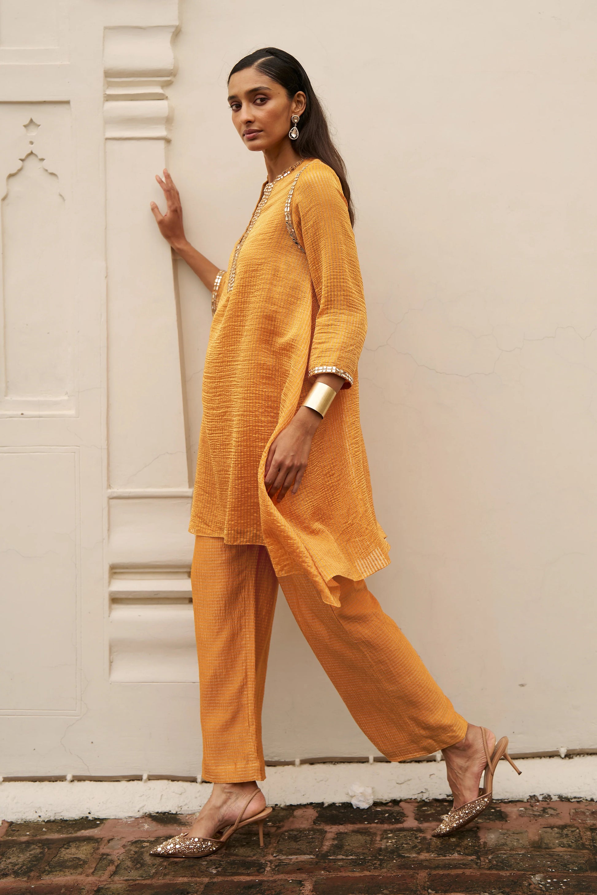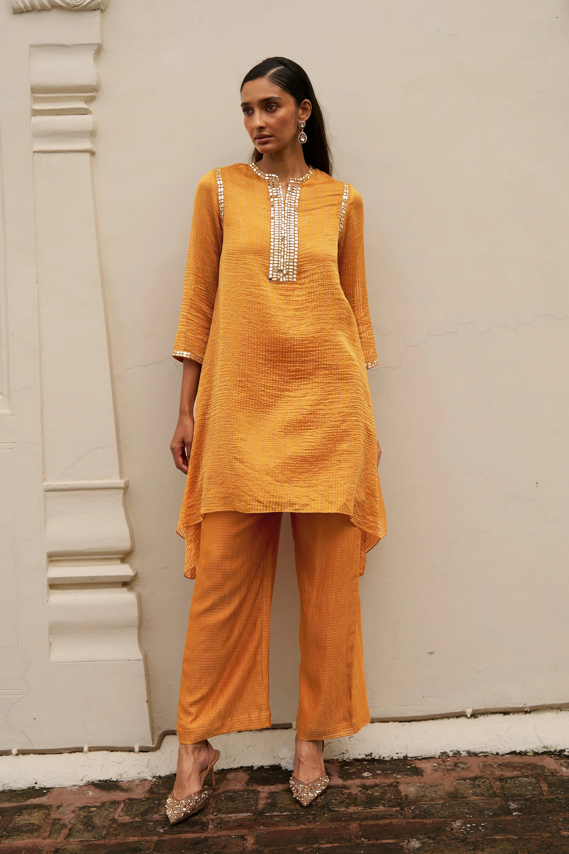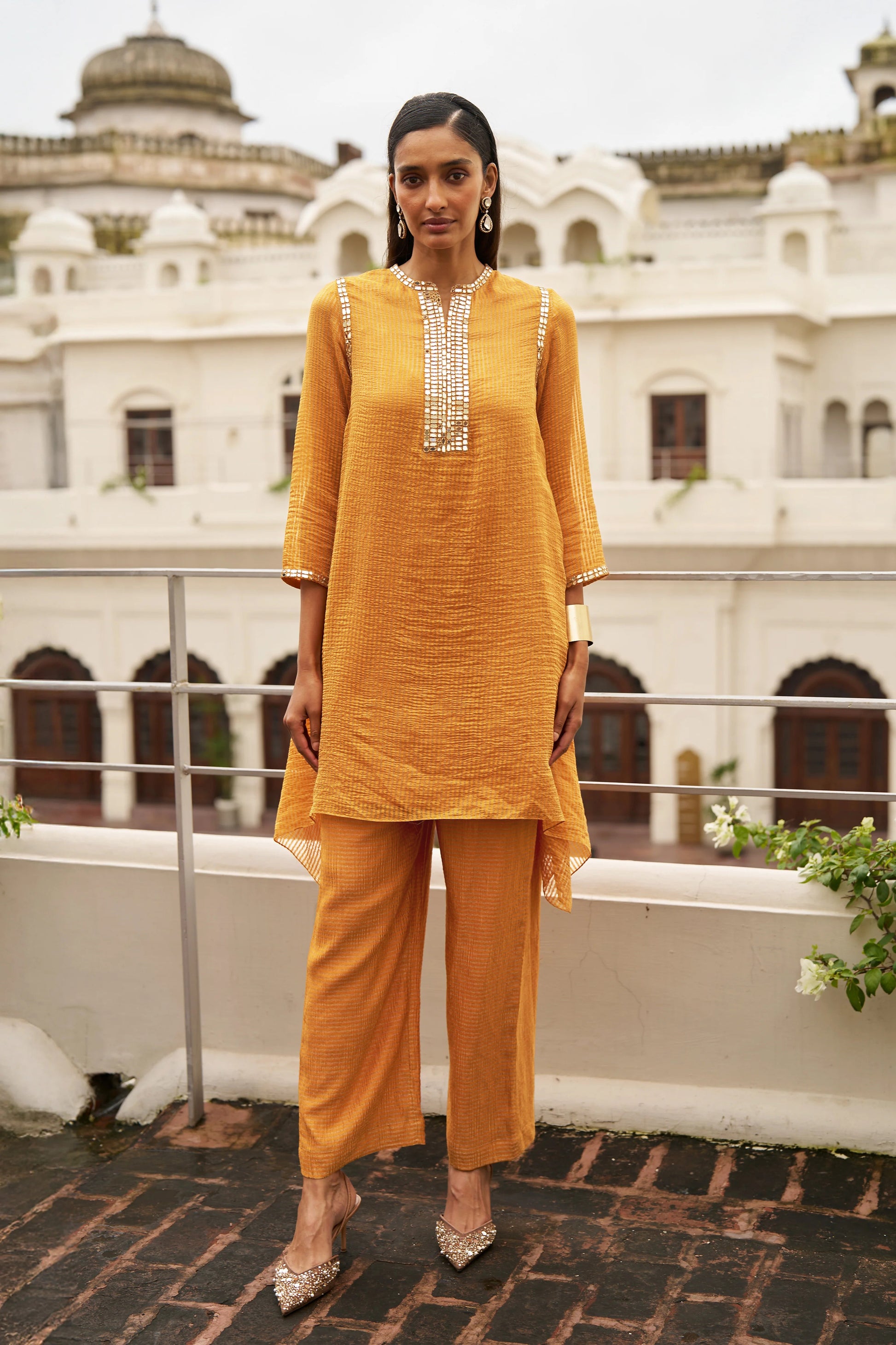 Relaxed fit longline popover top in crinkled gold stripe tissue fabric. Hand-applied mirror work embroidery placed along the front, neckline, and armholes. Slight A-line cut with a cutaway hem for added movement. Concealed placket with hook/eye closure. Made in lightweight organic viscose. Comes with a slip. Paired with matching straight cut pant. Semi-elasticated waist with a concealed side zip and hook/eye closure. Pockets in the sides. Garment is fully lined.