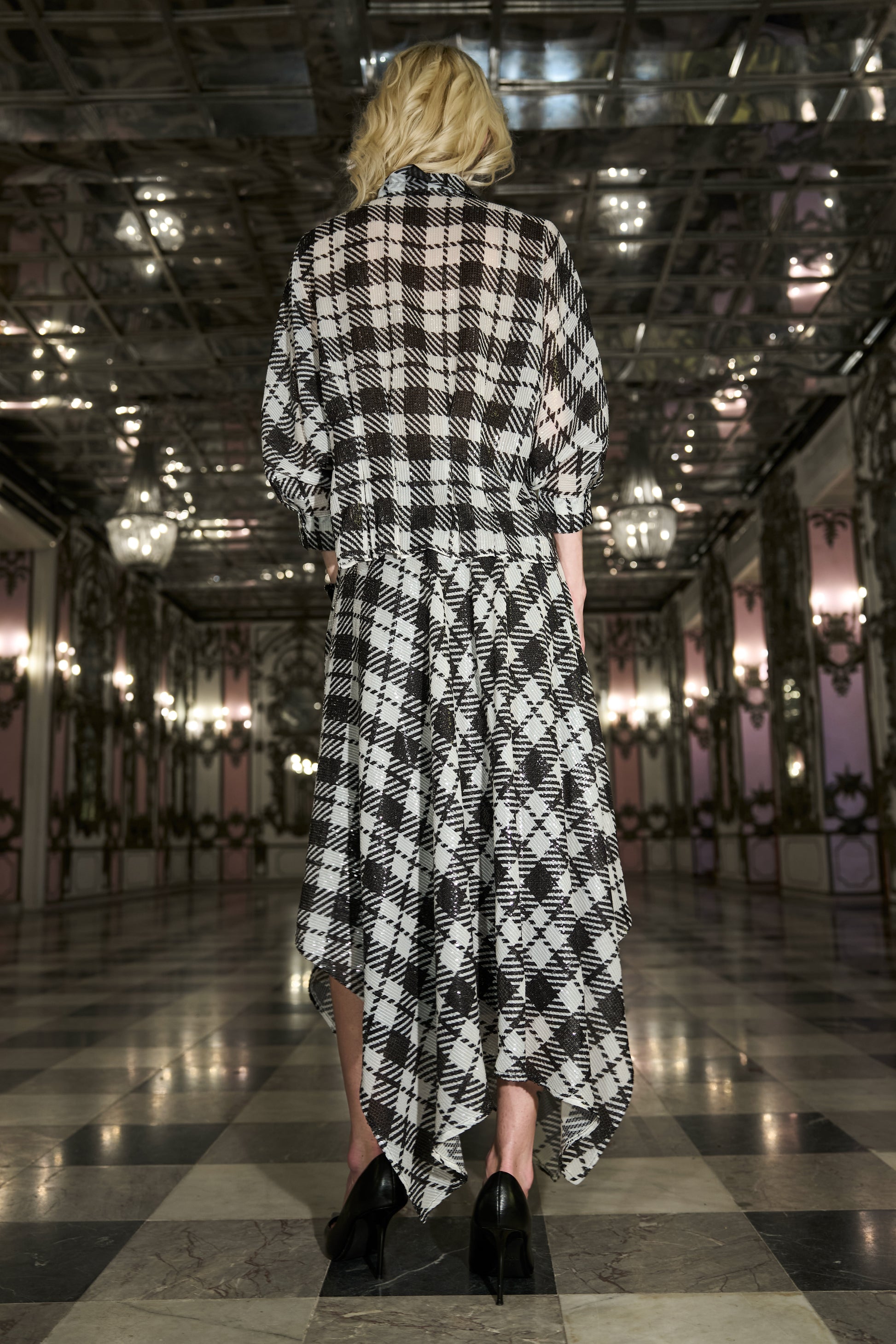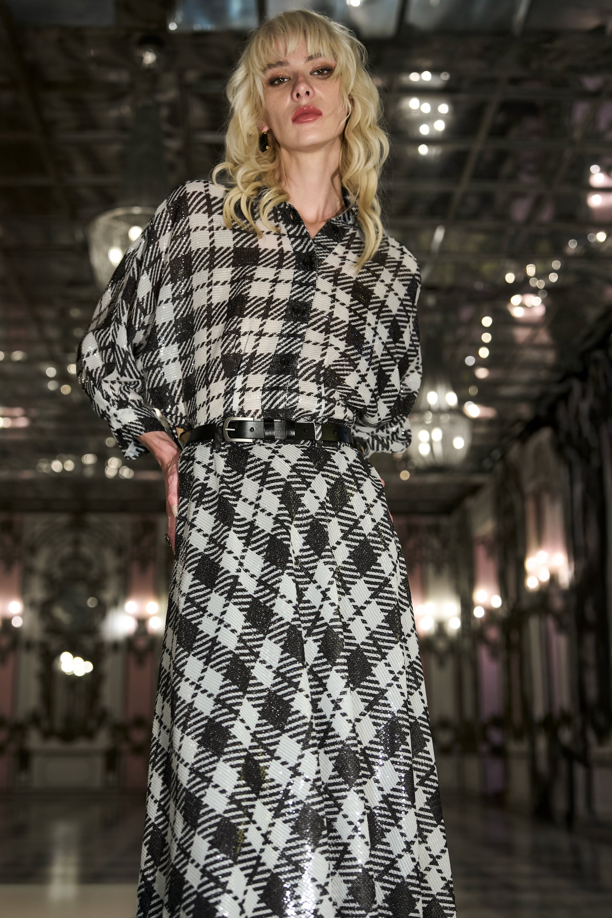 Monochrome tartan sequin shirt. Hand sewn pleats on the front and back add a flattering shape. 3/4th dolman sleeves, button down front with a shirt collar. Crafted from lightweight fabric for an airy, effortless look. Slits in the sides.