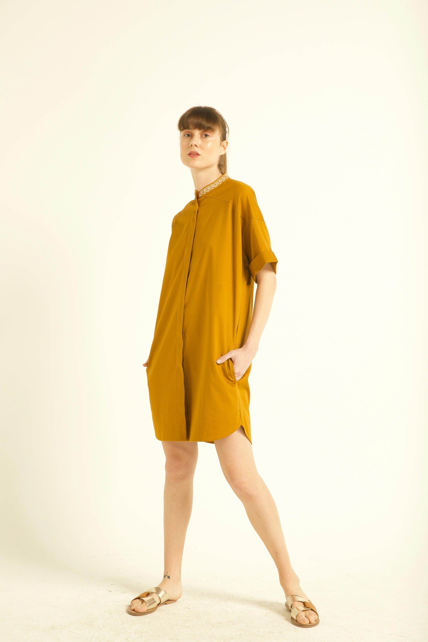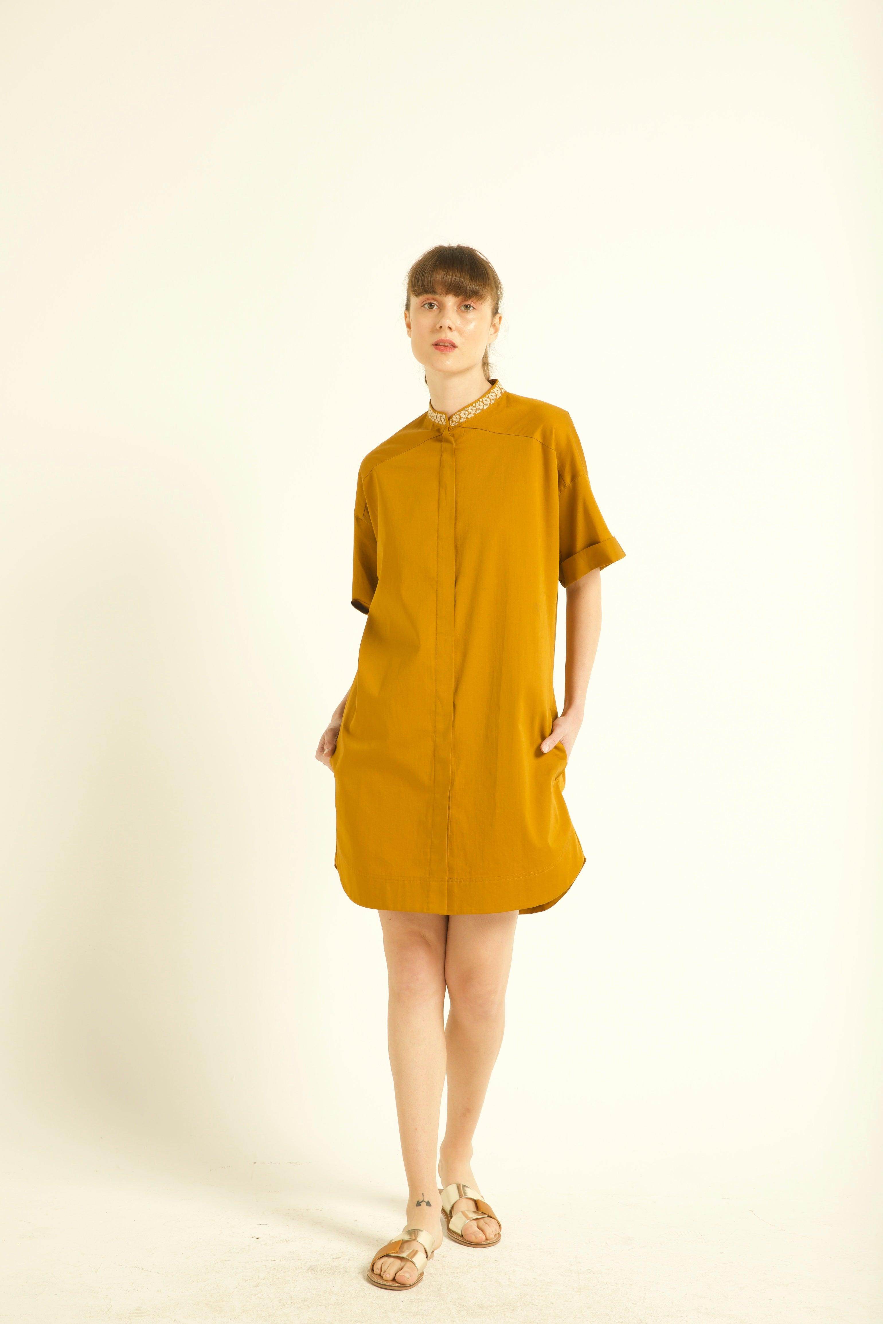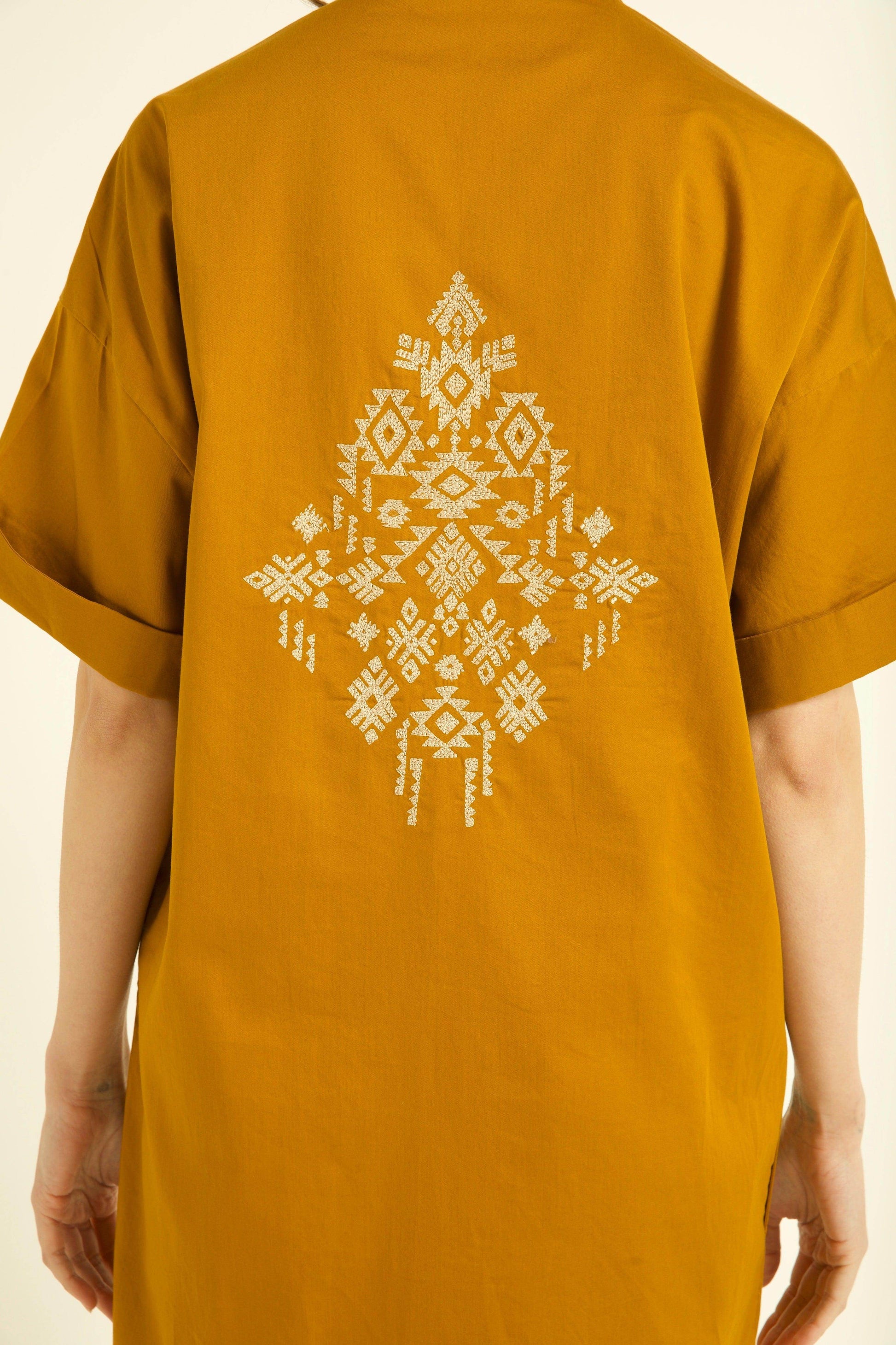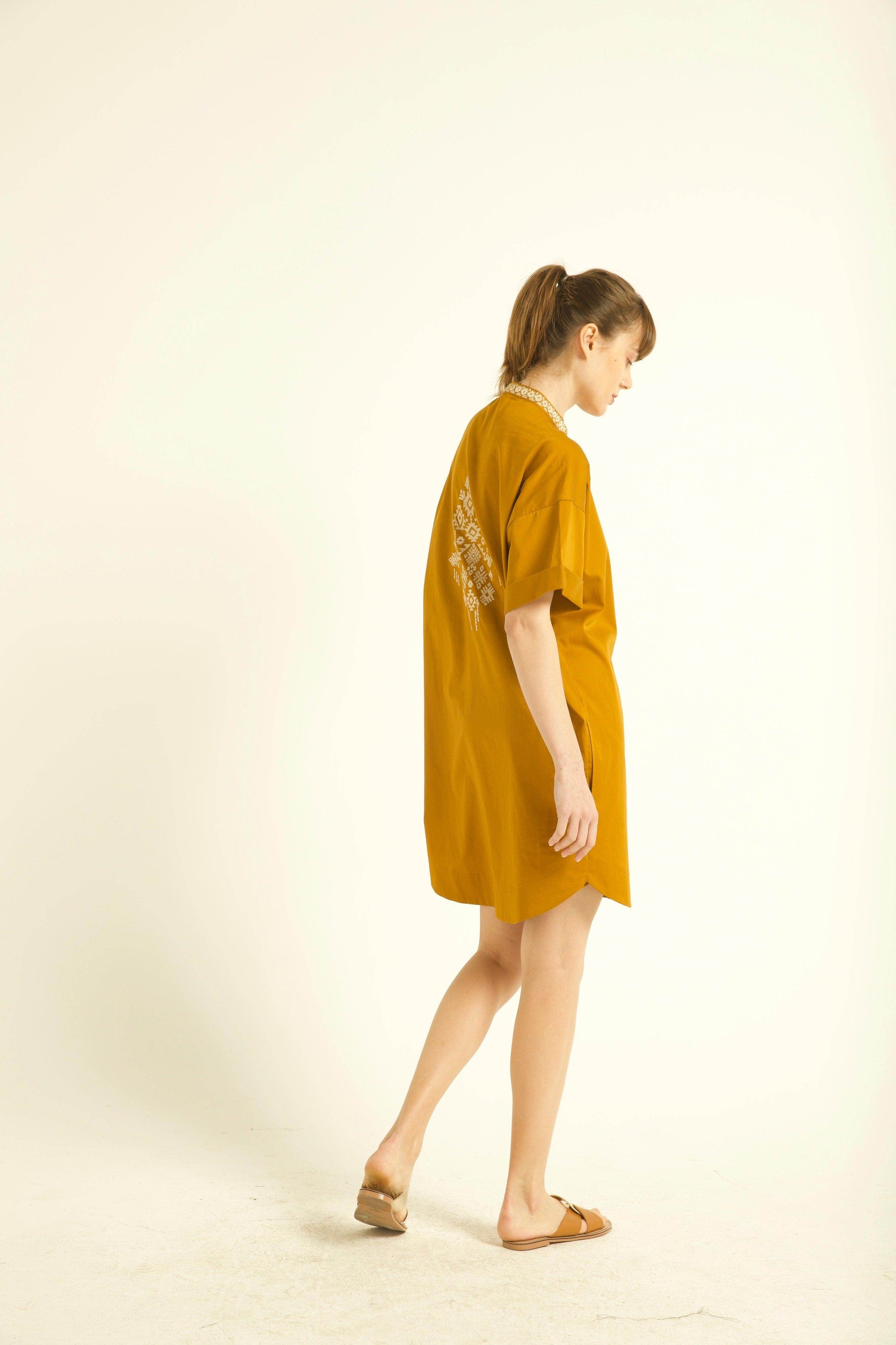 Poplin shirt dress with band collar. Embroidered tribal detailing on the collar and motif in the back. Relaxed fit.