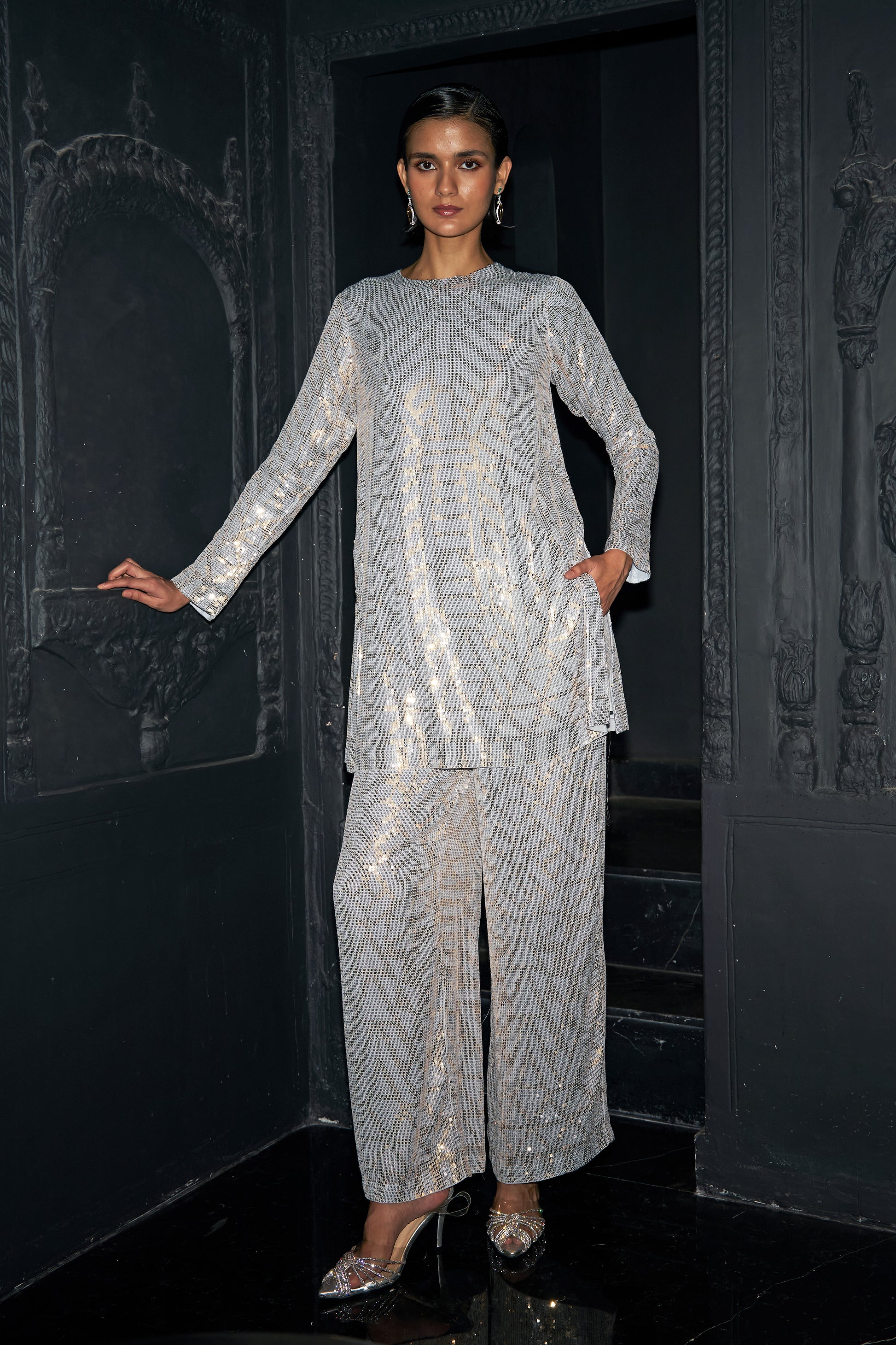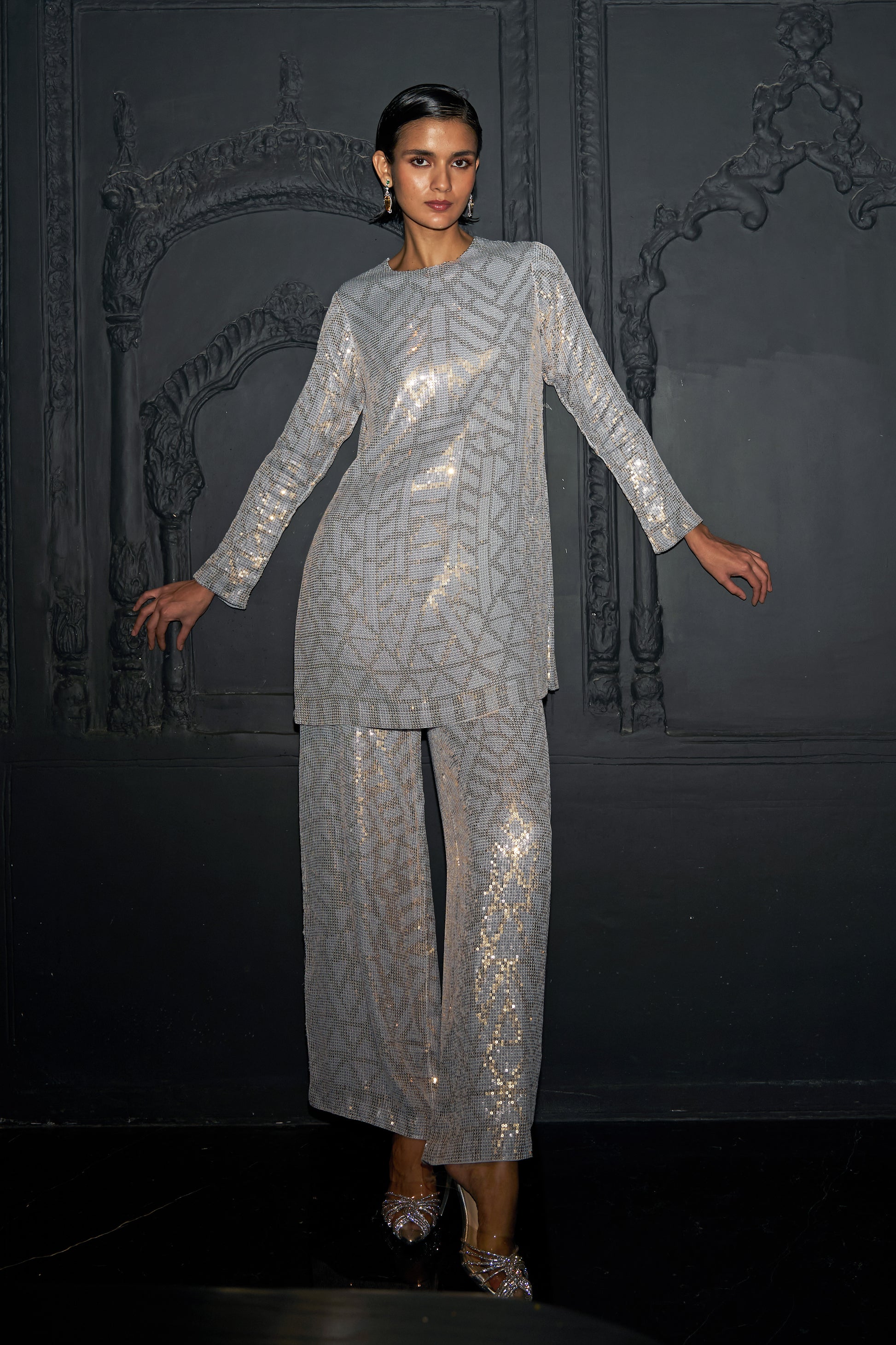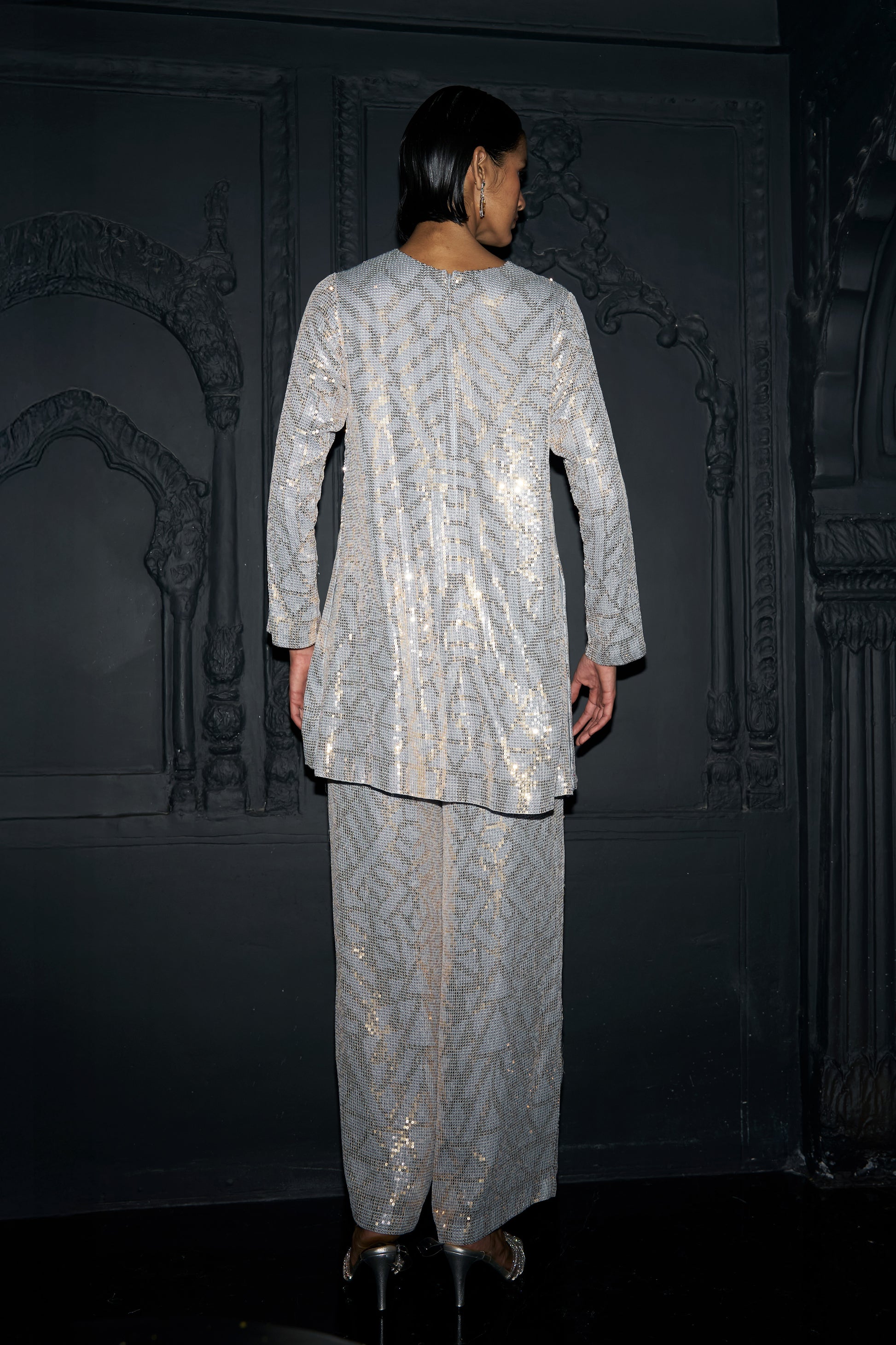 Longline top in a cloud blue base with silver and gold sequins in a precise geometric pattern that shimmers in shifting light. Slight A-line shape with slits in the sides. Round neck and full sleeves. Concealed back zip with hook/eye closure. Garment is fully lined. Paired with matching wide-legged flared pant. The cut flows into a flare that balances structure with movement. Concealed side zip and hook/eye closure. Pockets in the sides. Garment is fully lined.