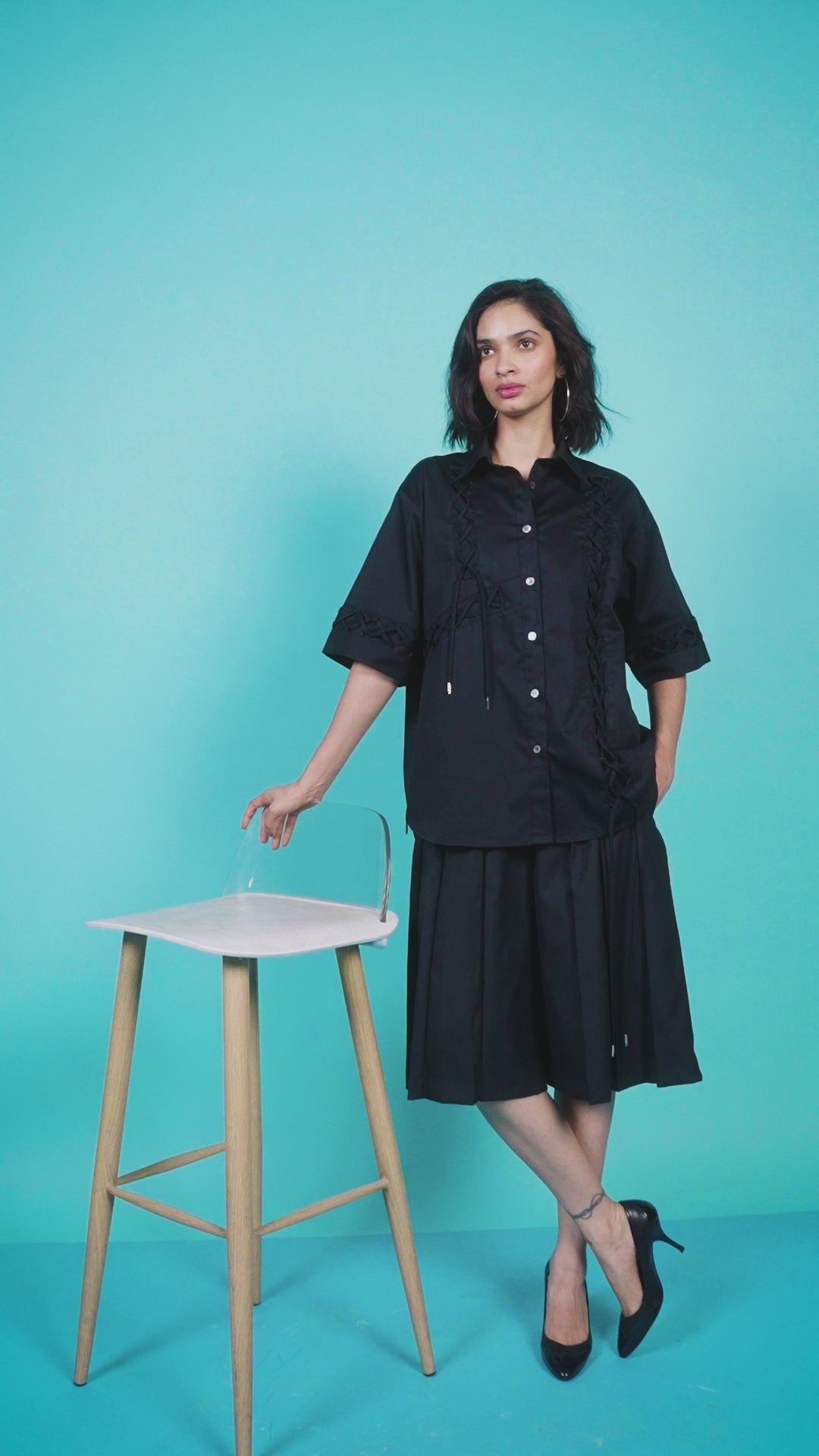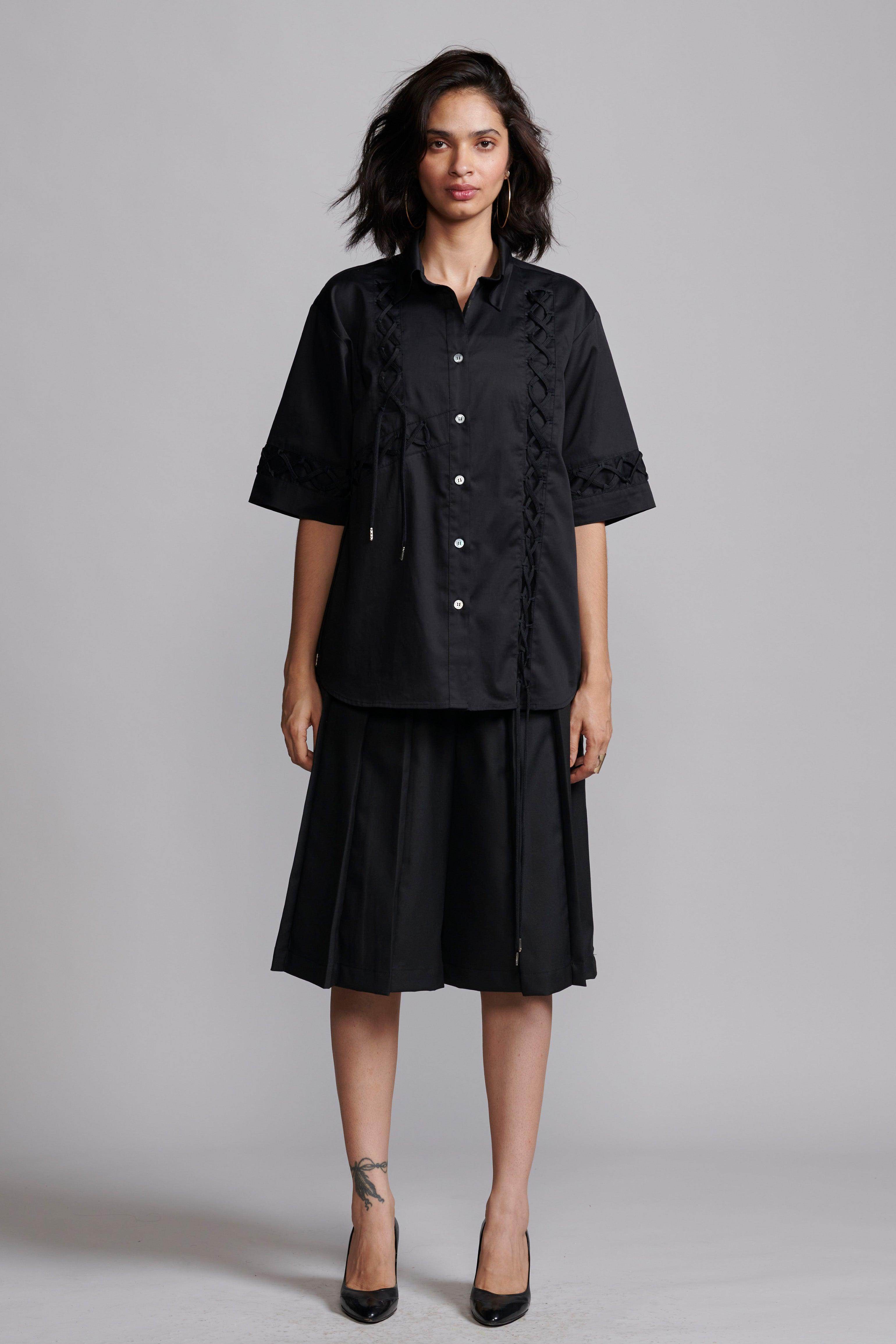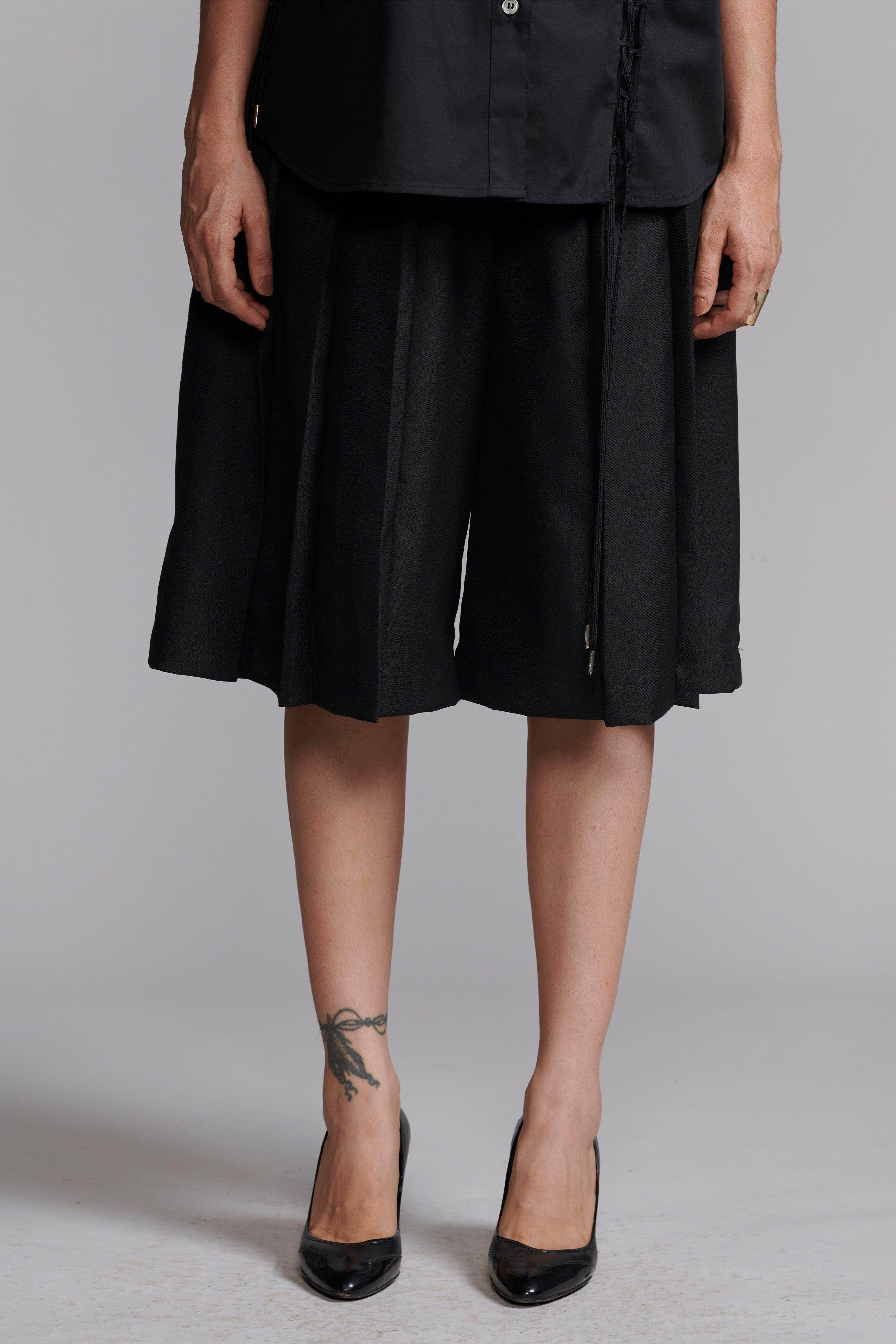 Wide-legged longline shorts with a flared hem. Hand-sewn pleats at the waist create a skirt-like appearance. Semi-elasticated waistband with belt loops. Side and back pockets. Made of all-weather suiting material.
