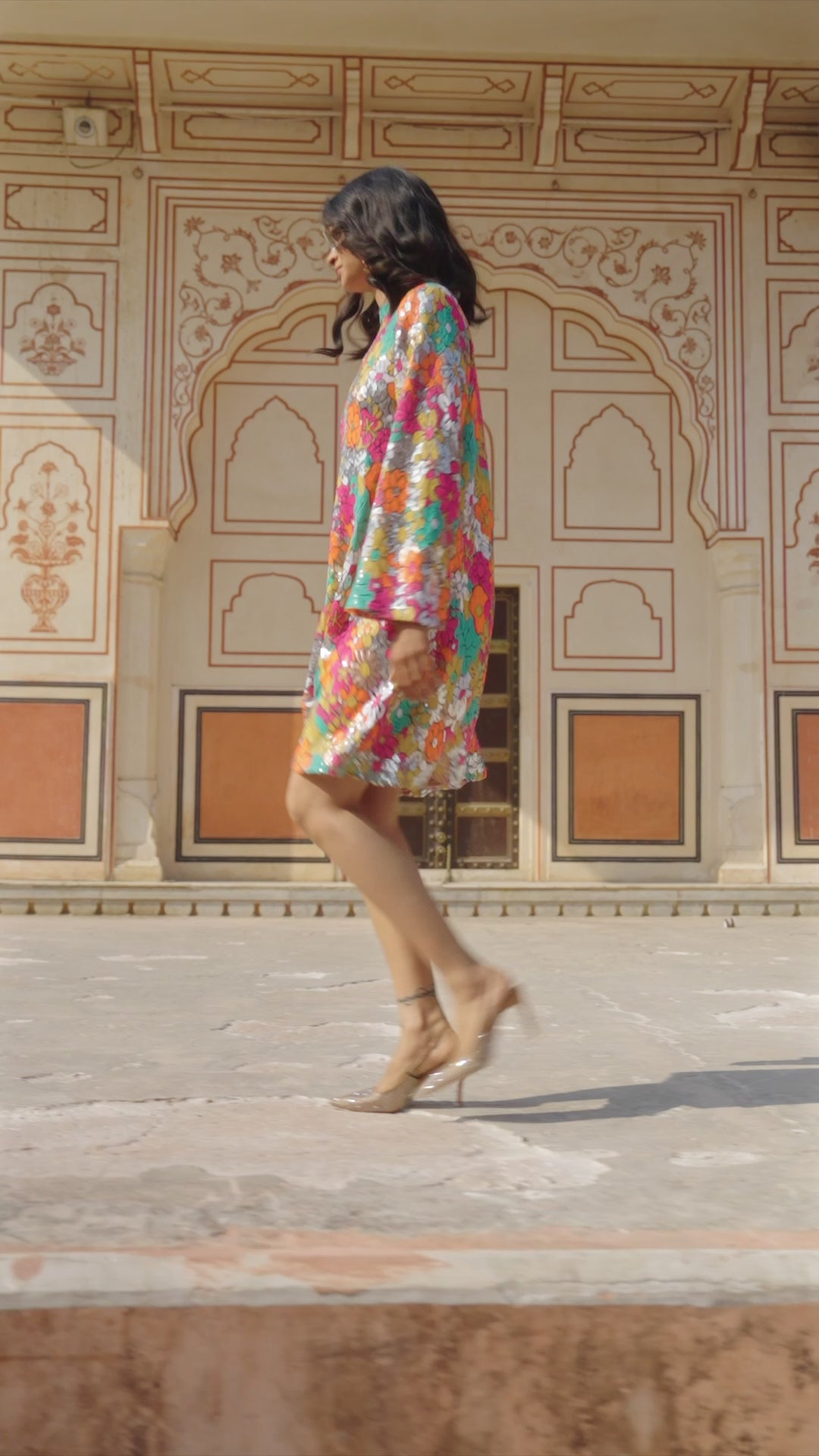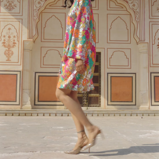 Floral patterned multi sequin mini dress. A line shape with flared sleeves. Band collar. Garment is fully lined.
