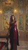 Ruby red square sequin embroidered drapy gown in a relaxed fit-and-flare silhouette. Slender shoulder straps and a free flowing pleated panel with wraps around the waist and over the shoulder in a sari-inspired drape detail. The surface shimmers in deep ruby tones, adding richness and depth to the colour with every movement. Concealed zip closure at the center back. Slit in the side. Garment is fully lined.