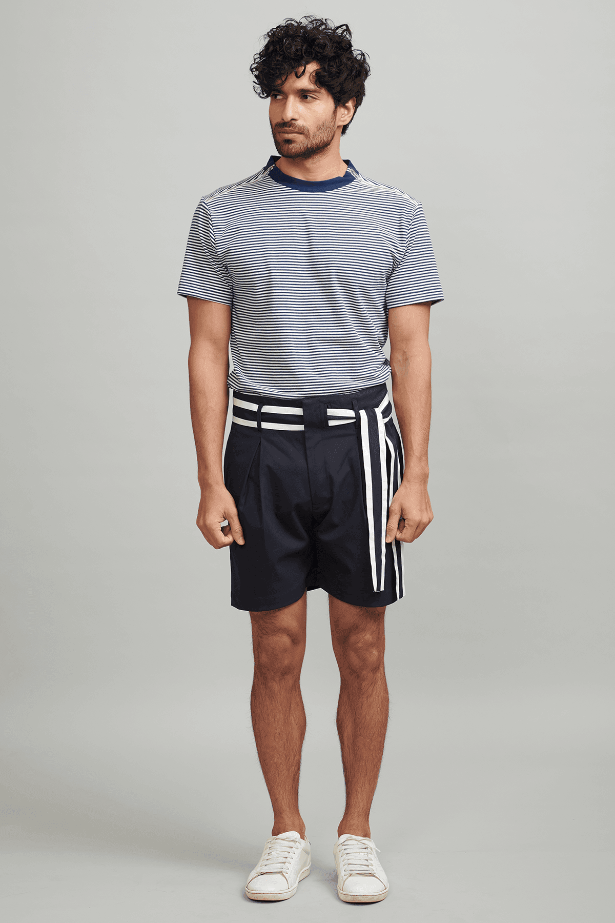 Straight legged shorts in navy blue all-weather fabric. White and Navy color blocked tie-up belt at the waist. Pleats in the front. Pockets on the side and back.