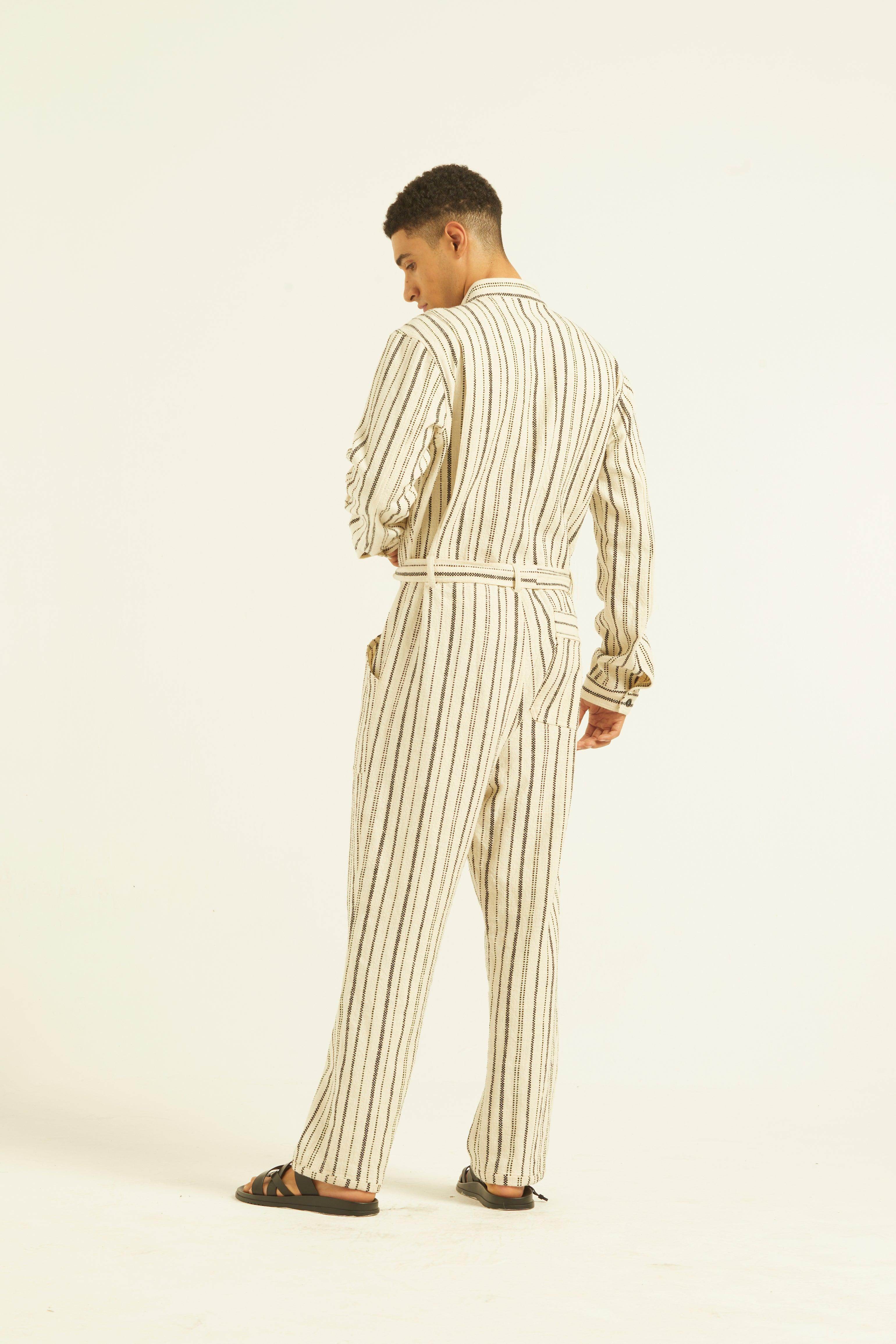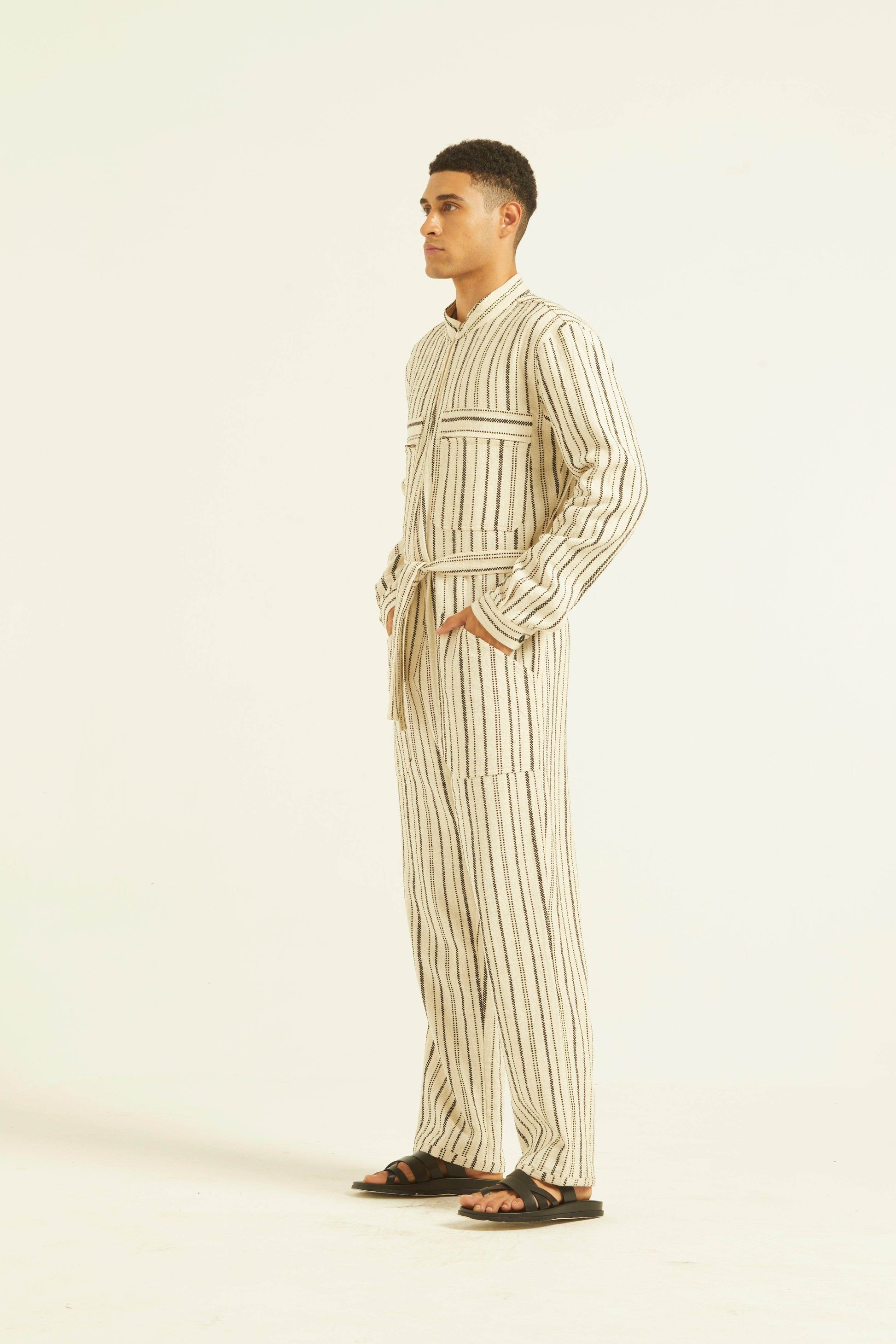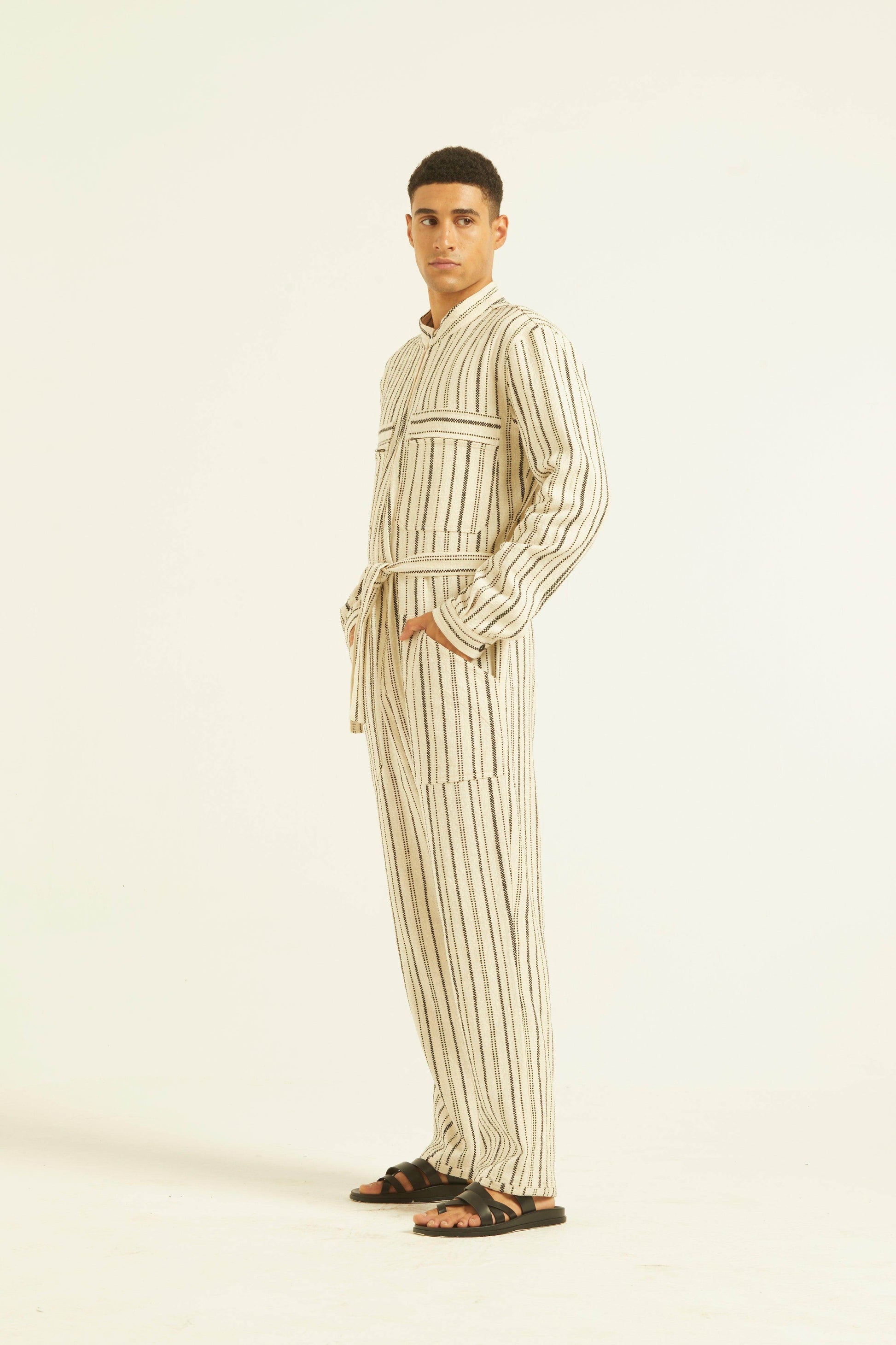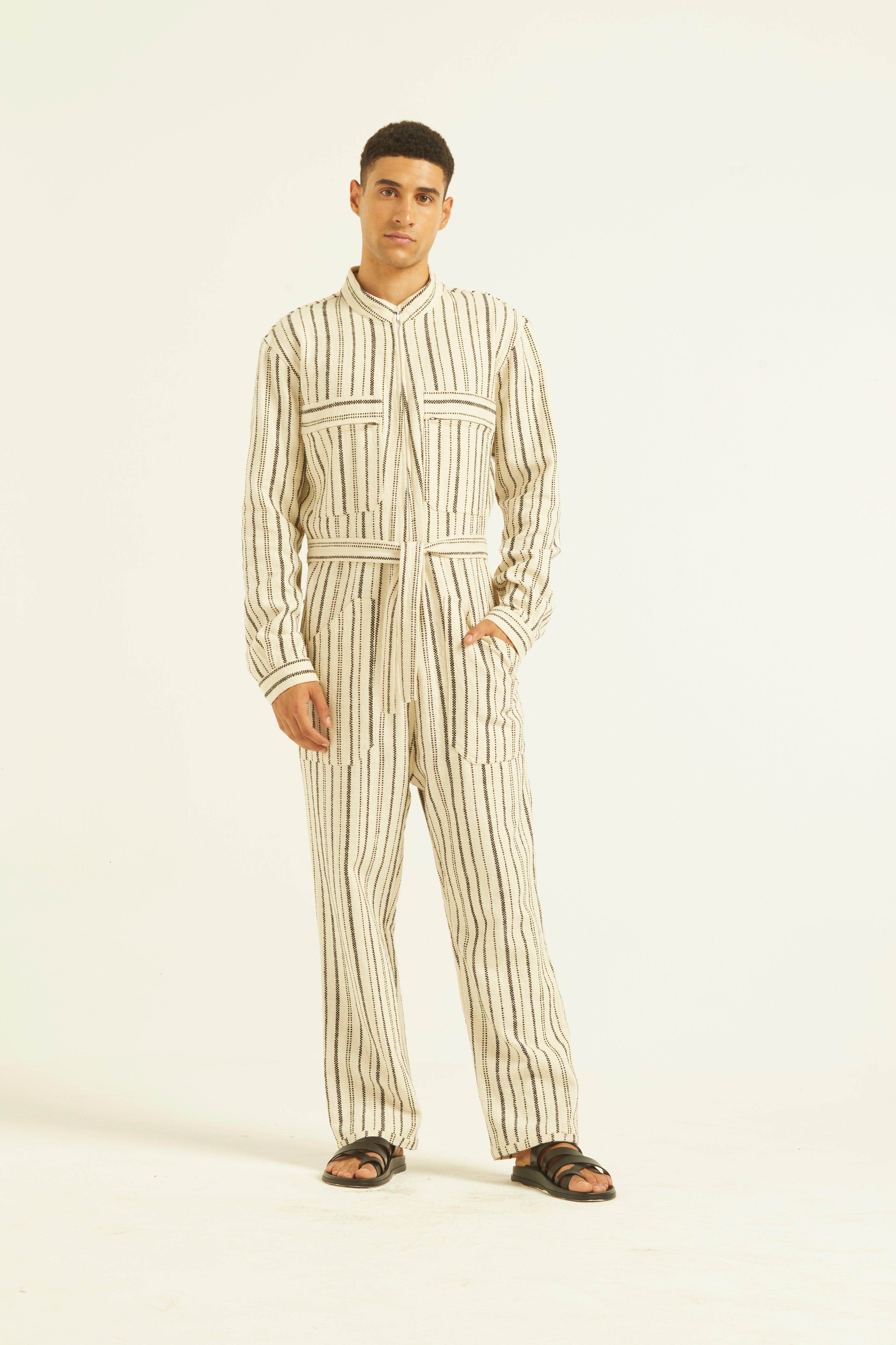 Ivory/Black stripe full sleeve cotton jumpsuit with a zip front opening. Pockets on the front chest and side. Tie up around the waist with belt loops. Relaxed fit.