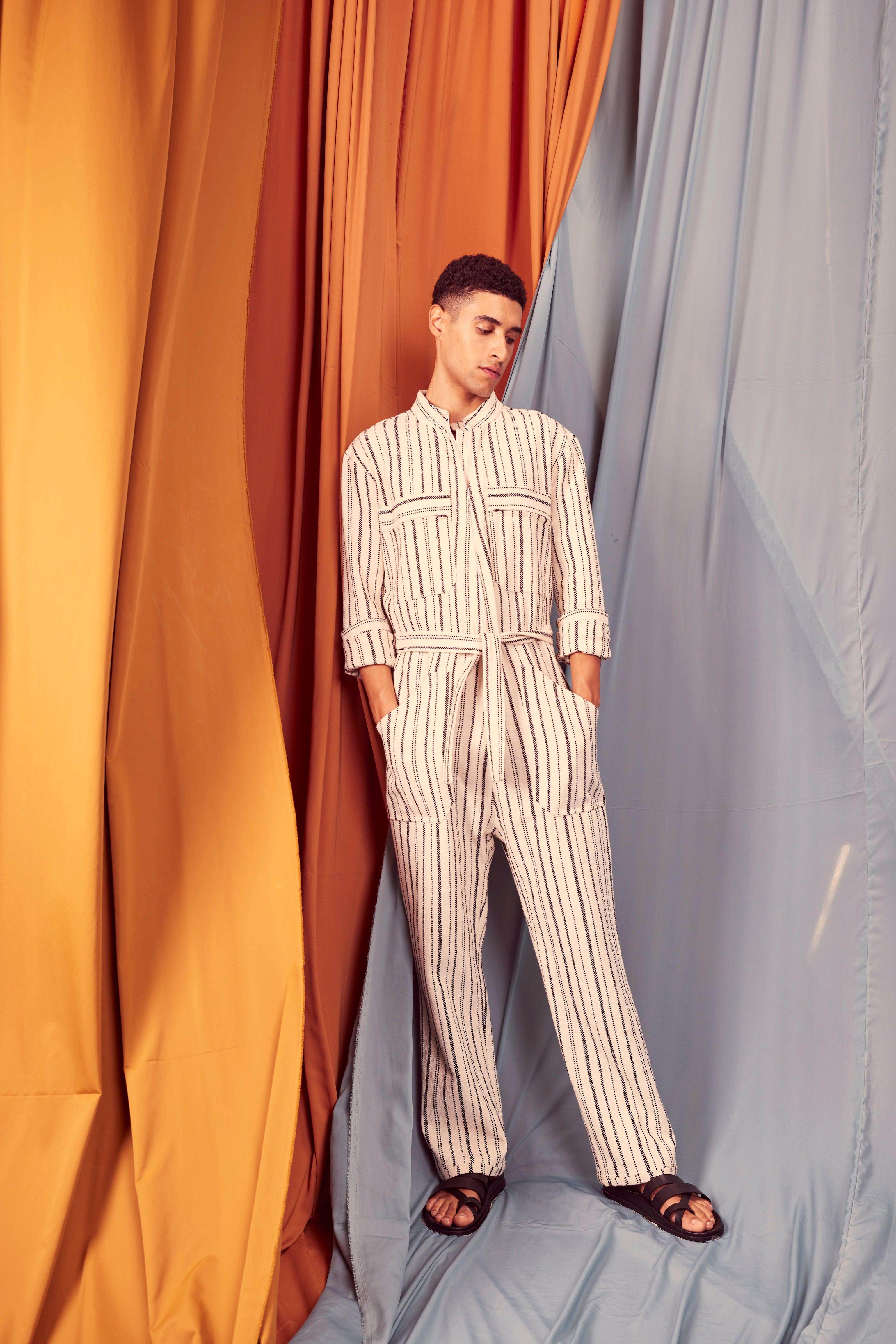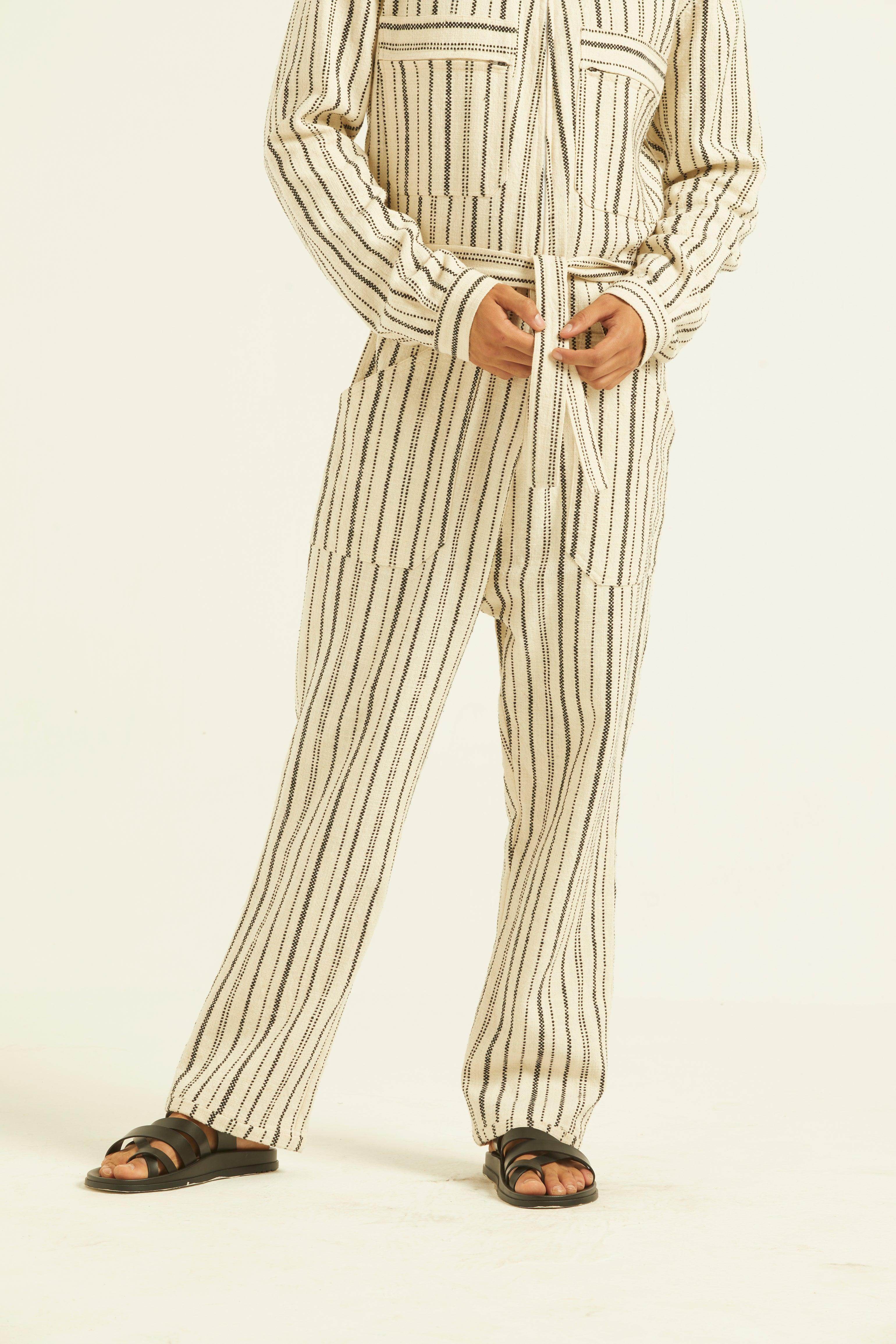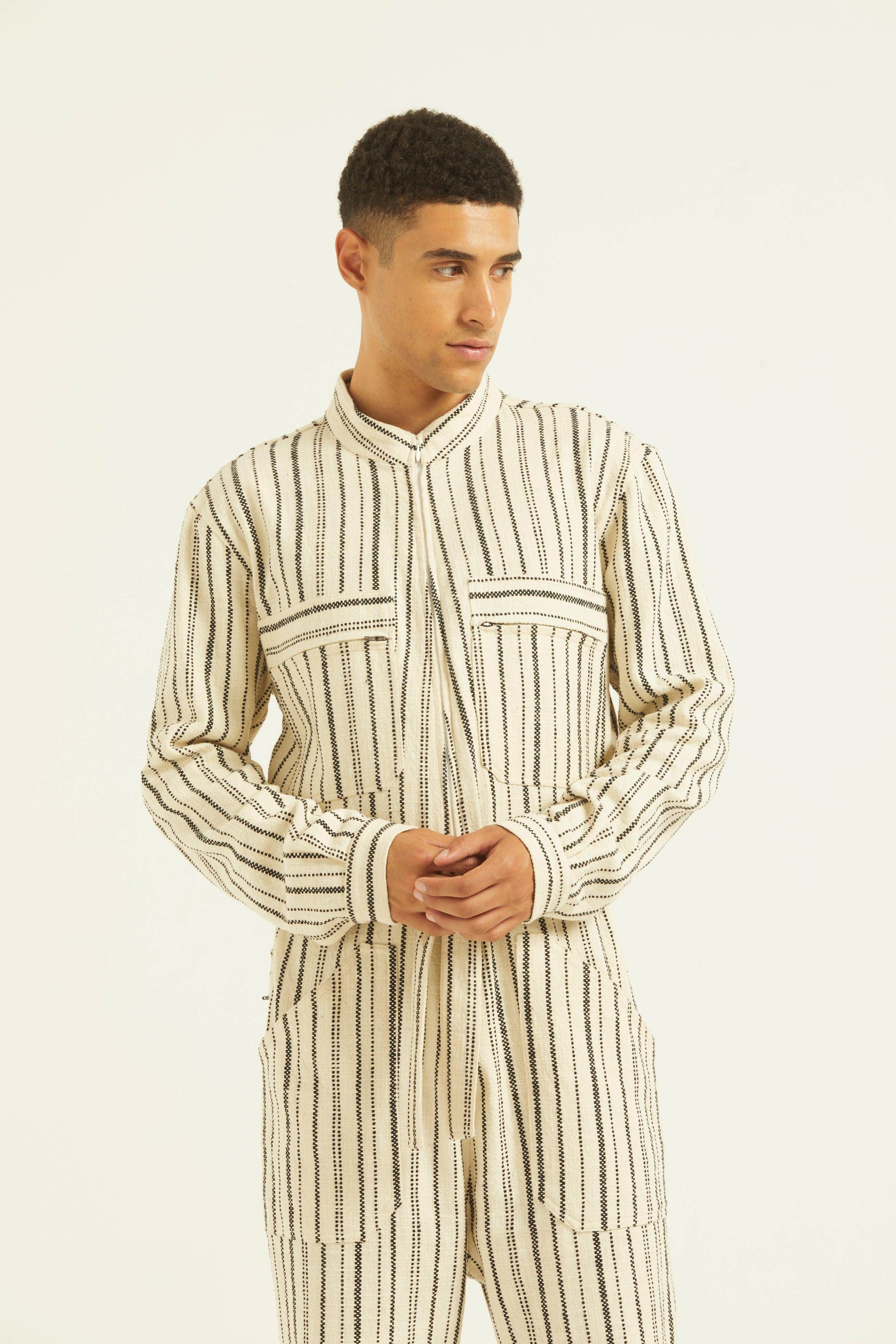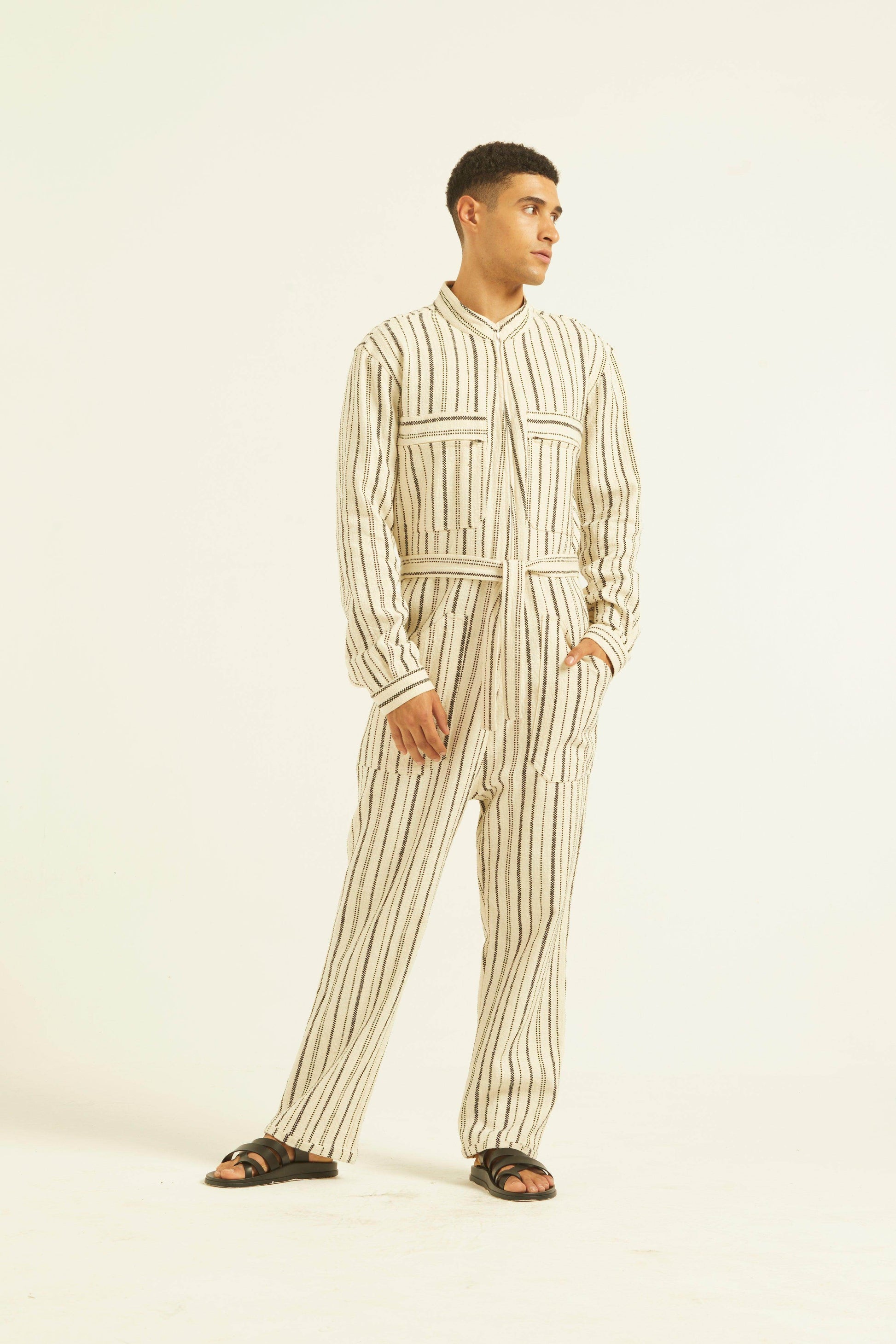 Ivory/Black stripe full sleeve cotton jumpsuit with a zip front opening. Pockets on the front chest and side. Tie up around the waist with belt loops. Relaxed fit.