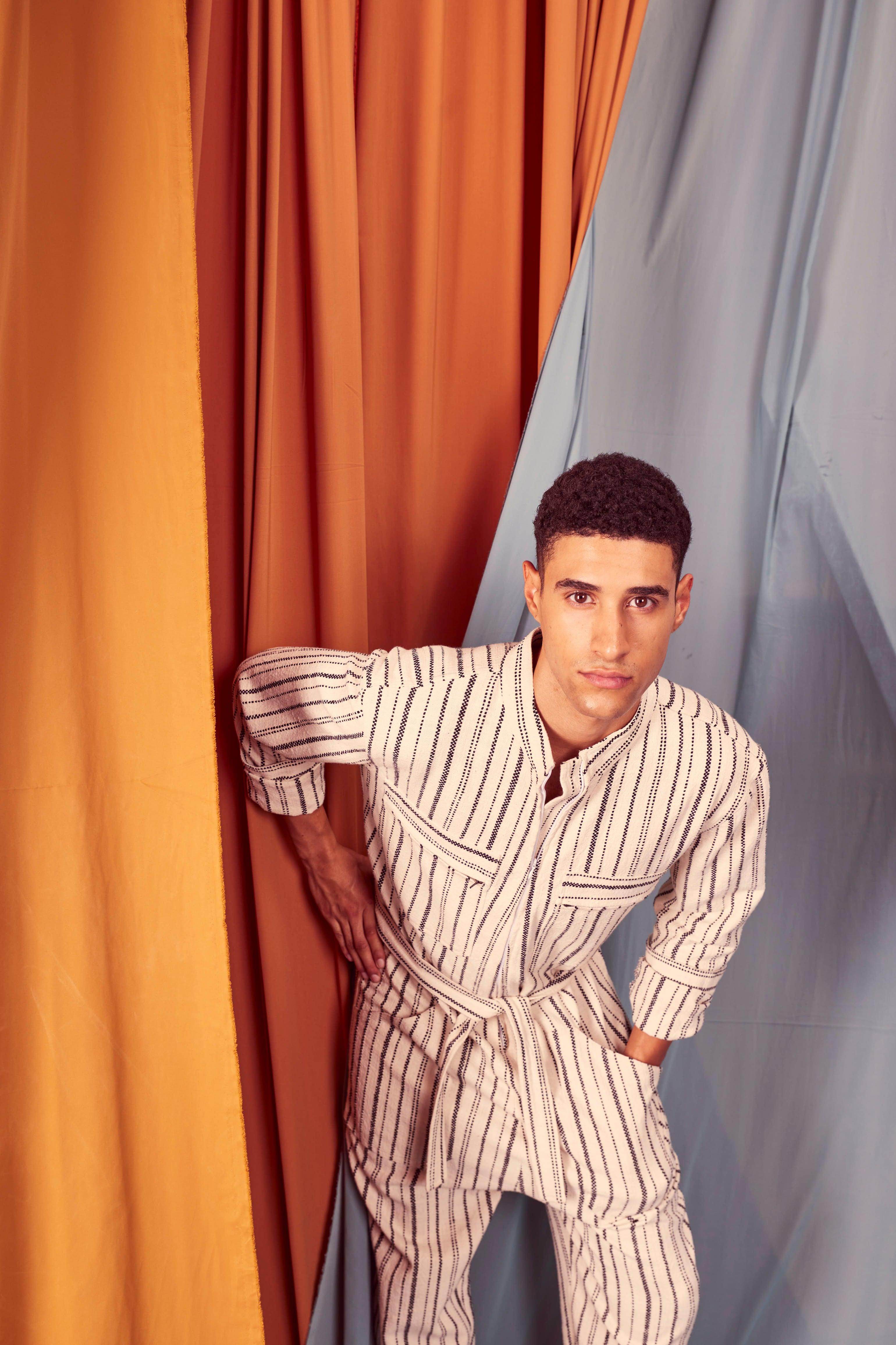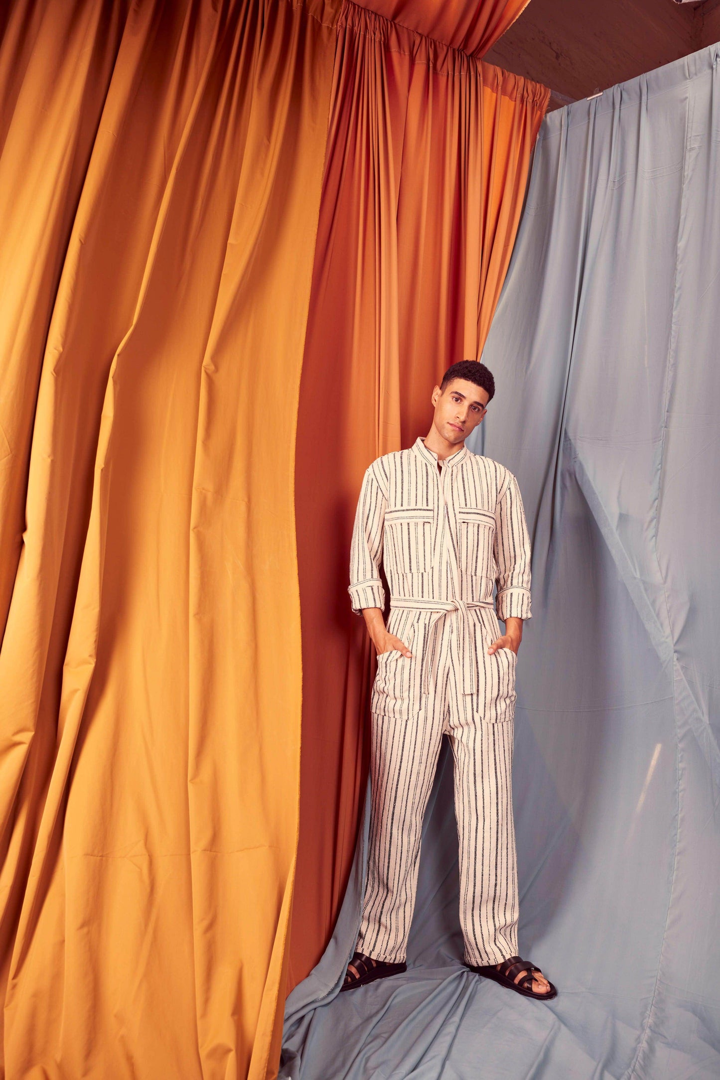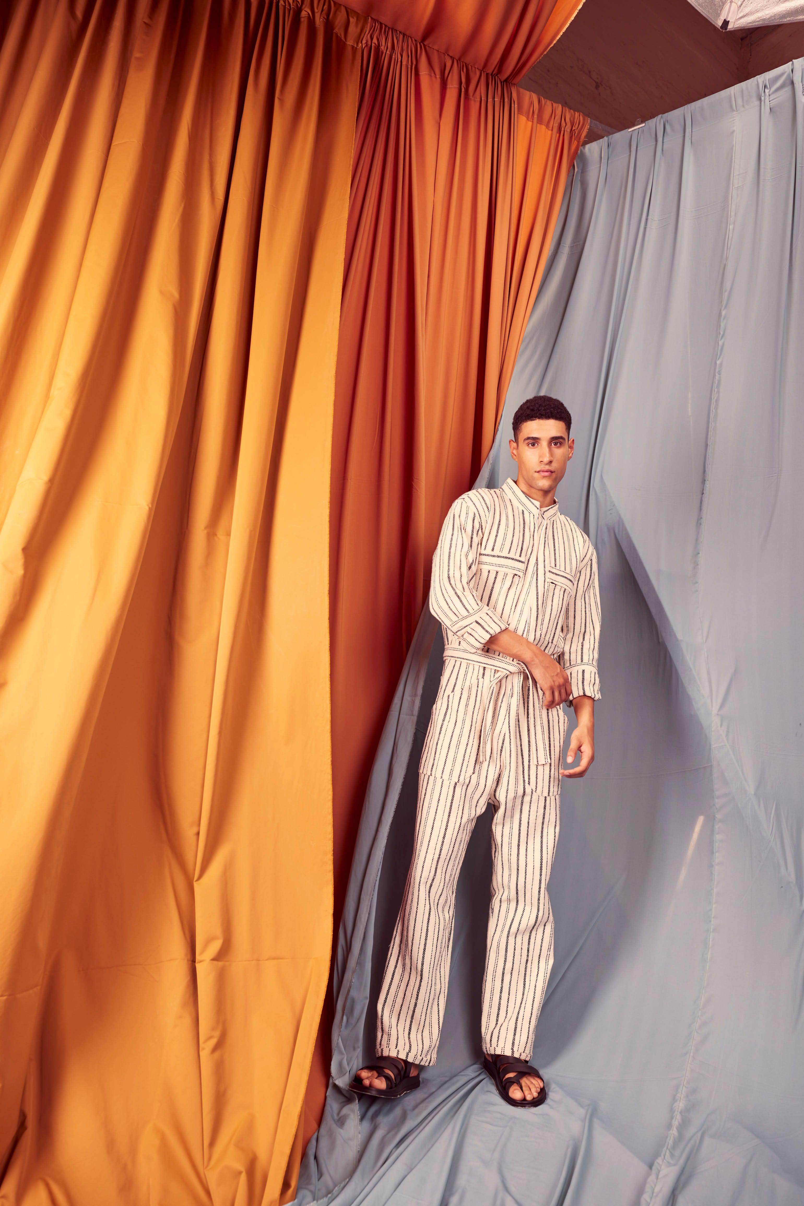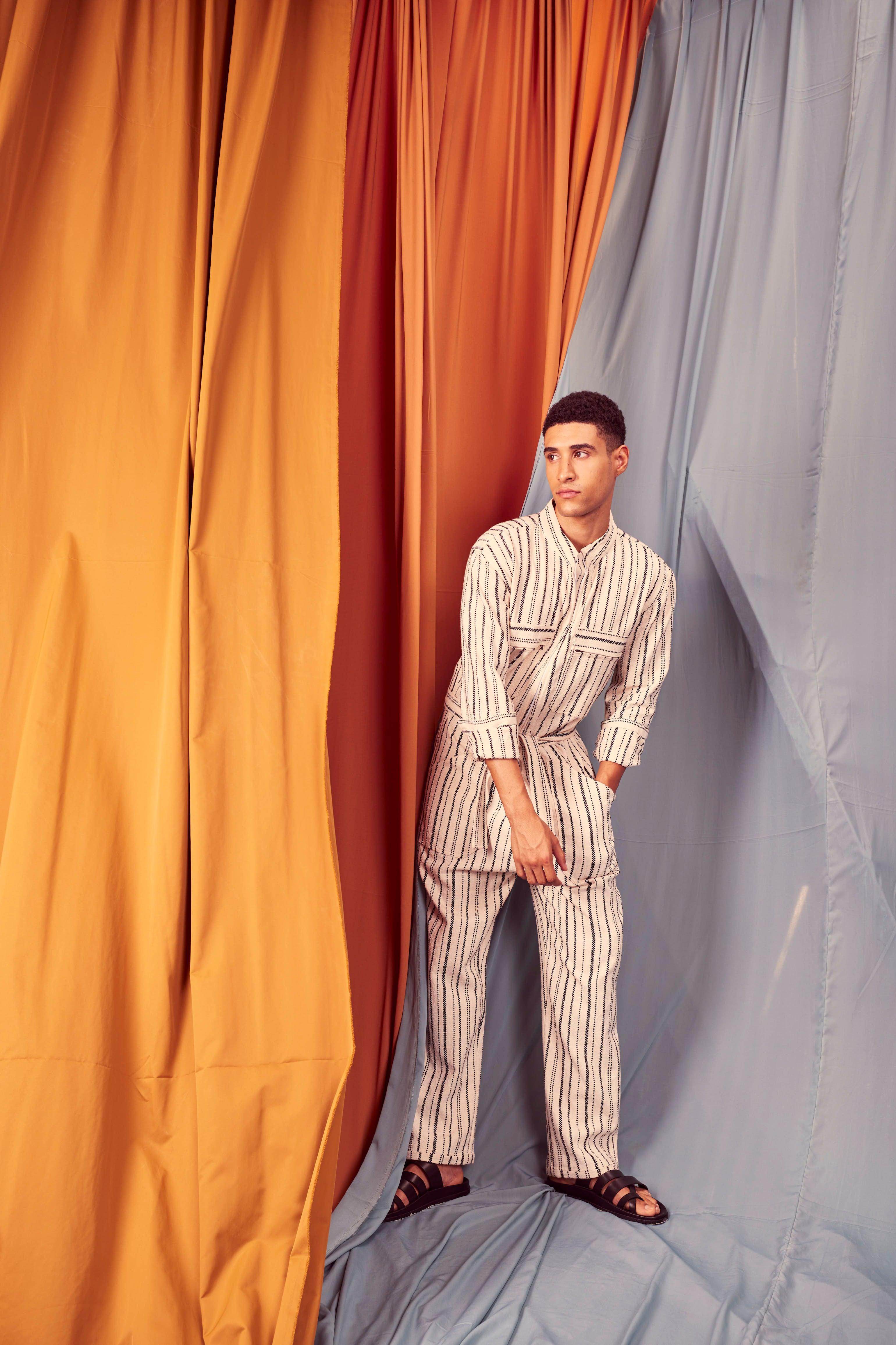 Ivory/Black stripe full sleeve cotton jumpsuit with a zip front opening. Pockets on the front chest and side. Tie up around the waist with belt loops. Relaxed fit.