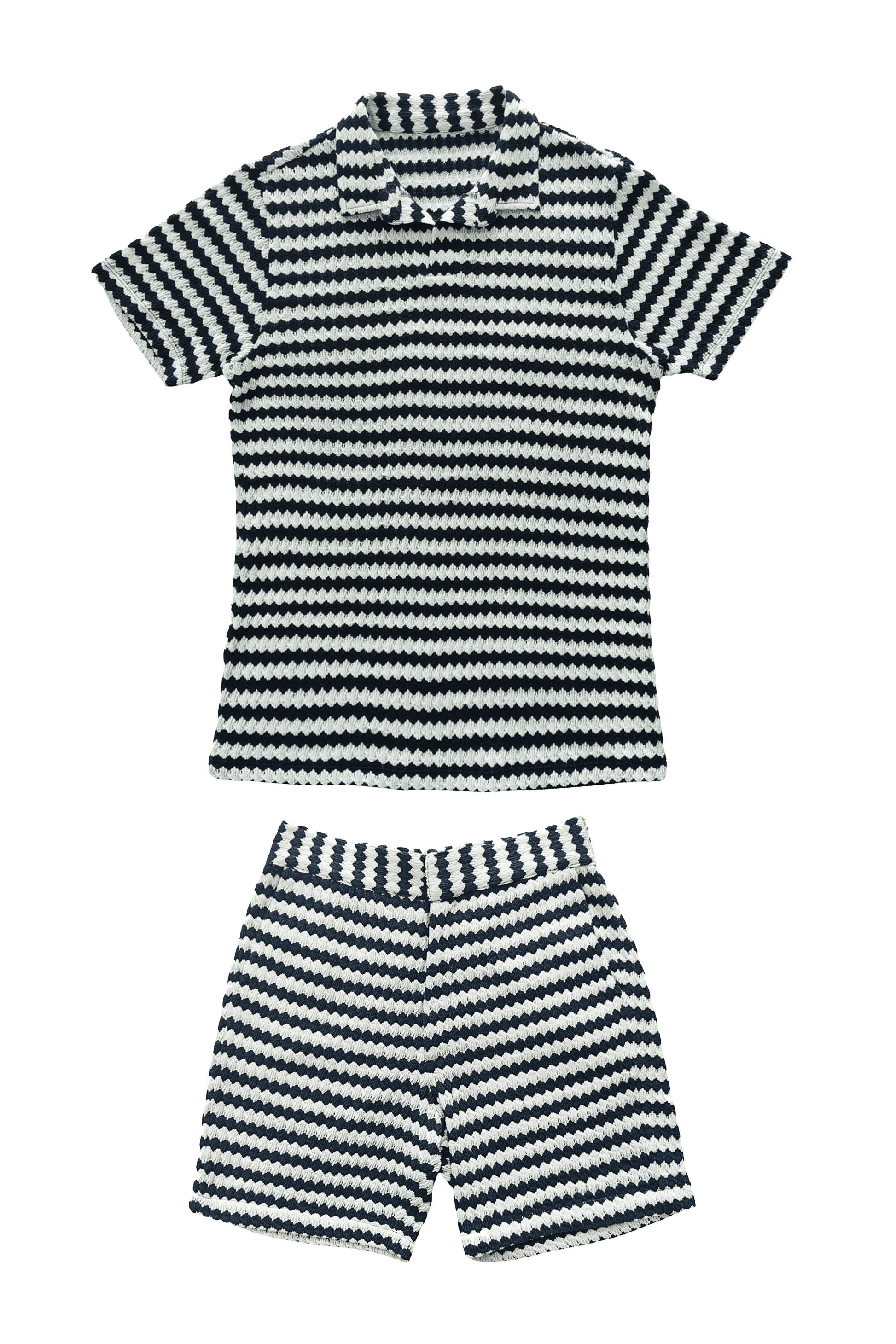 Organic cotton popover polo in textured knitted navy and white stripe fabric. Paired with matching shorts. Pockets on the side and back. Semi-elasticated at the waist. Hook and eye closure at the front. Zip fly.