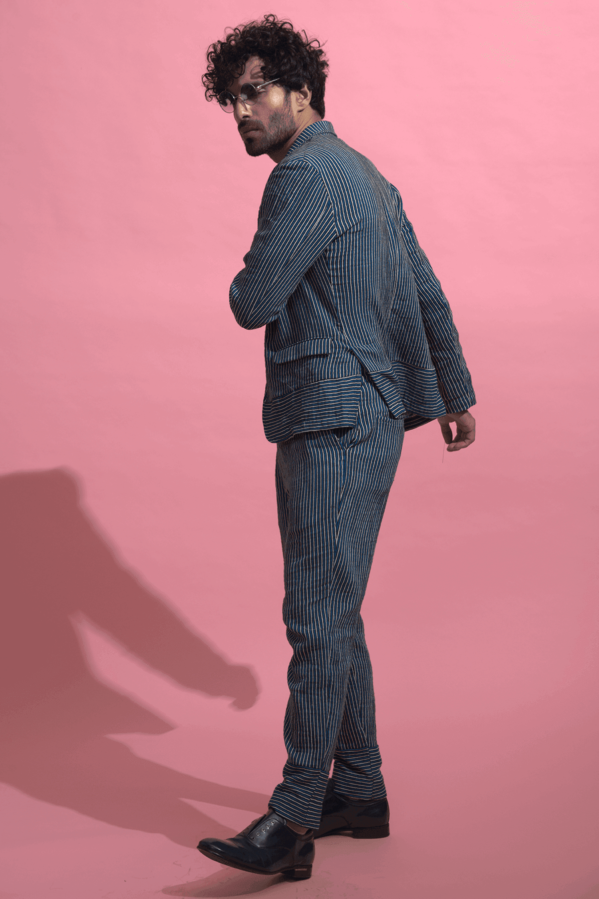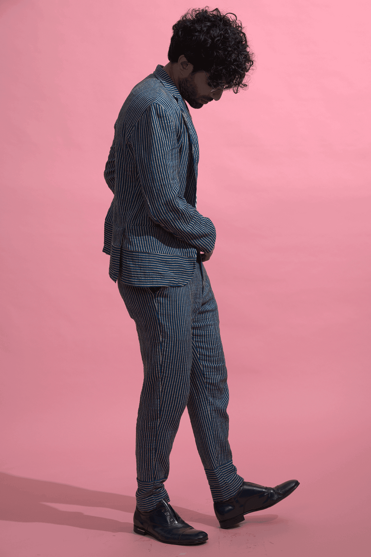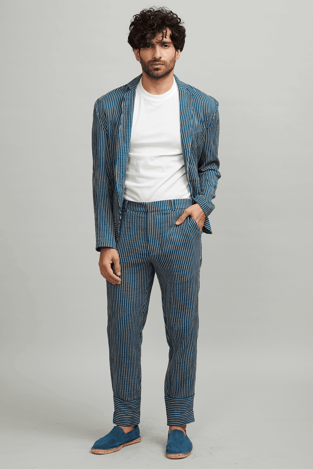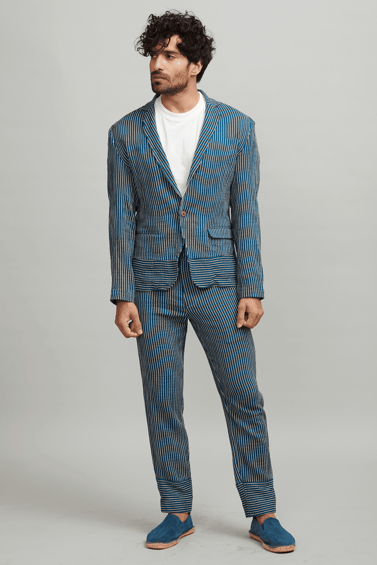 Made of organic crinkle cotton. Printed tonal blue stripes on a natural base, single-button suit jacket. Horizontal stripes detail at bottom hem. Dress it up with a shirt or dress it down with a Tee. Pockets in the font.