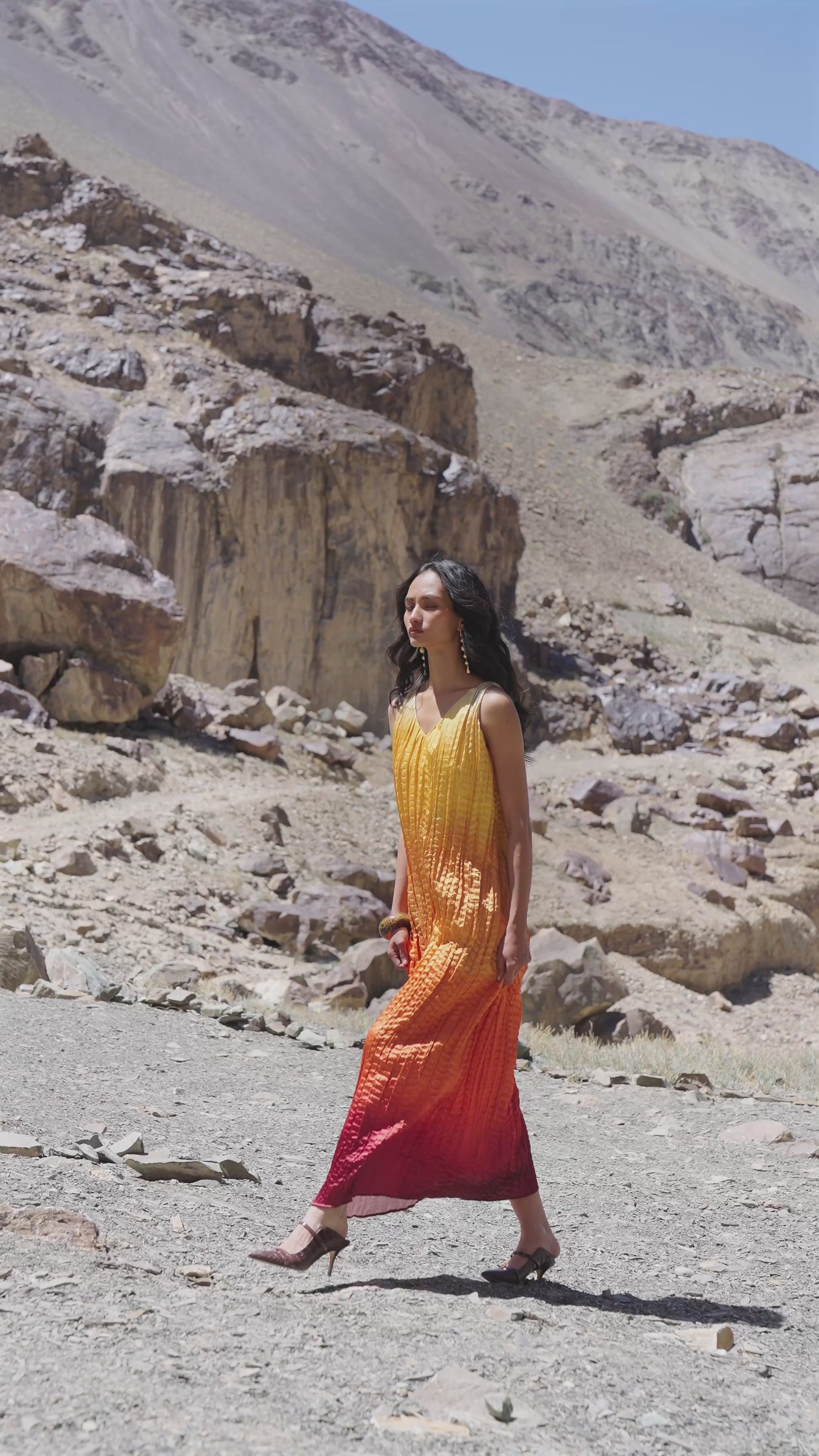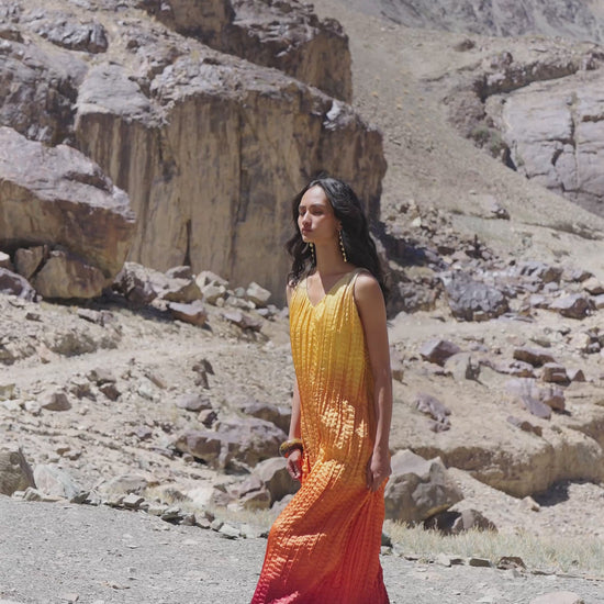 Hand-crushed maxi dress in an ombré print, transitioning from sunset tones of rust to mustard. V-neck design with a flowing silhouette.
