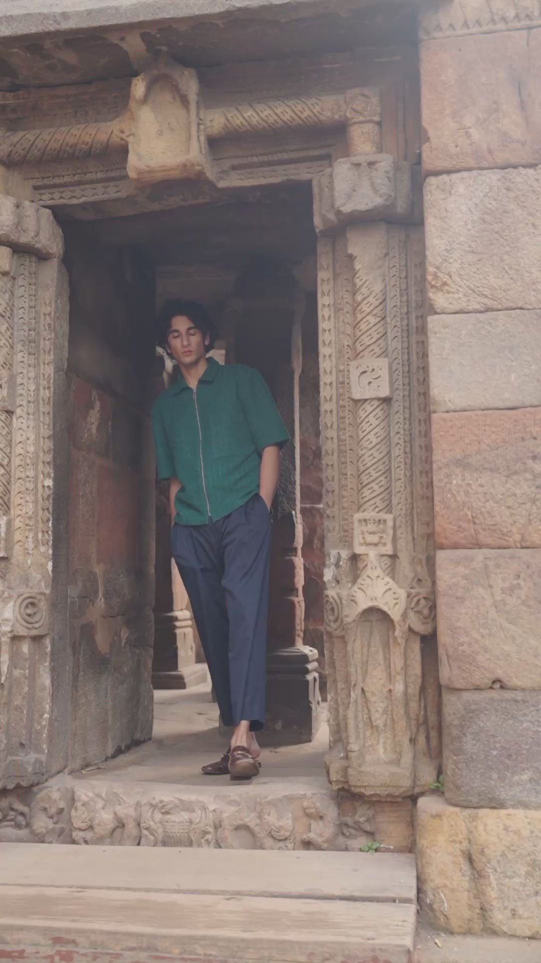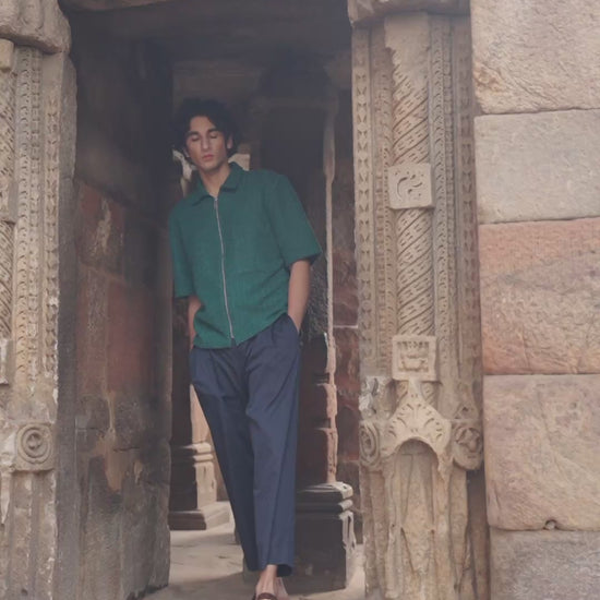 Soft textured knitted bouclé half sleeve shirt. Contrast matte silver metallic full-front zipper. Relaxed fit.