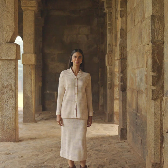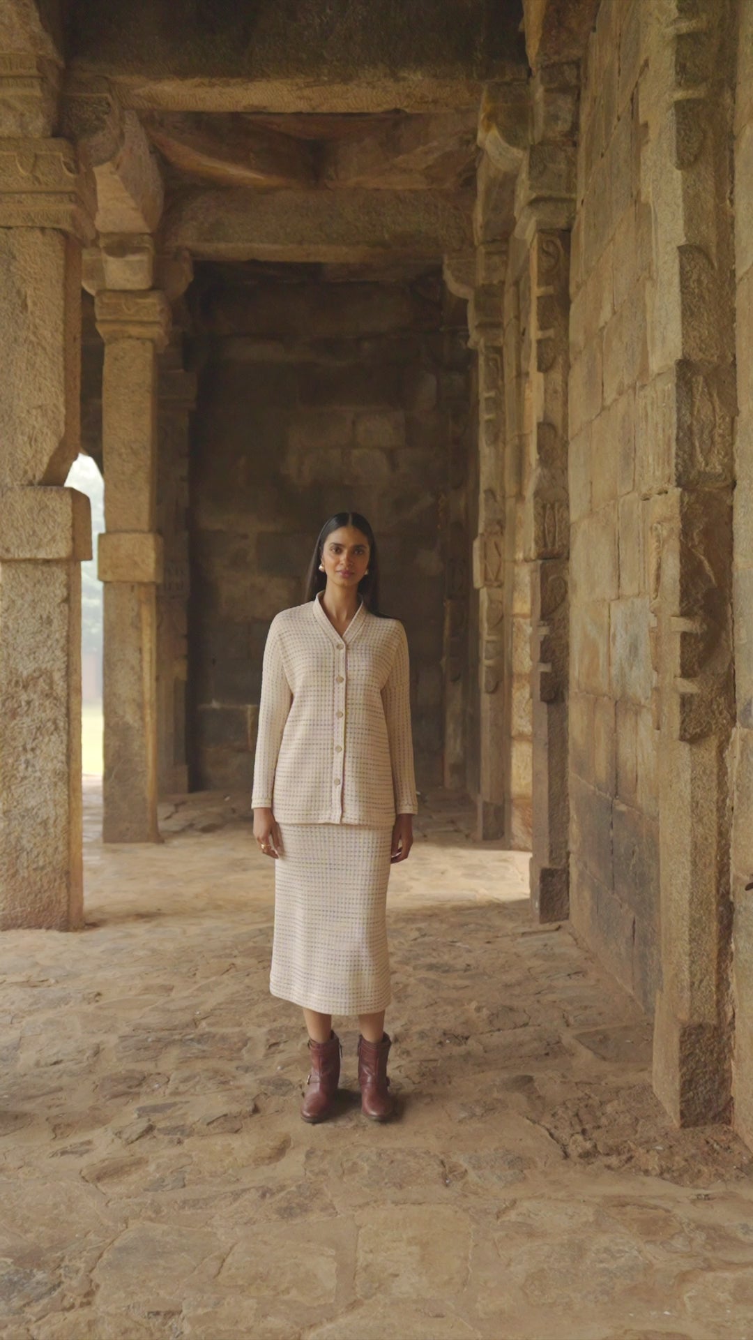 Soft waffle knit textured fabric with an earth tone pattern on an ivory base. Shawl collar with wooden button down placket. Tapered full sleeves. Relaxed fit.