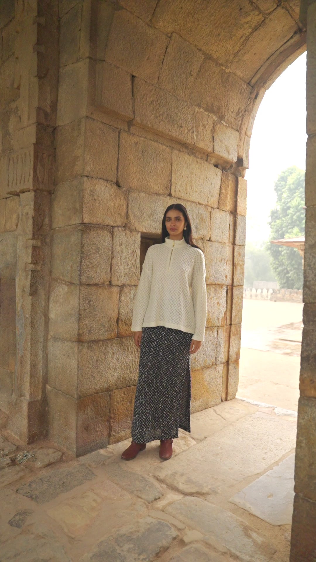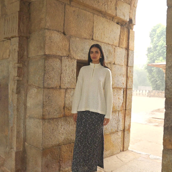 Soft flat-knitted popover top in a diamond geometric jacquard pattern. Band collar, gold zipper and puller tab in the front. Full sleeves. Relaxed fit. Paired with a complementary straight maxi skirt in a diamond geometric white on black jacquard pattern. Elasticated at the waist with a side button and zip closure. Side slit. Lined till the knee.
