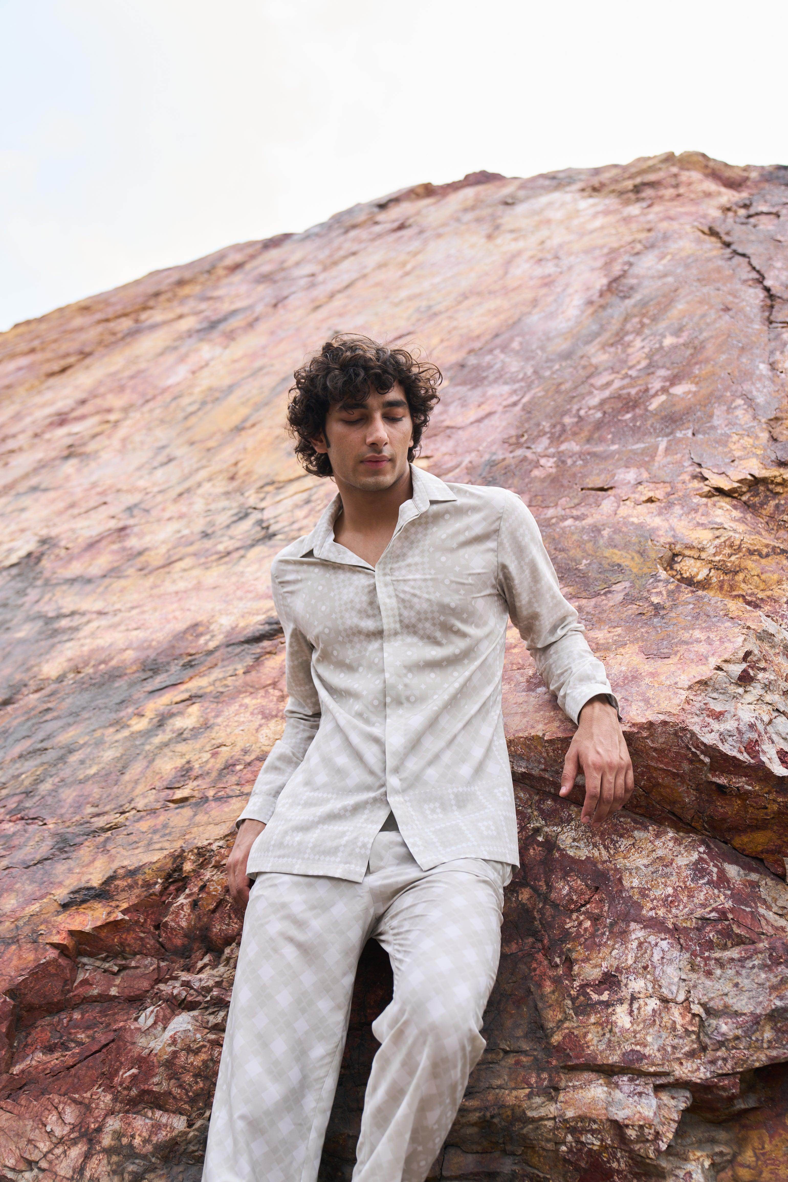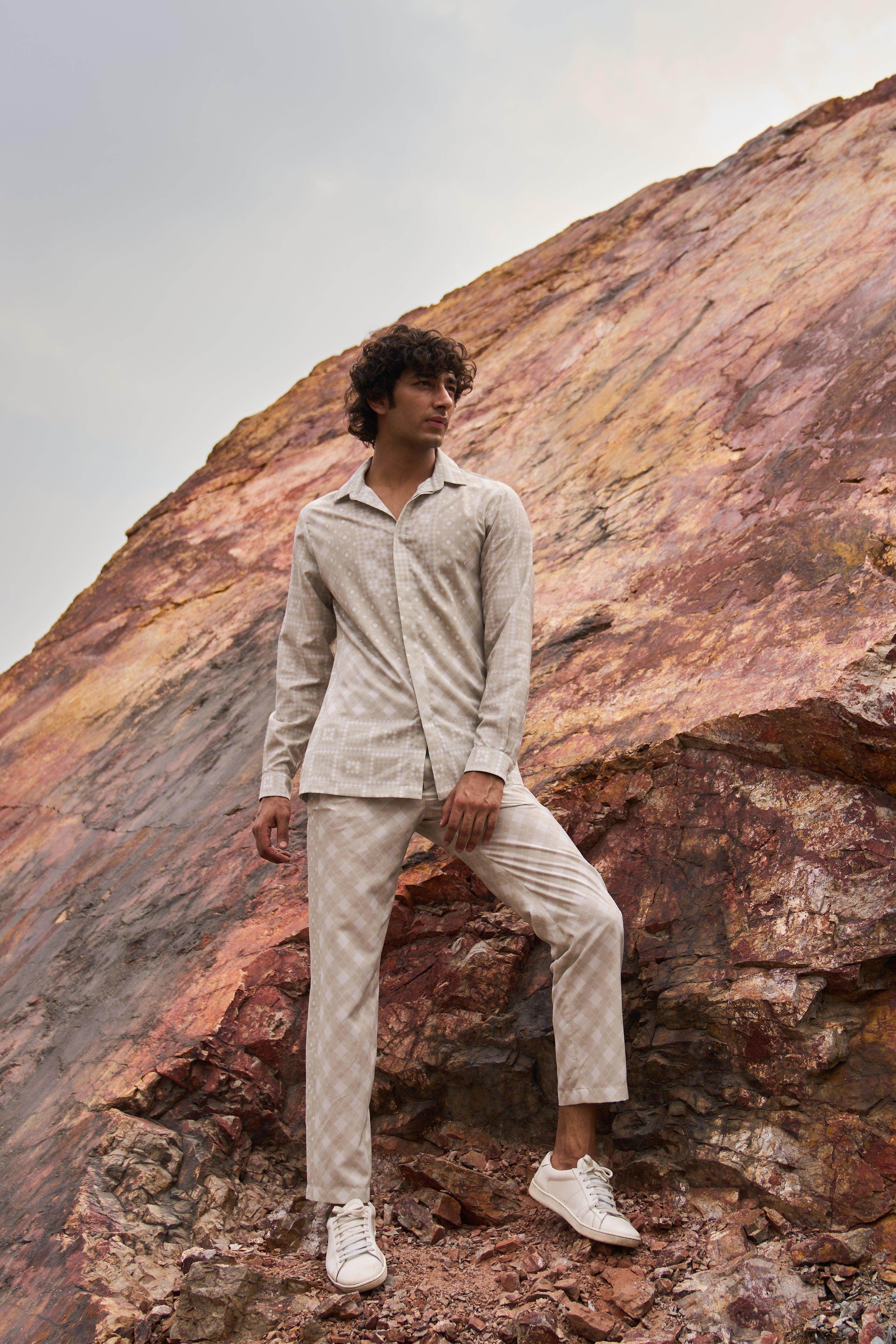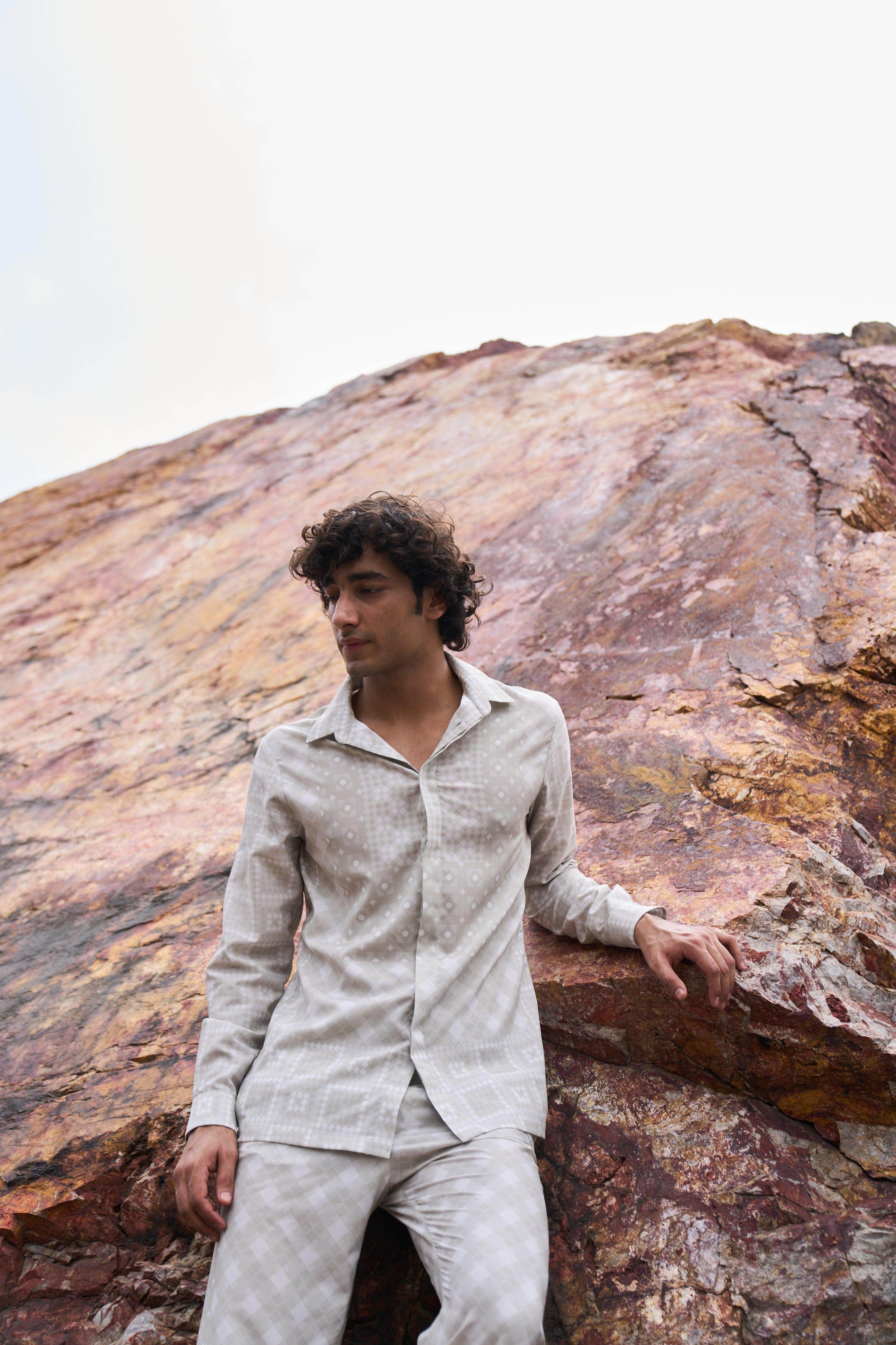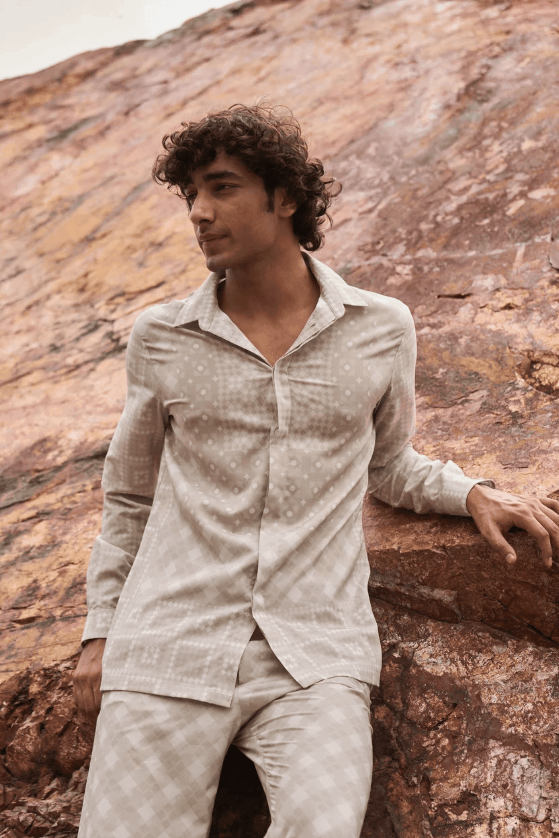 Beige tonal printed shirt inspired by moroccan mosaic tiles. Placement pattern detail at the bib and at the outline of the shirt. Full-sleeve, concealed buttons. Regular fit.
