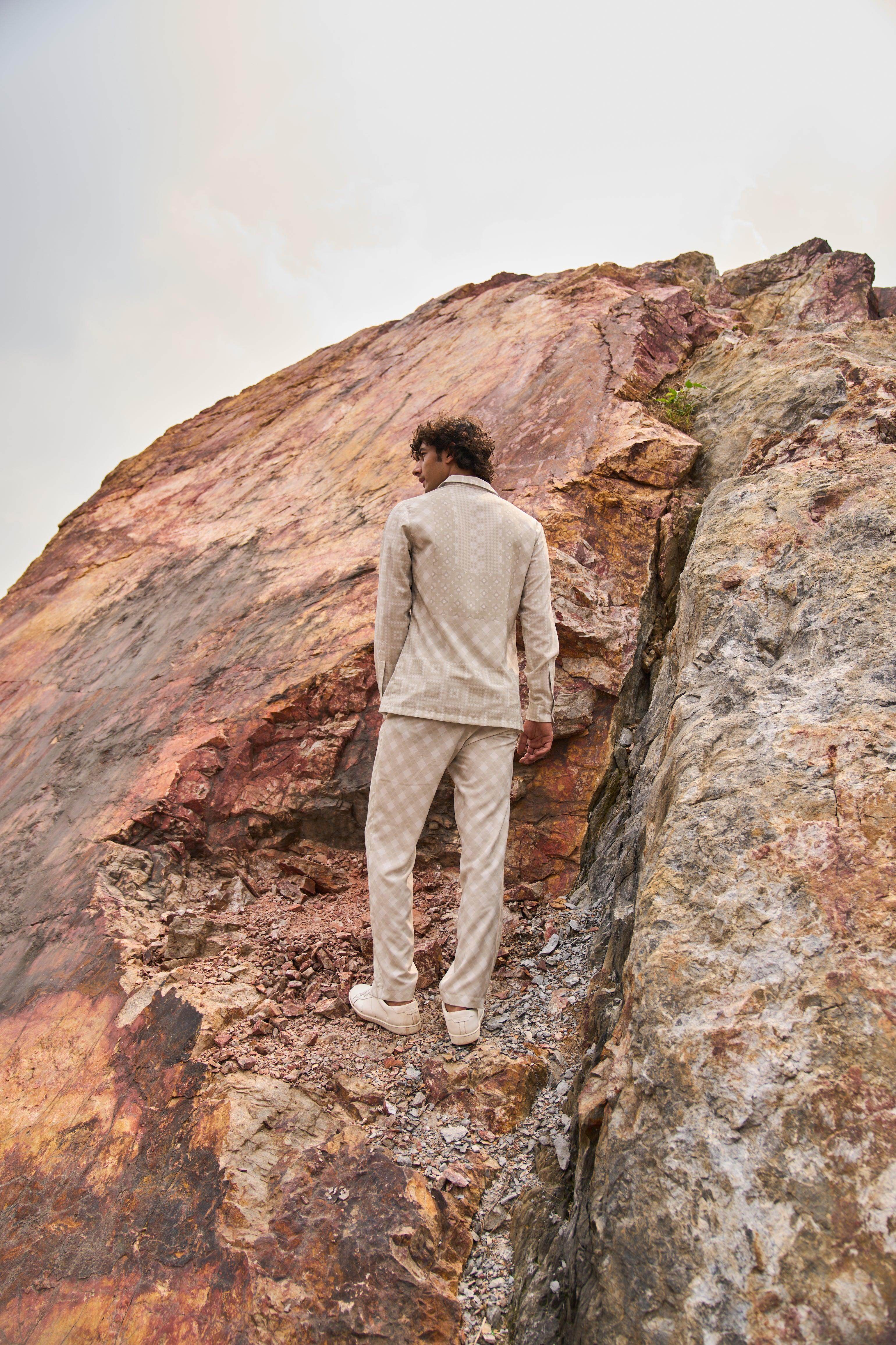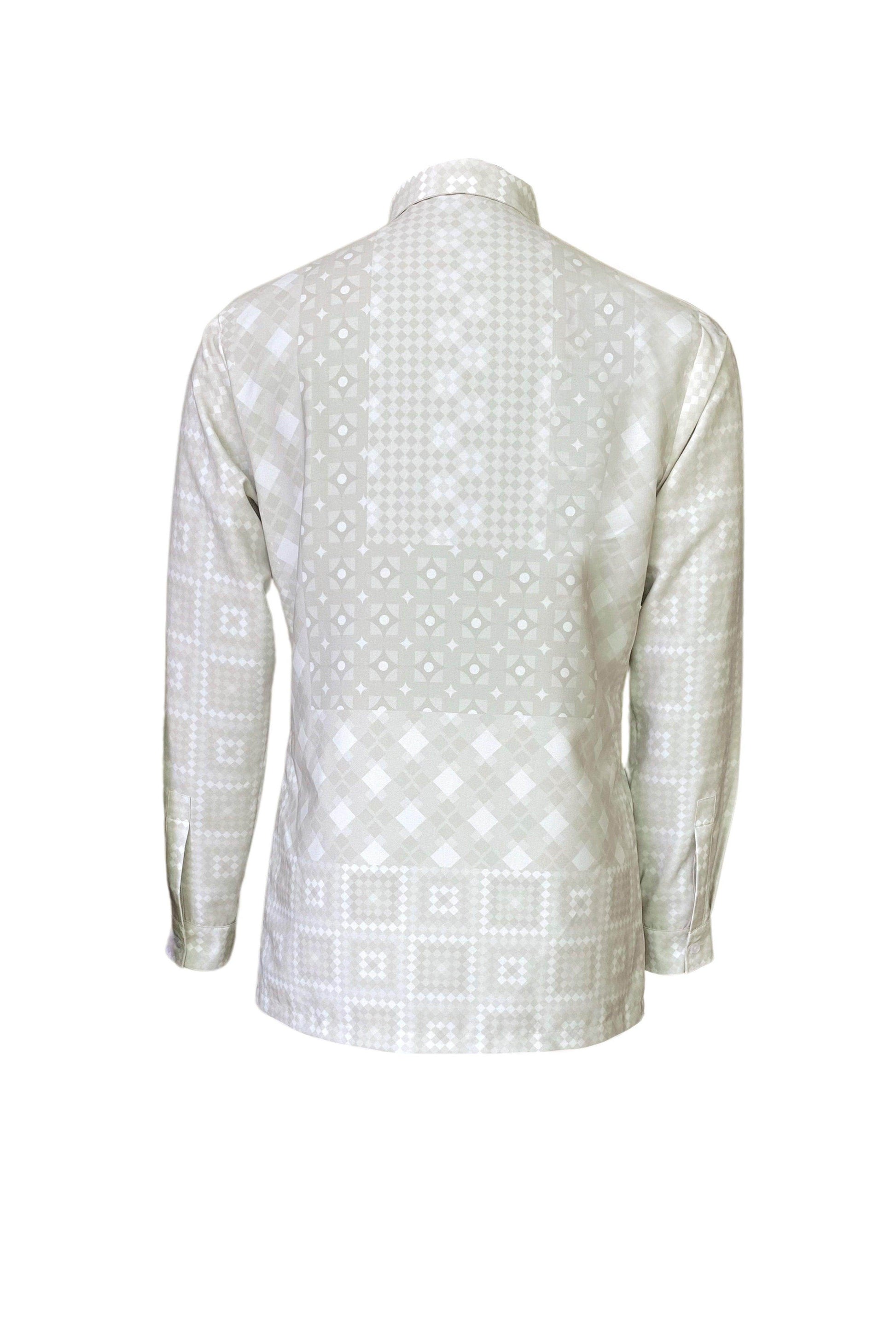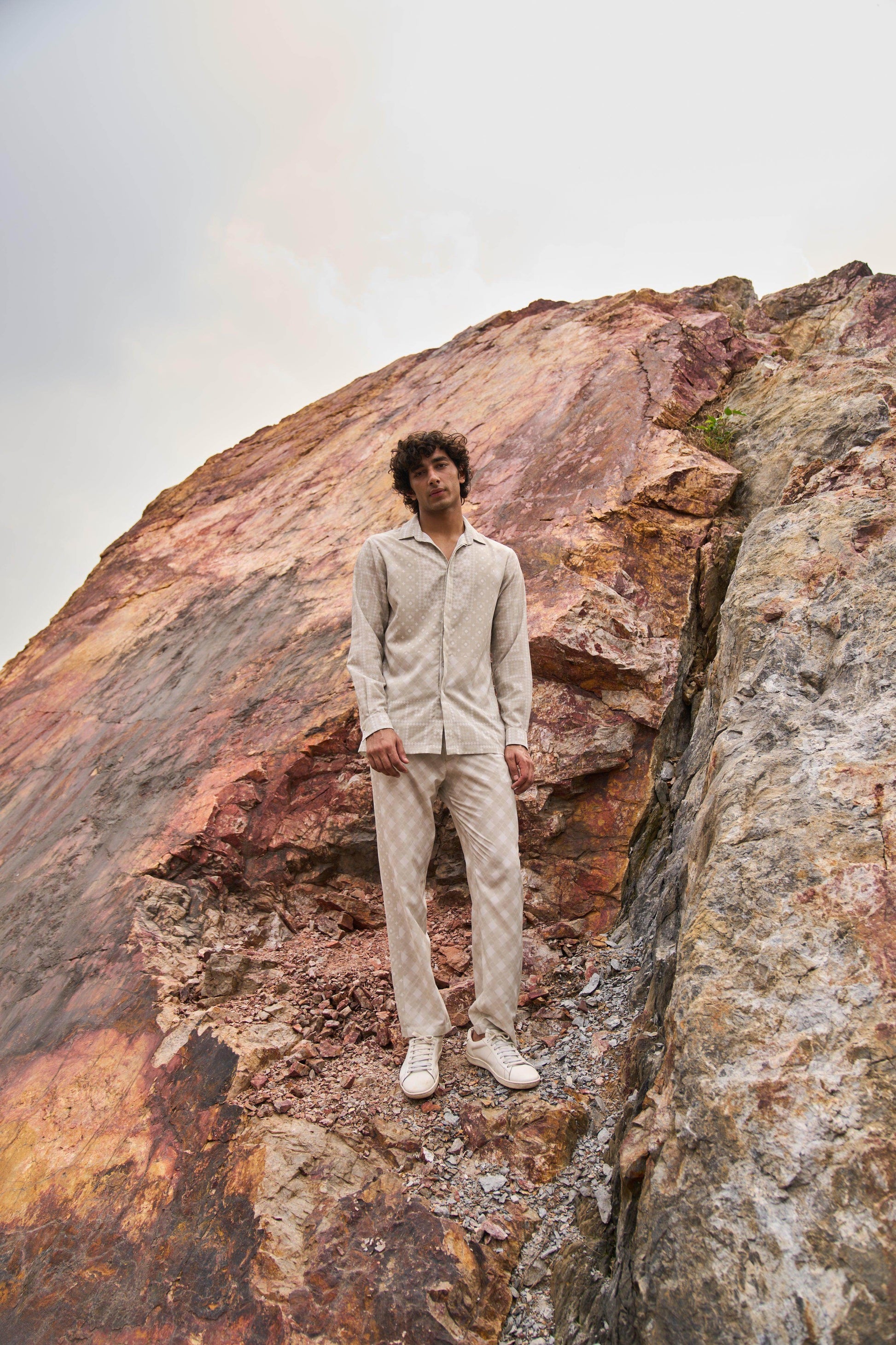 Beige tonal printed shirt inspired by moroccan mosaic tiles. Placement pattern detail at the bib and at the outline of the shirt. Full-sleeve, concealed buttons. Regular fit.