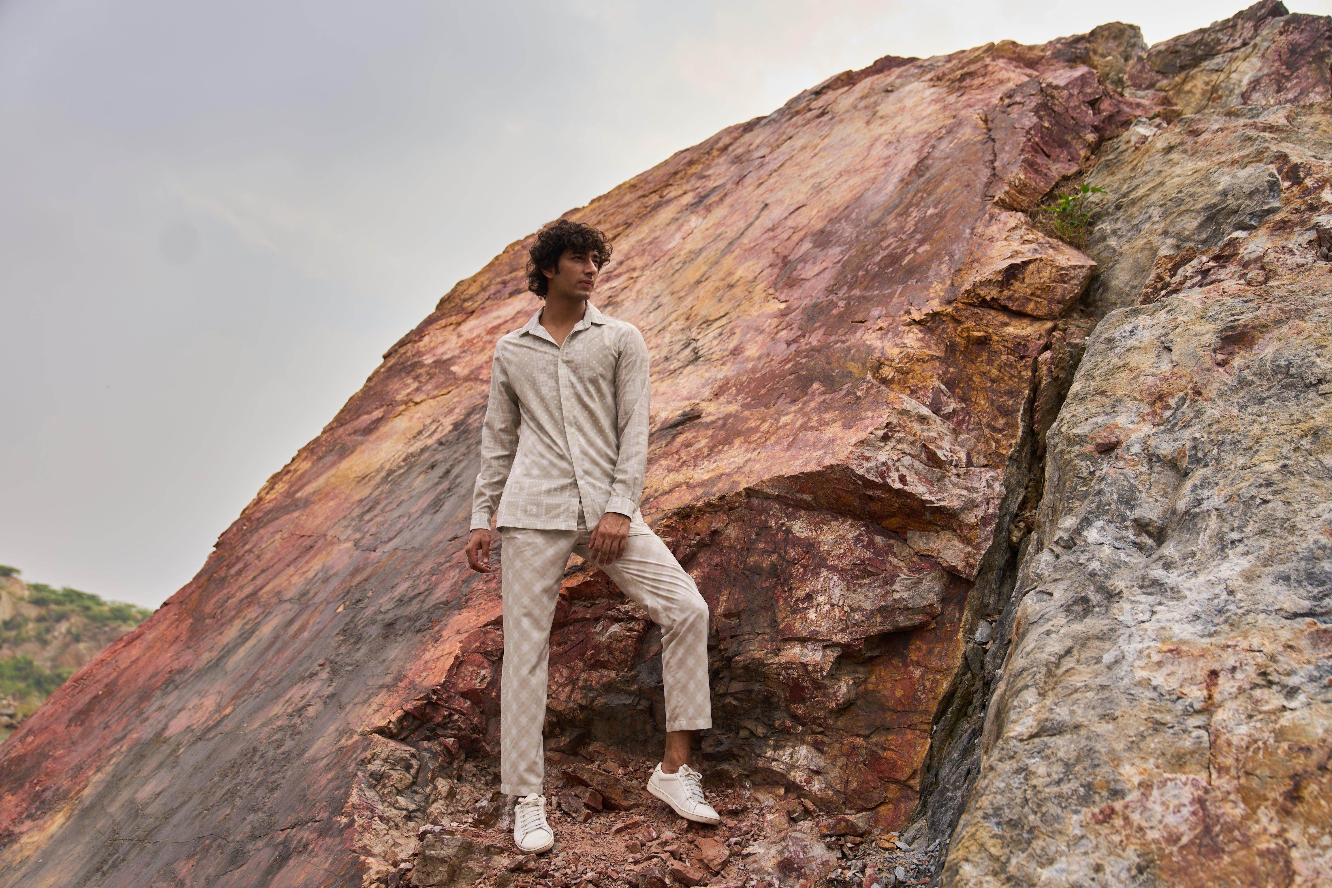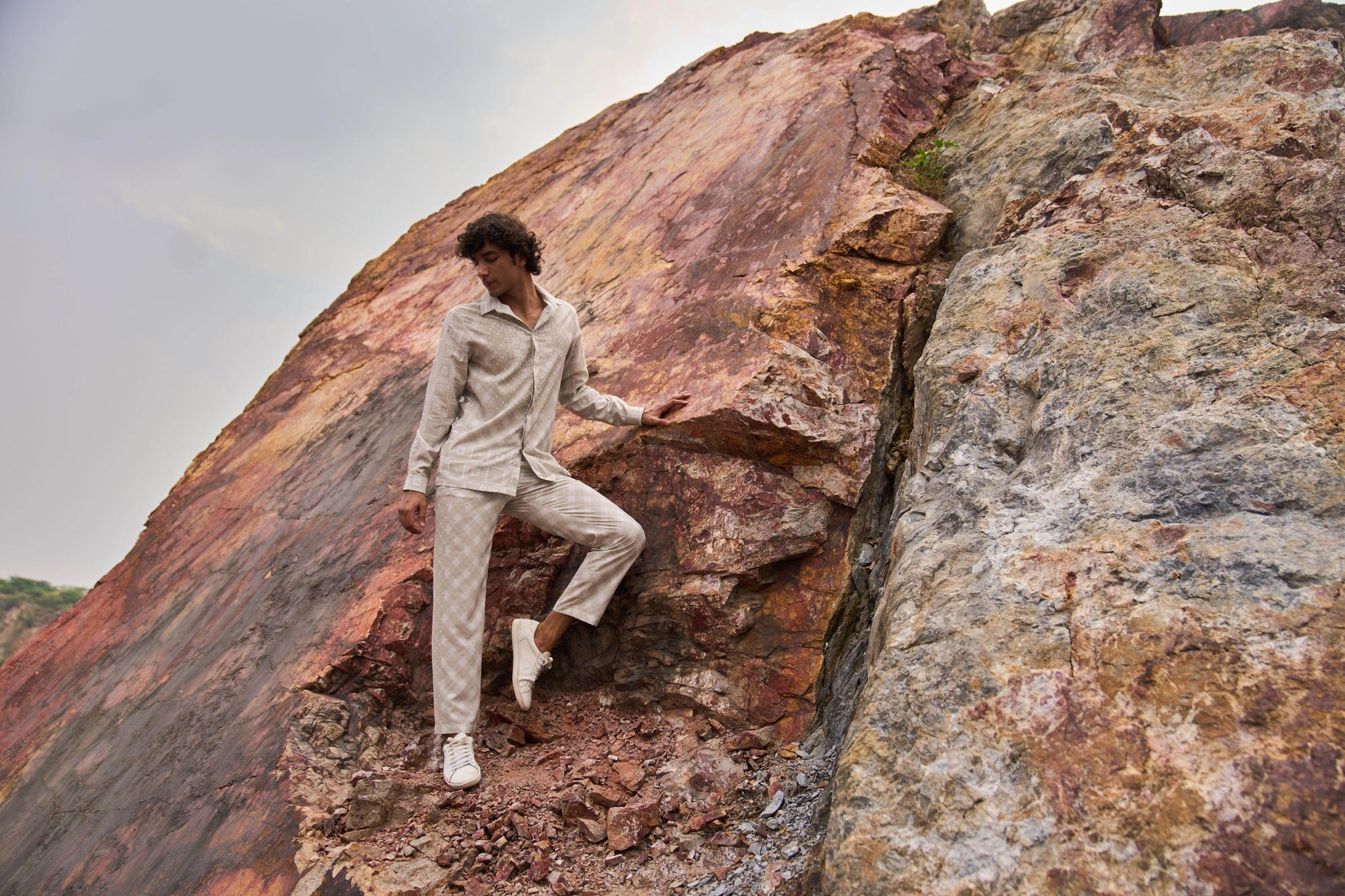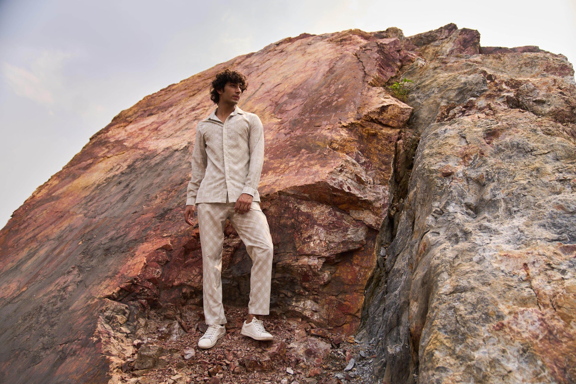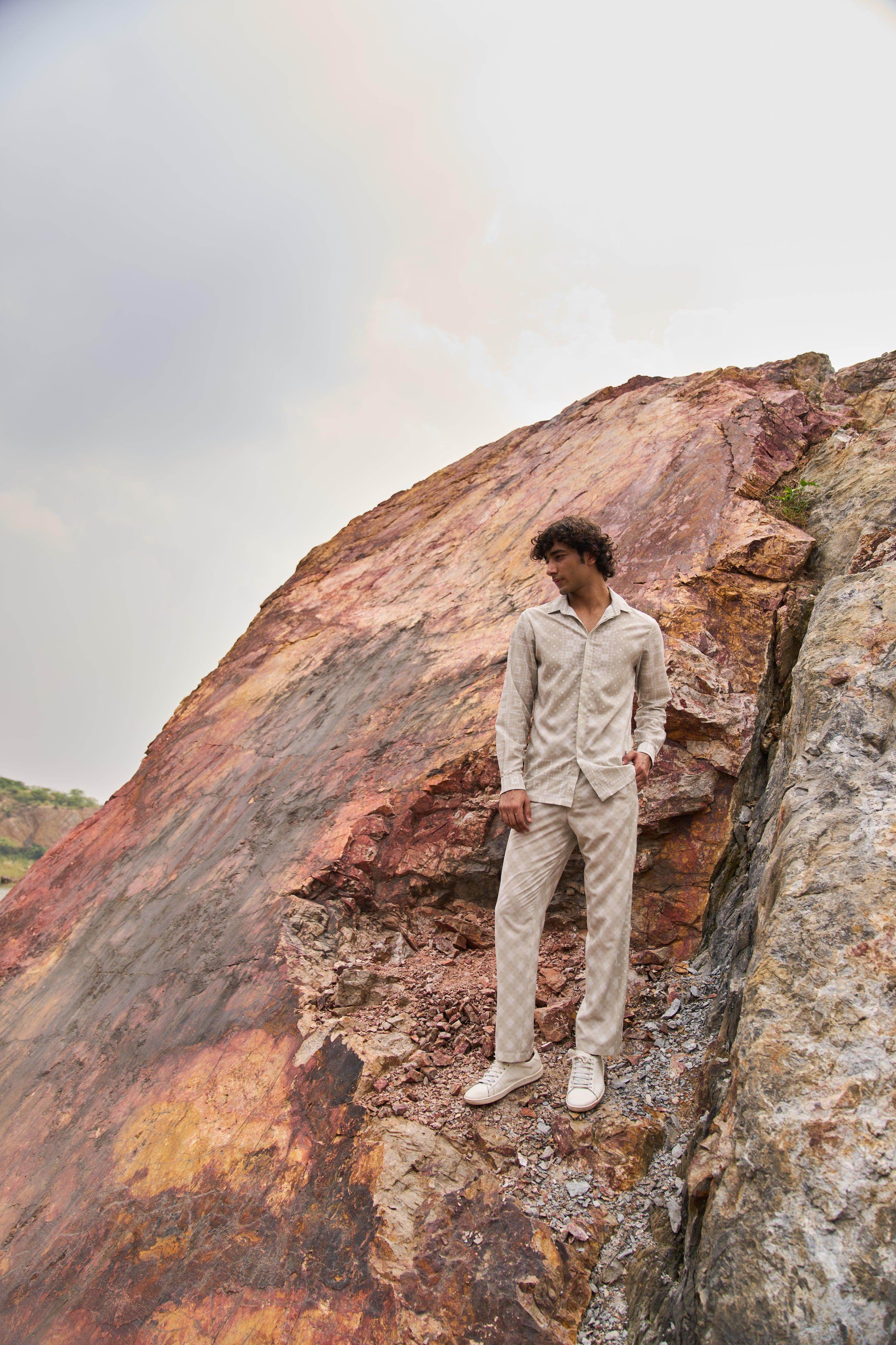 Beige tonal printed shirt inspired by moroccan mosaic tiles. Placement pattern detail at the bib and at the outline of the shirt. Full-sleeve, concealed buttons. Regular fit.