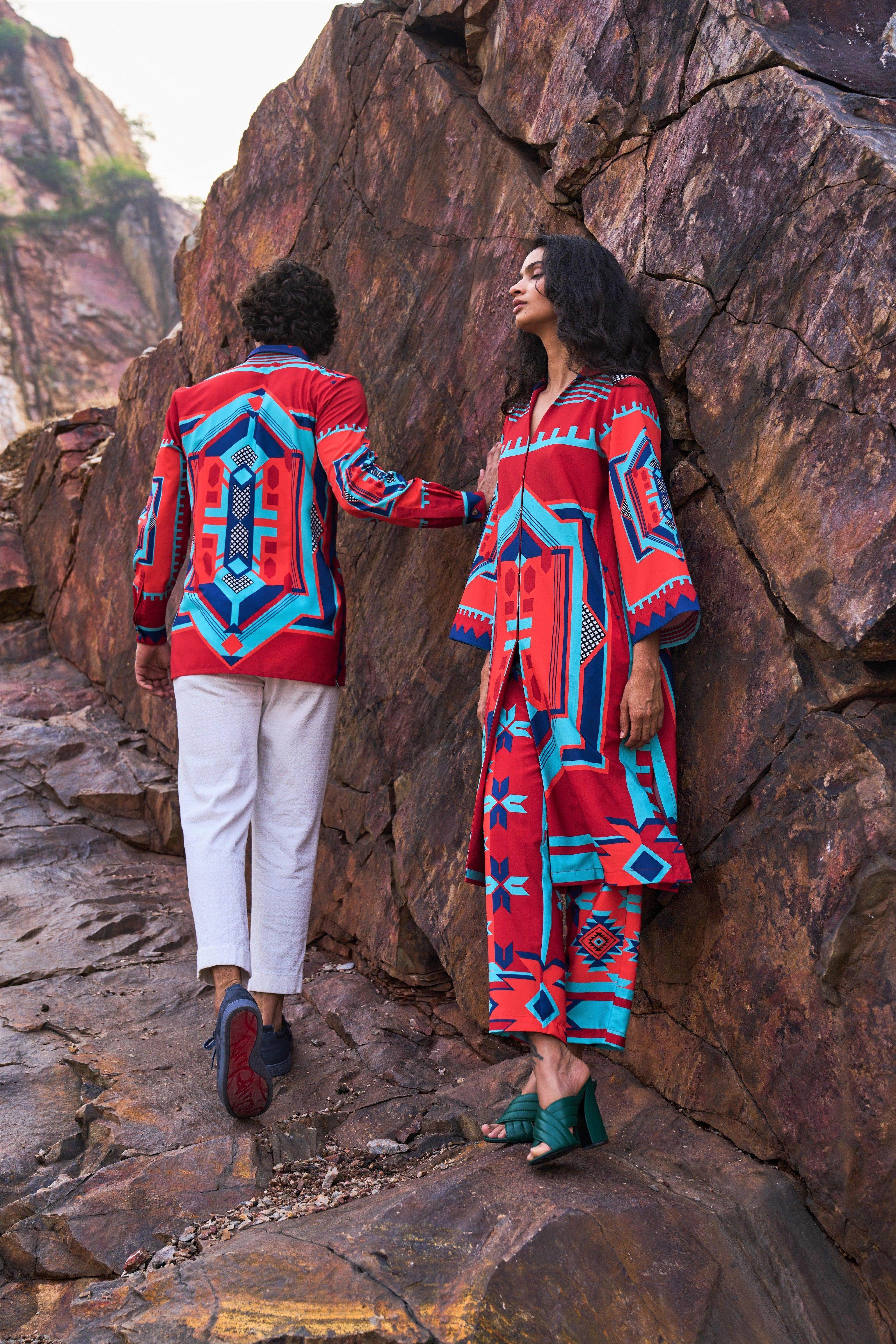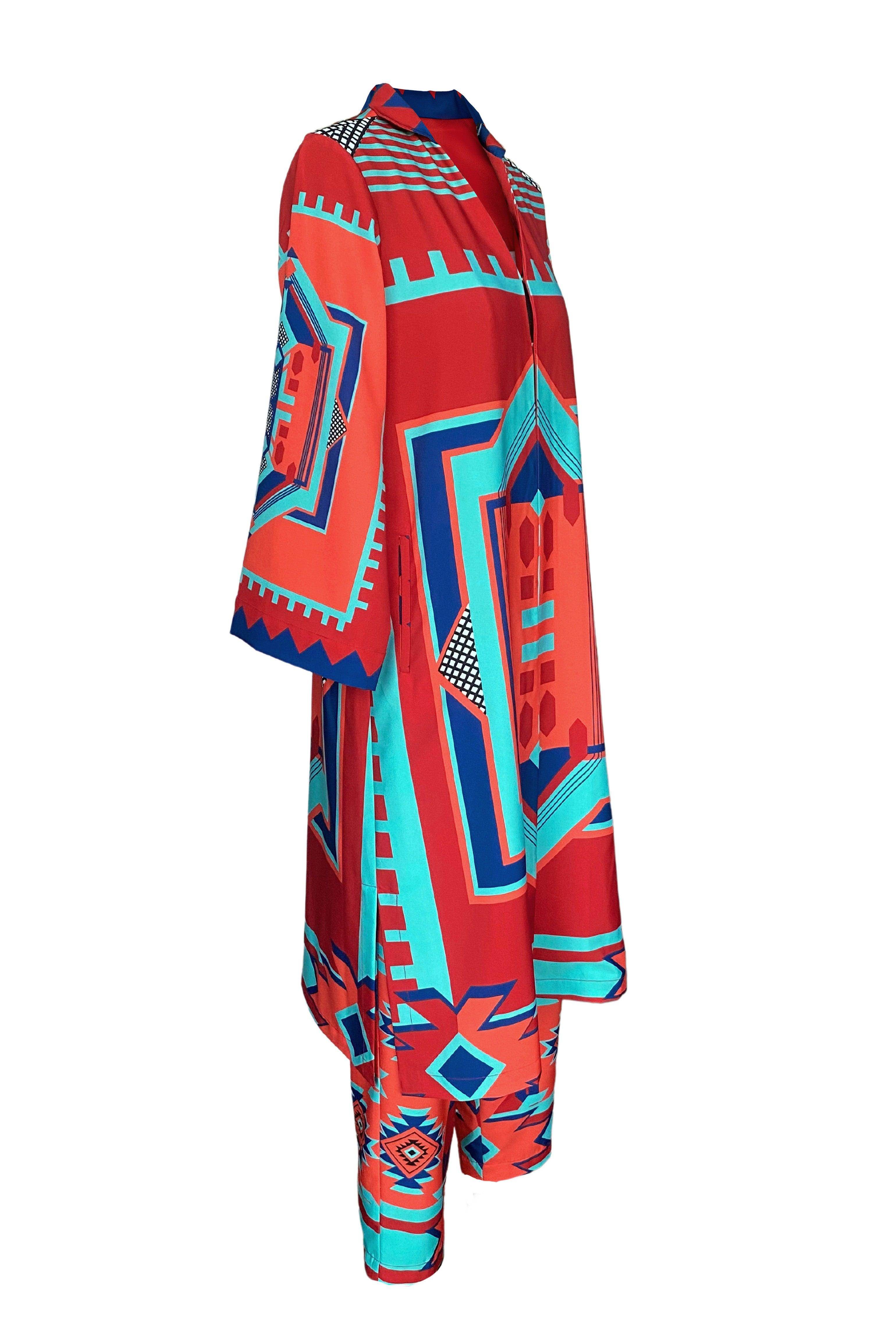Tribal printed longline top with a regular collar and V-neck. Hook and eye closure at the front. Pockets and slits on the sides. Can be worn as a top or a jacket.