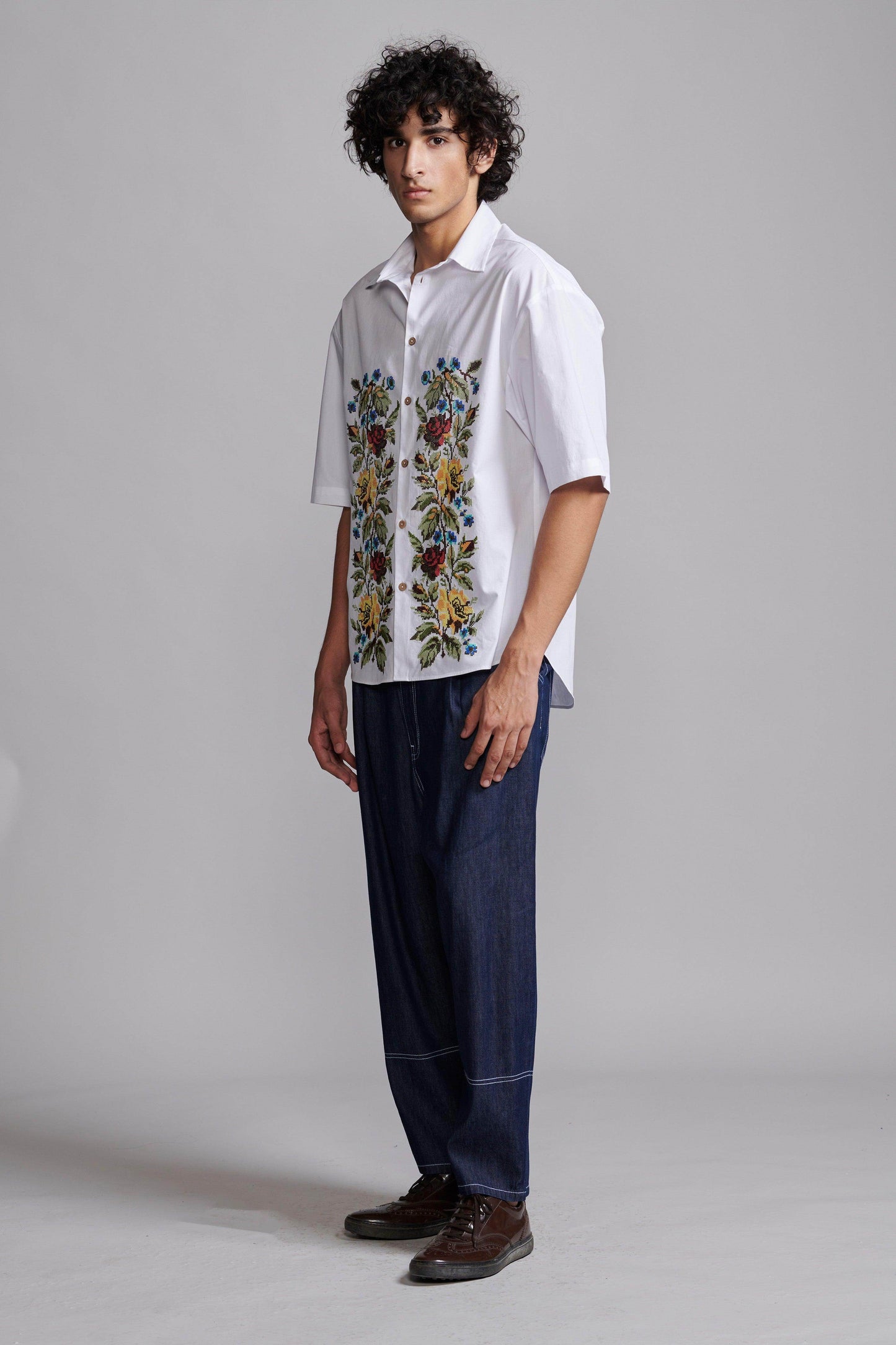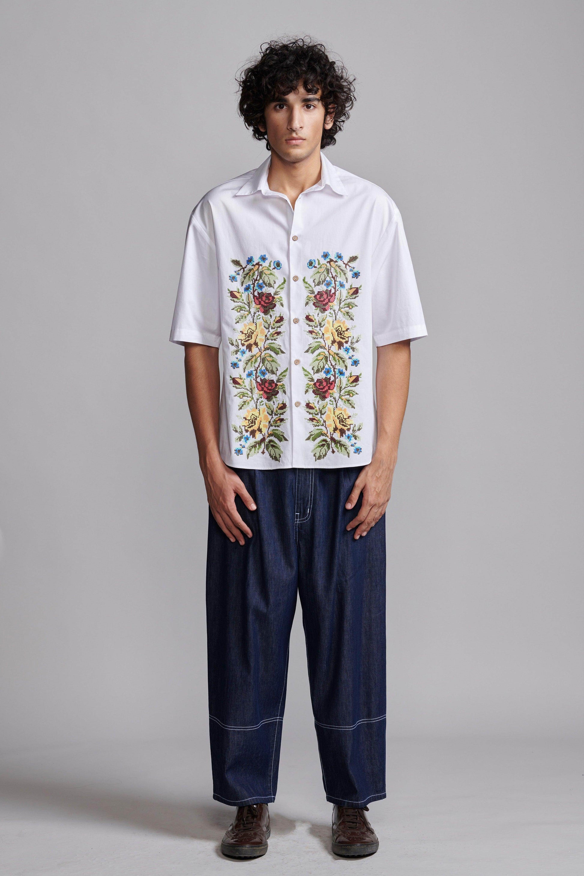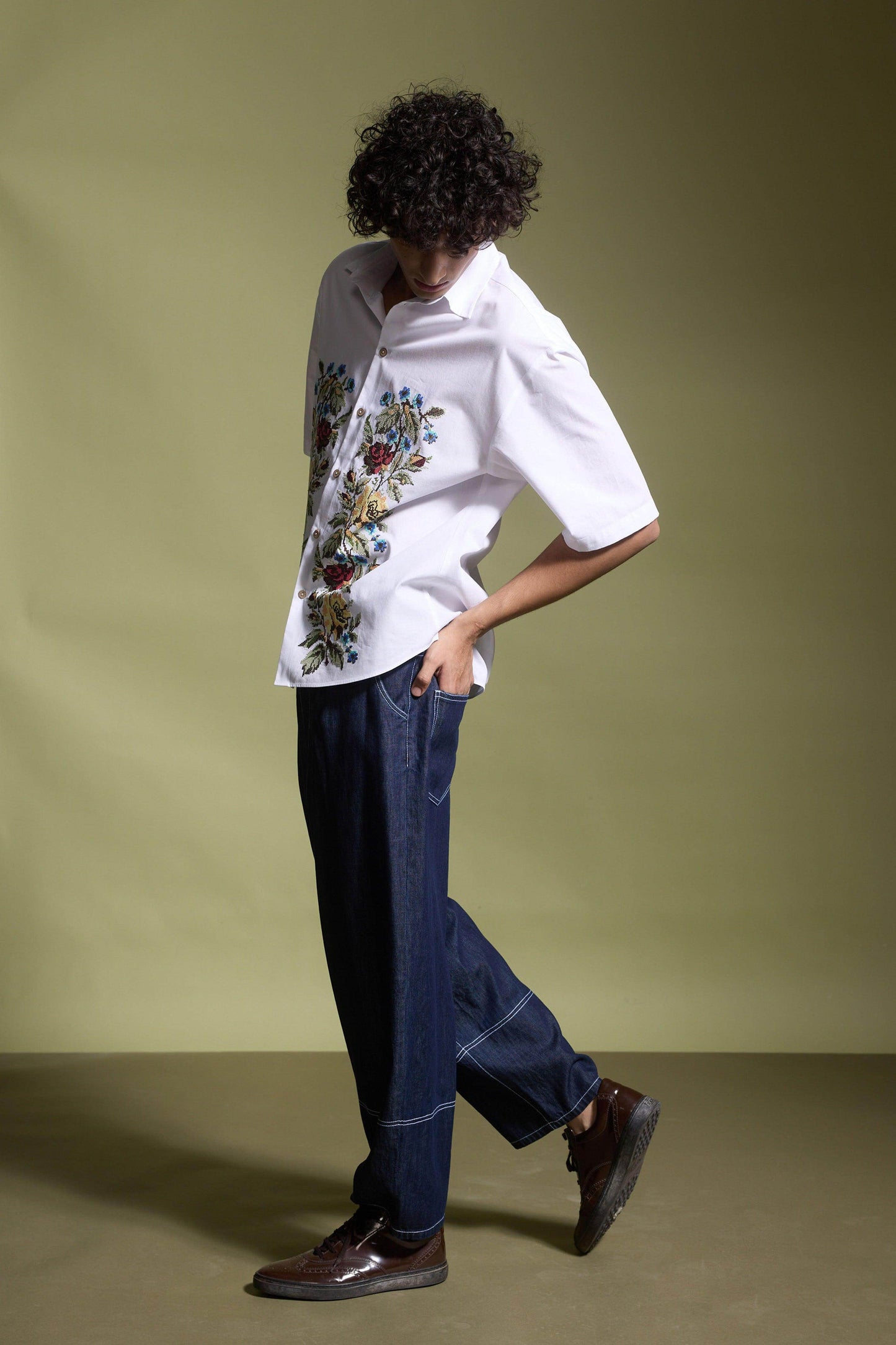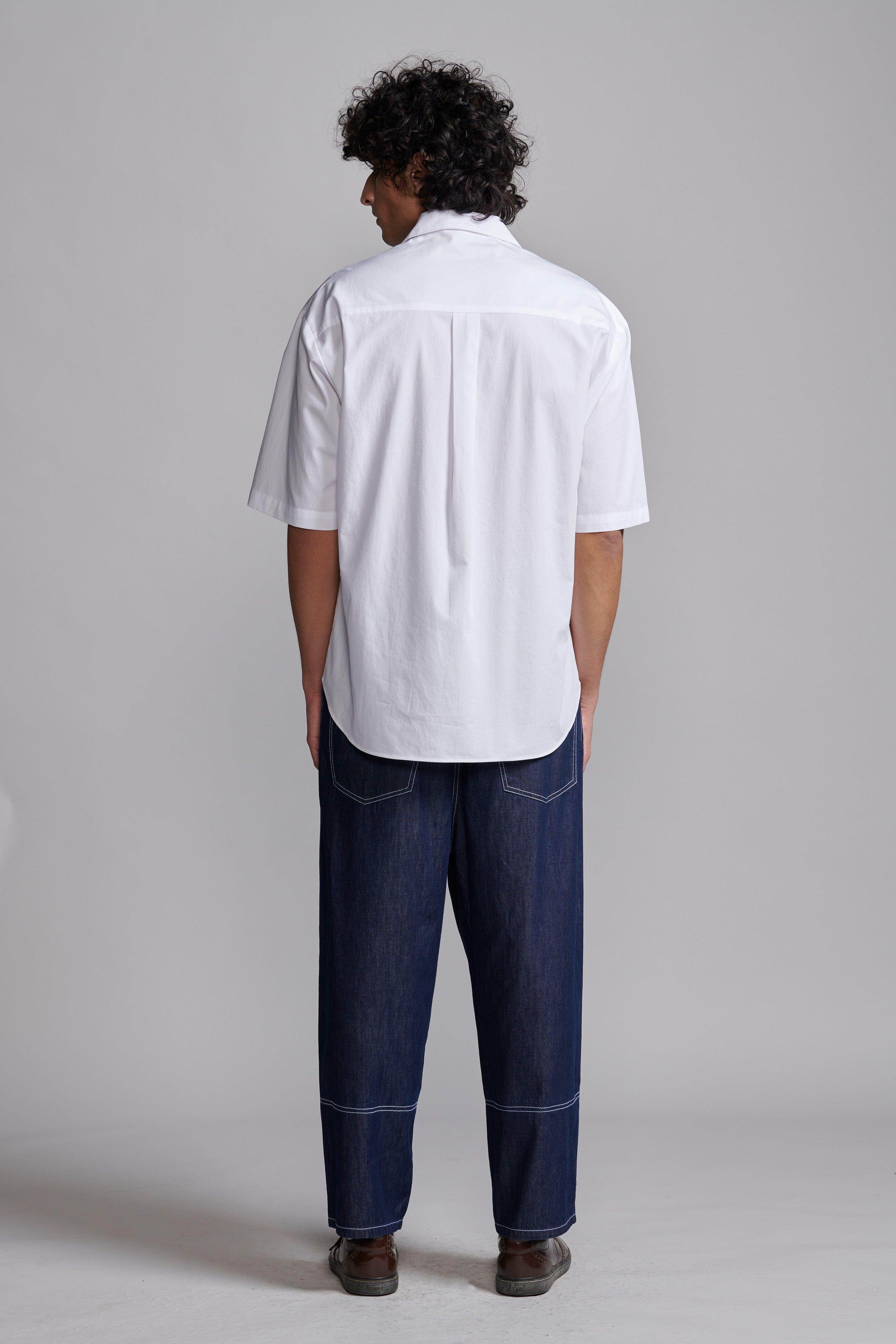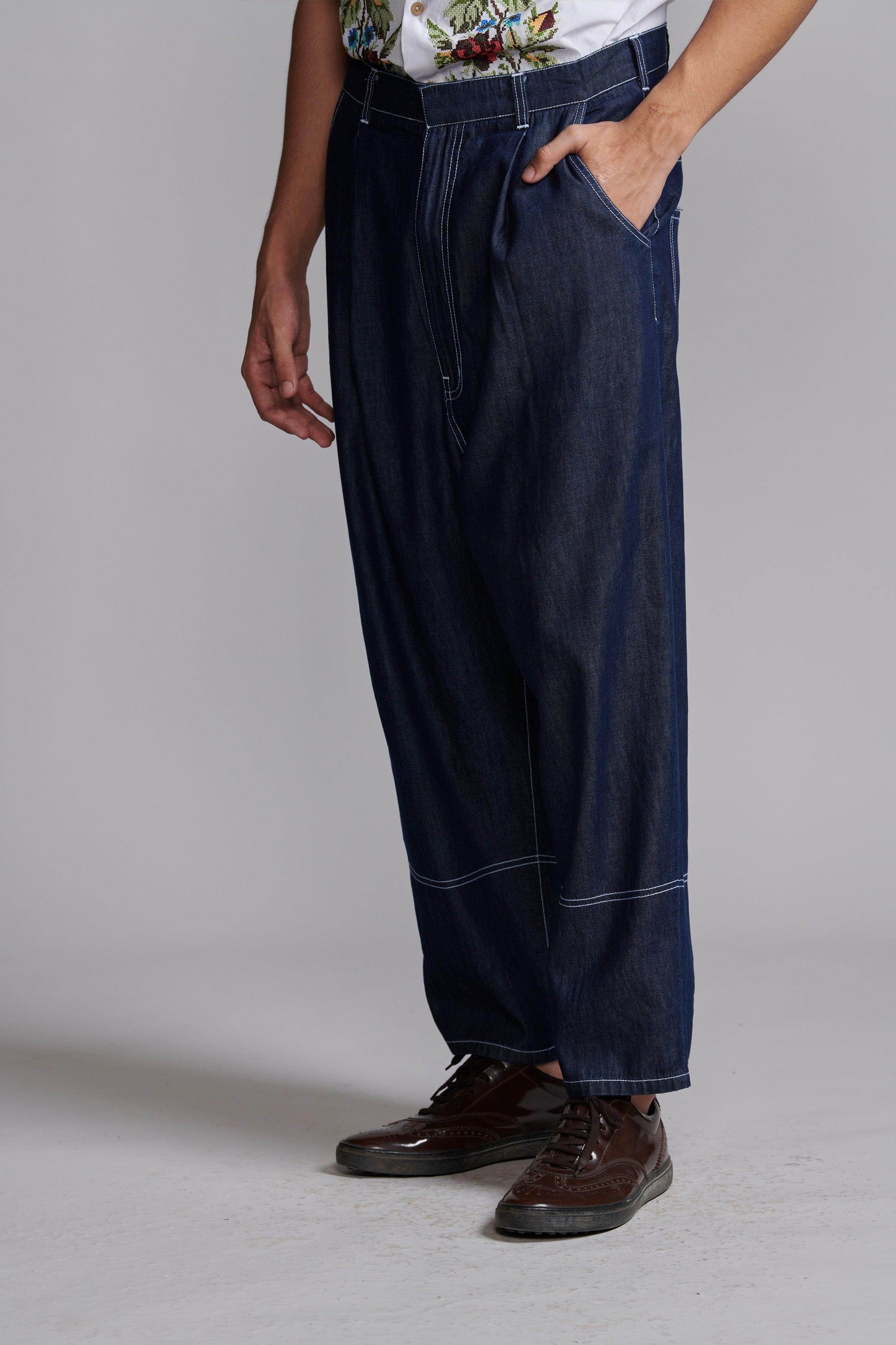 Washed cotton denim pants in a structured boxy fit with contrast off-white stitch detailing on the bottom and seams. Features a zip and hook-and-eye closure in the front, flat pleats, belt loops at the waist, and side and back pockets.