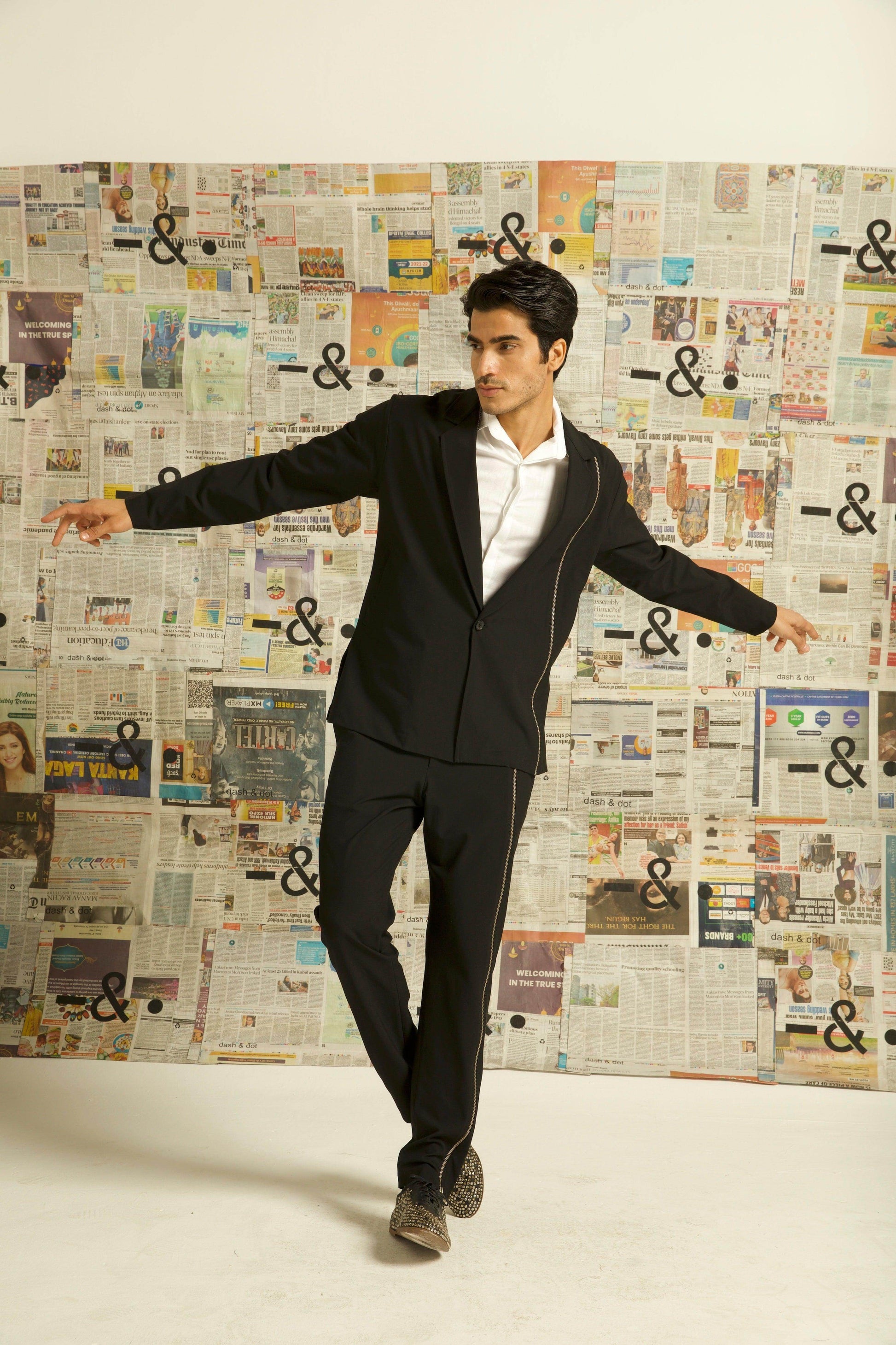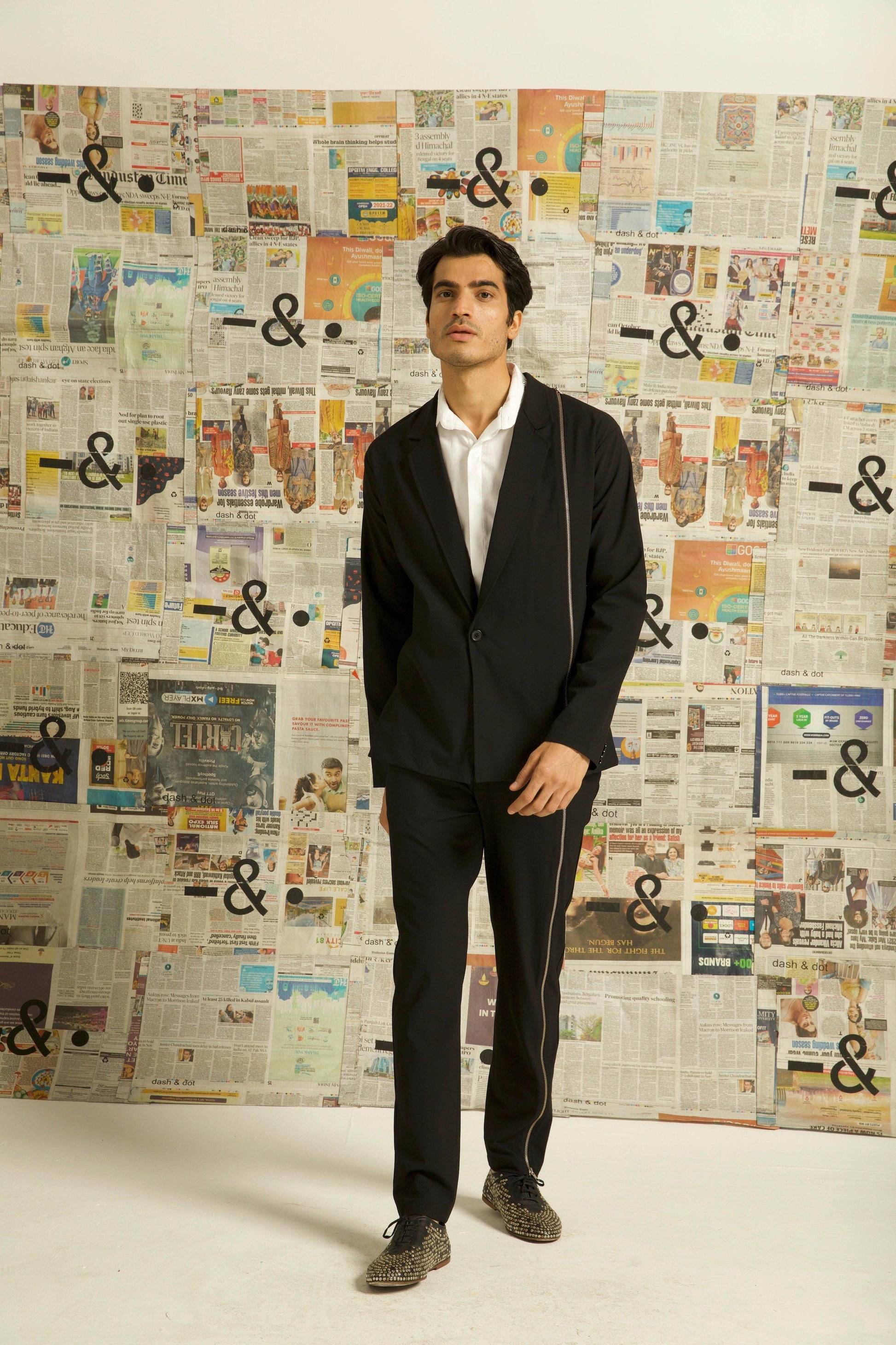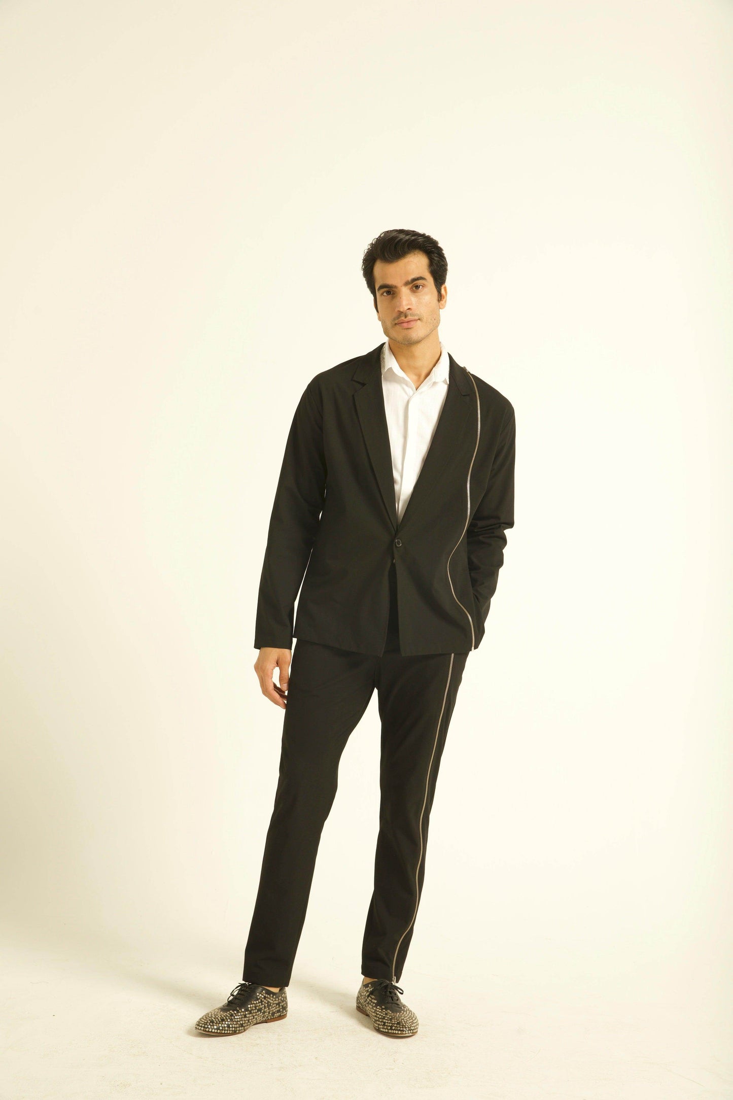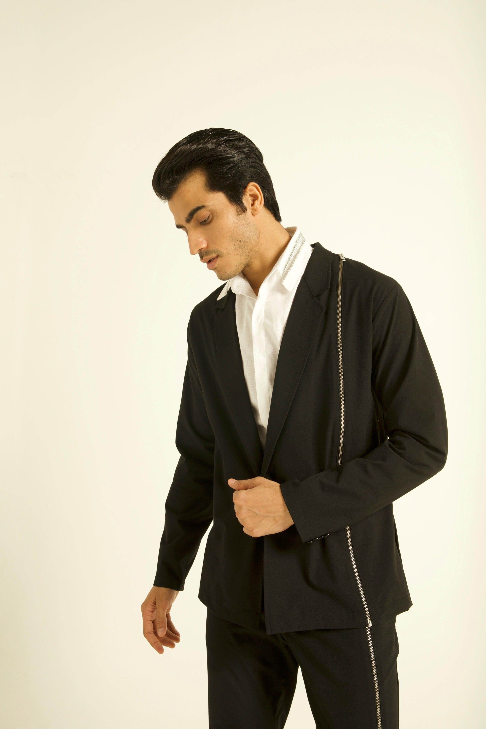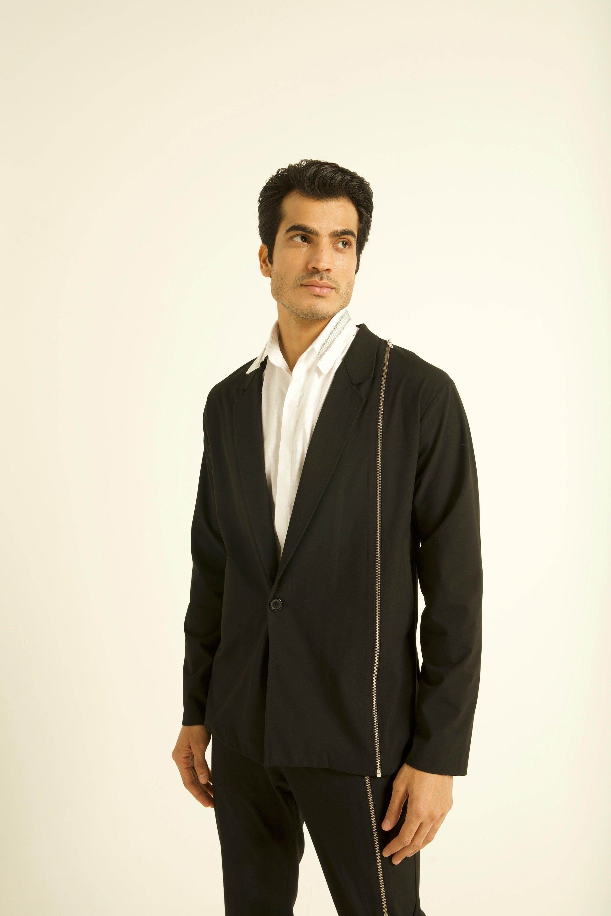 Single button blazer with a zipper detaling down the wearer's left side. Unlined and deconstructed, regular fit. Made of all weather suiting material.