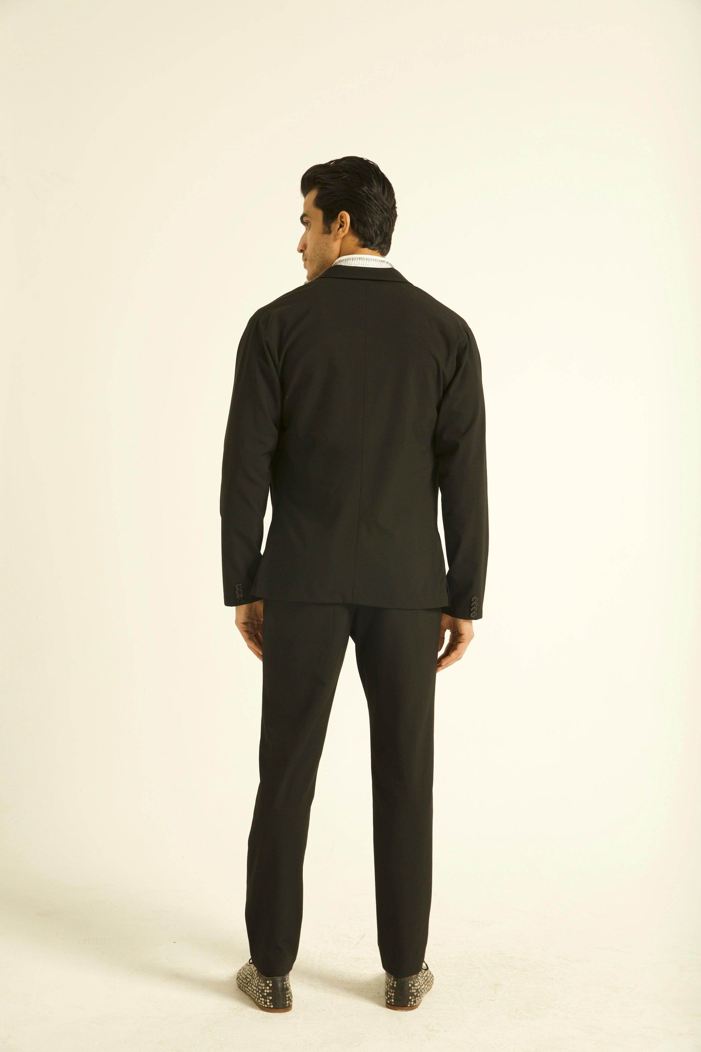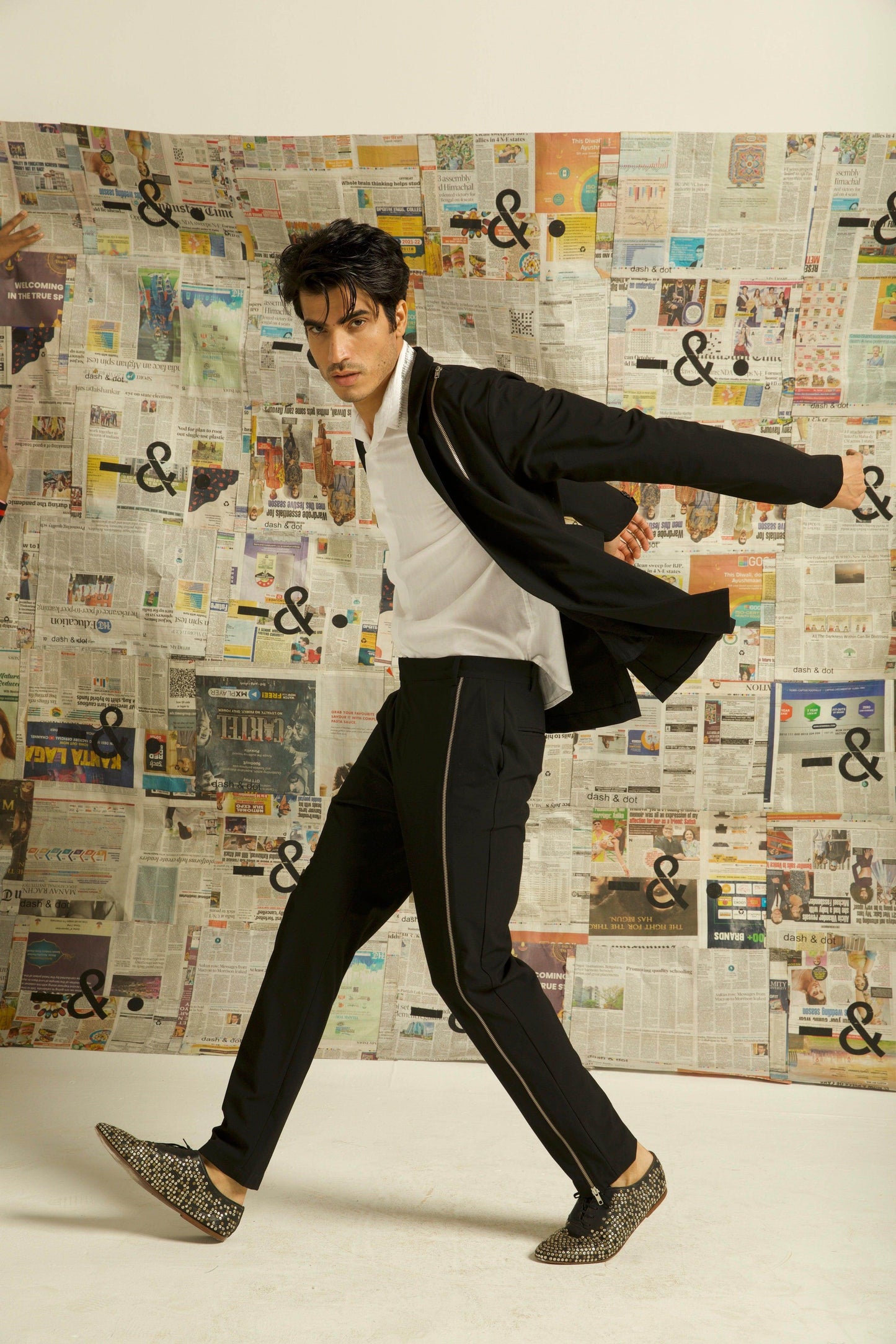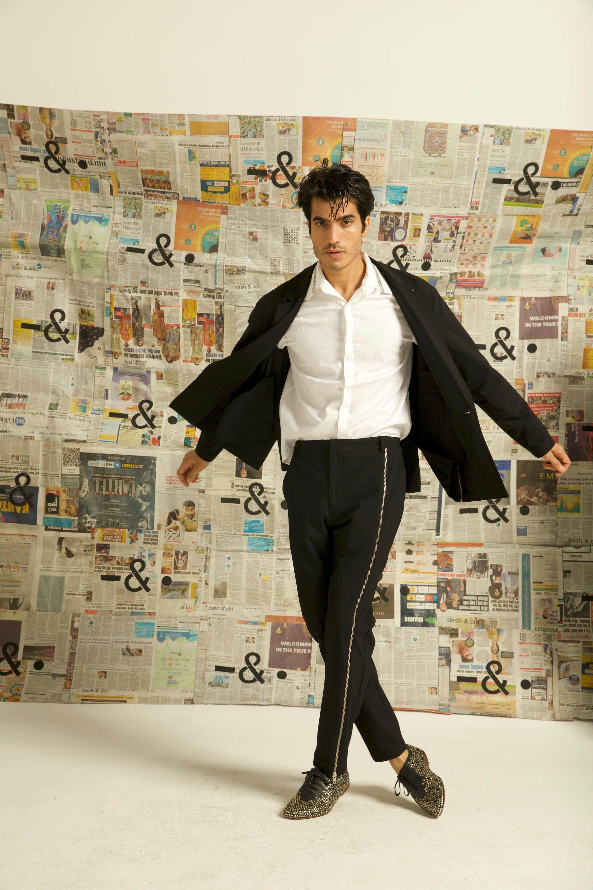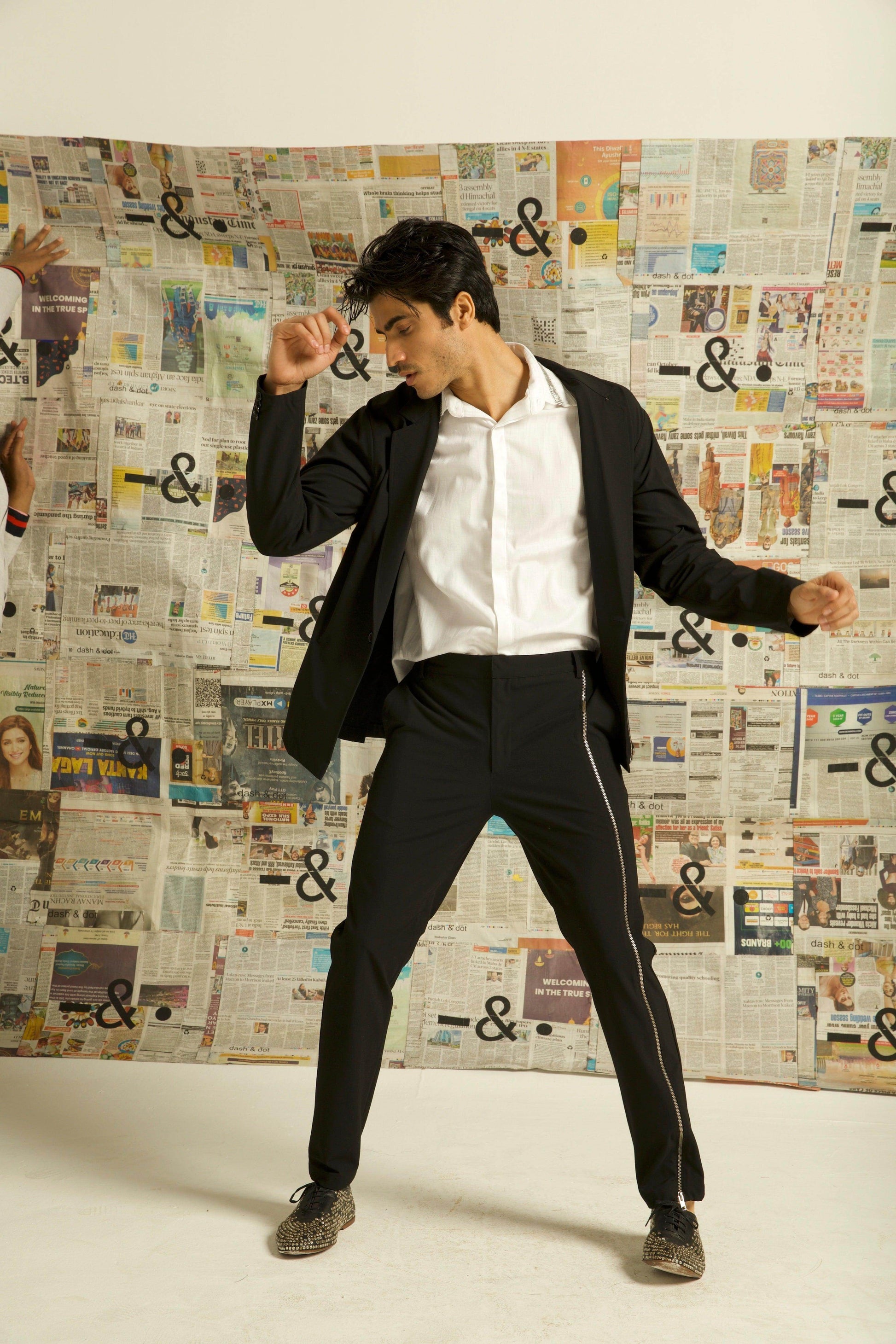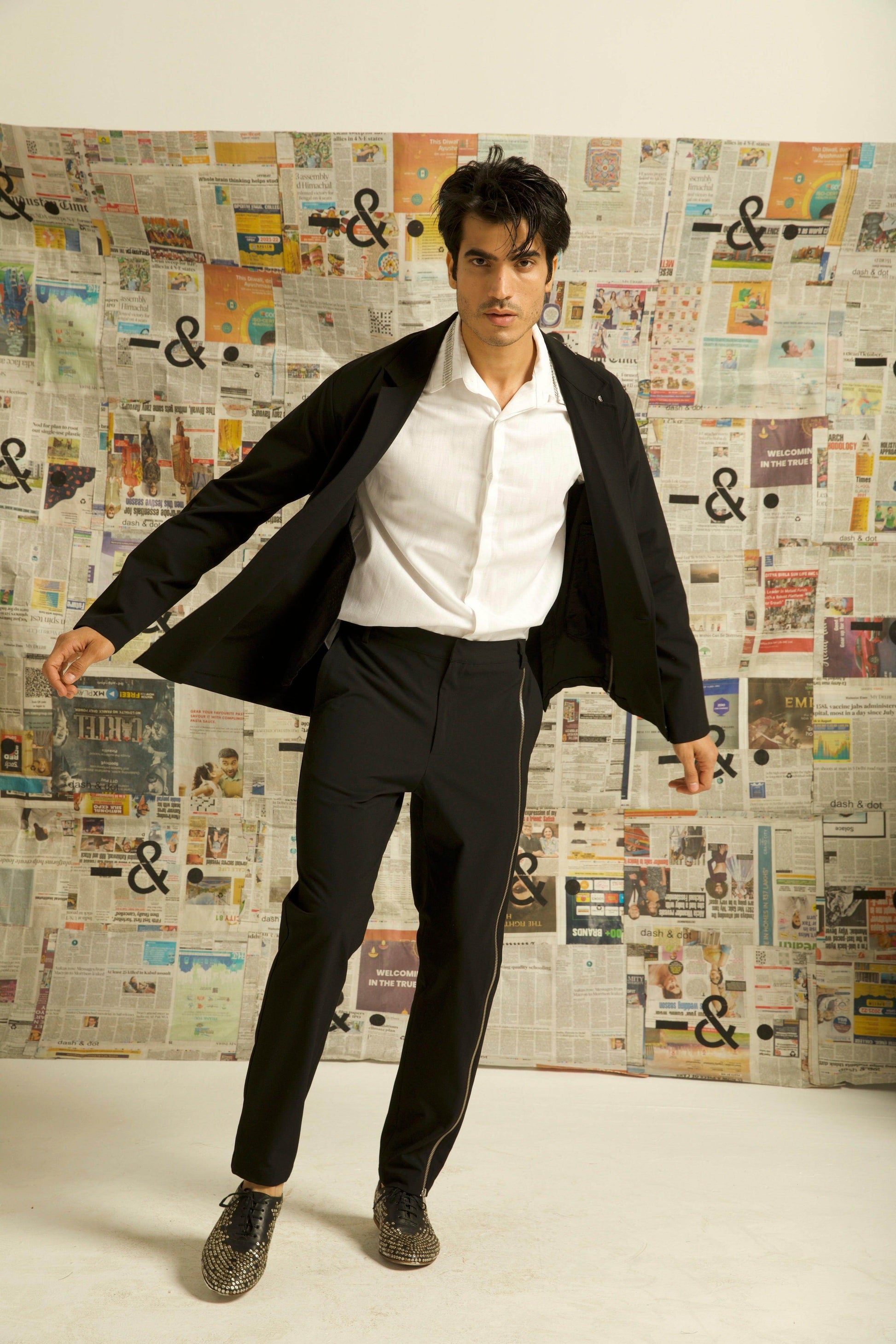 Single button blazer with a zipper detaling down the wearer's left side. Unlined and deconstructed, regular fit. Made of all weather suiting material.