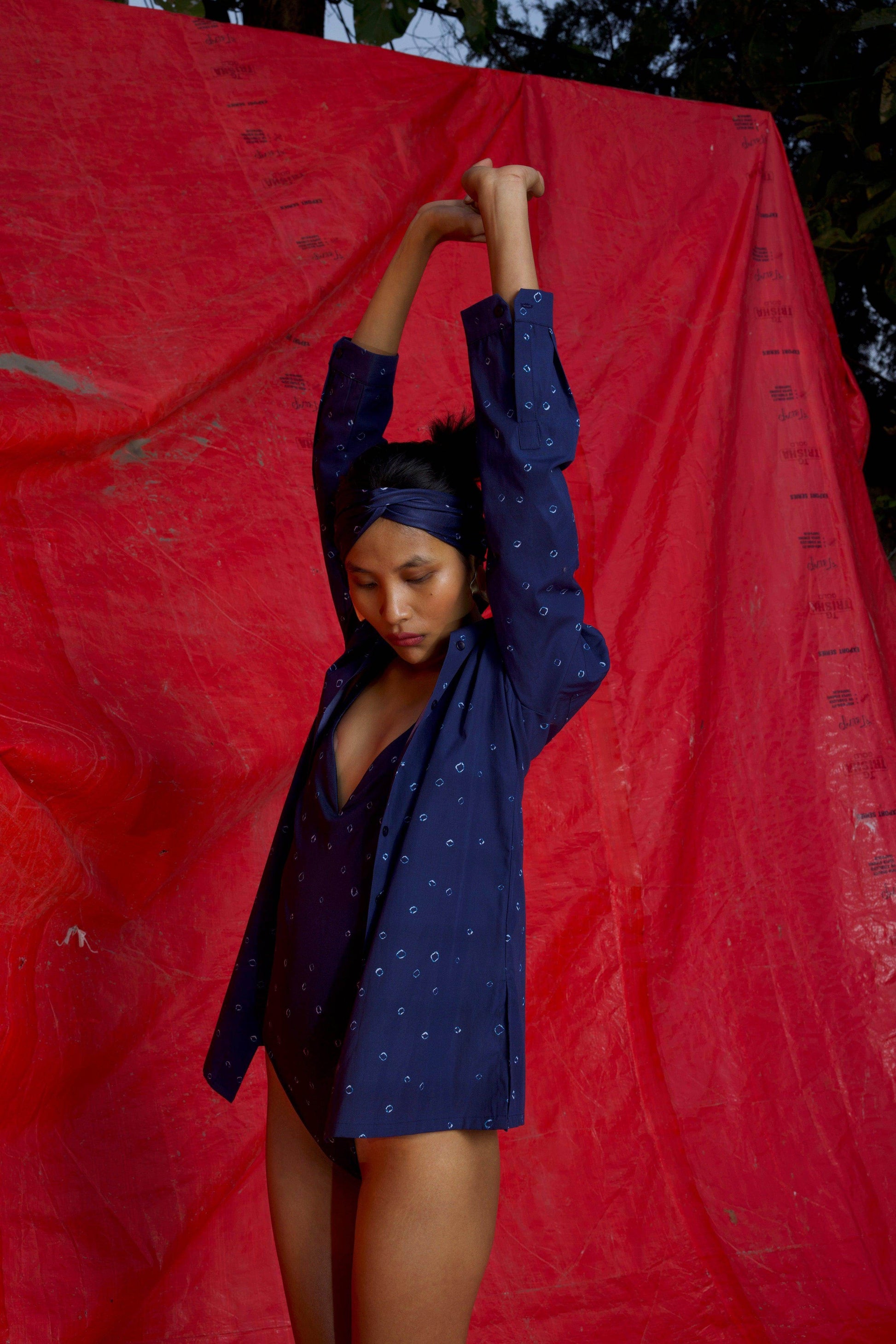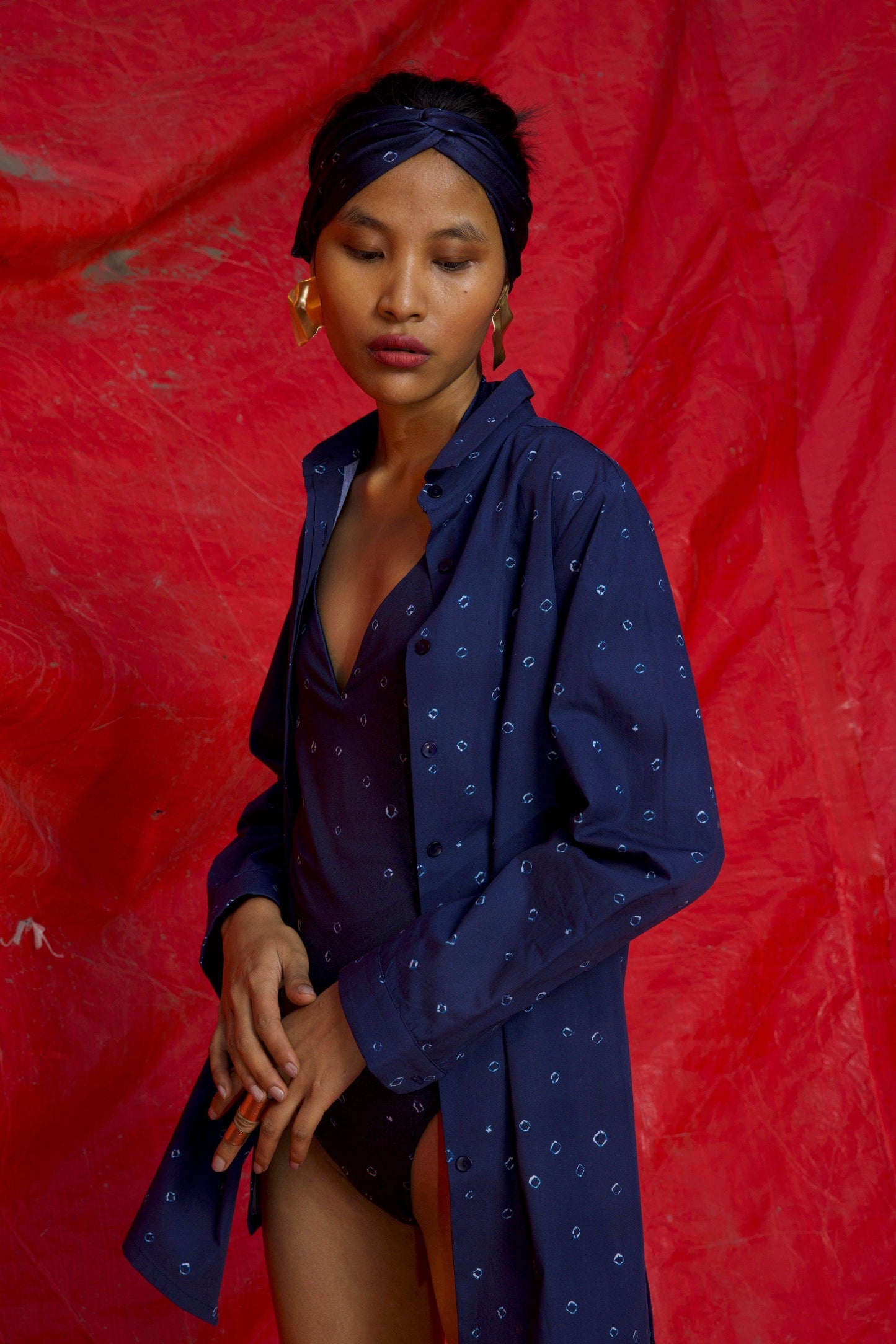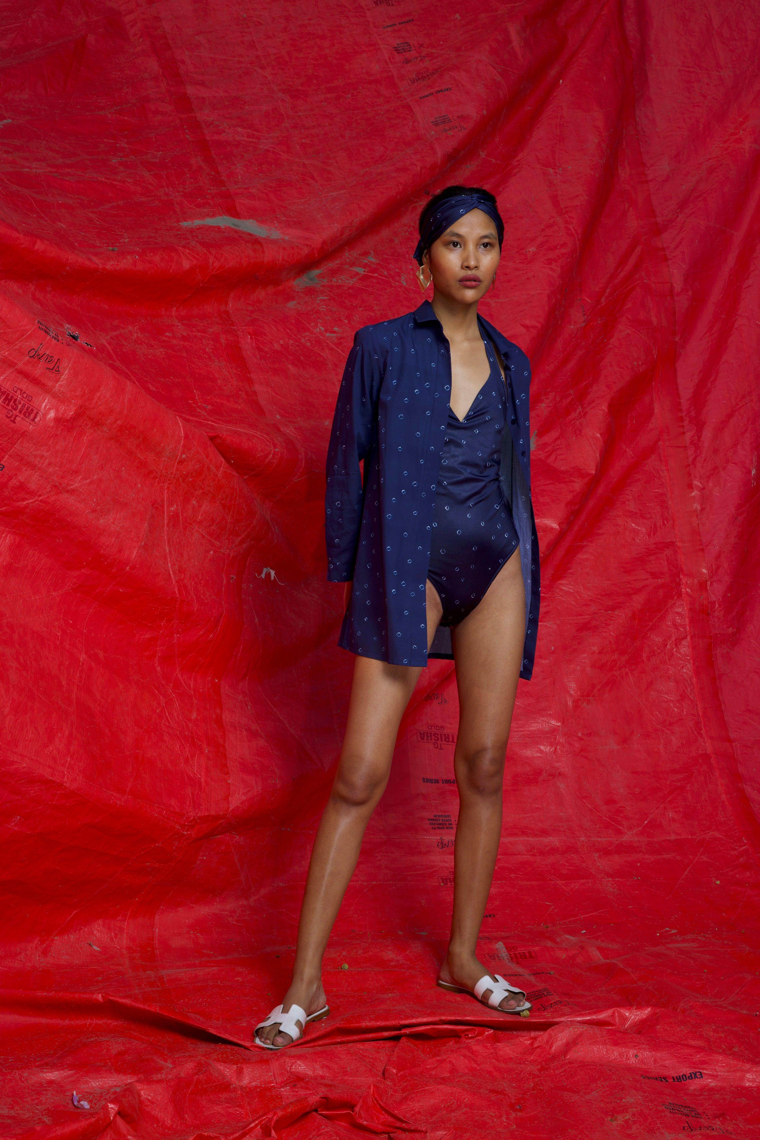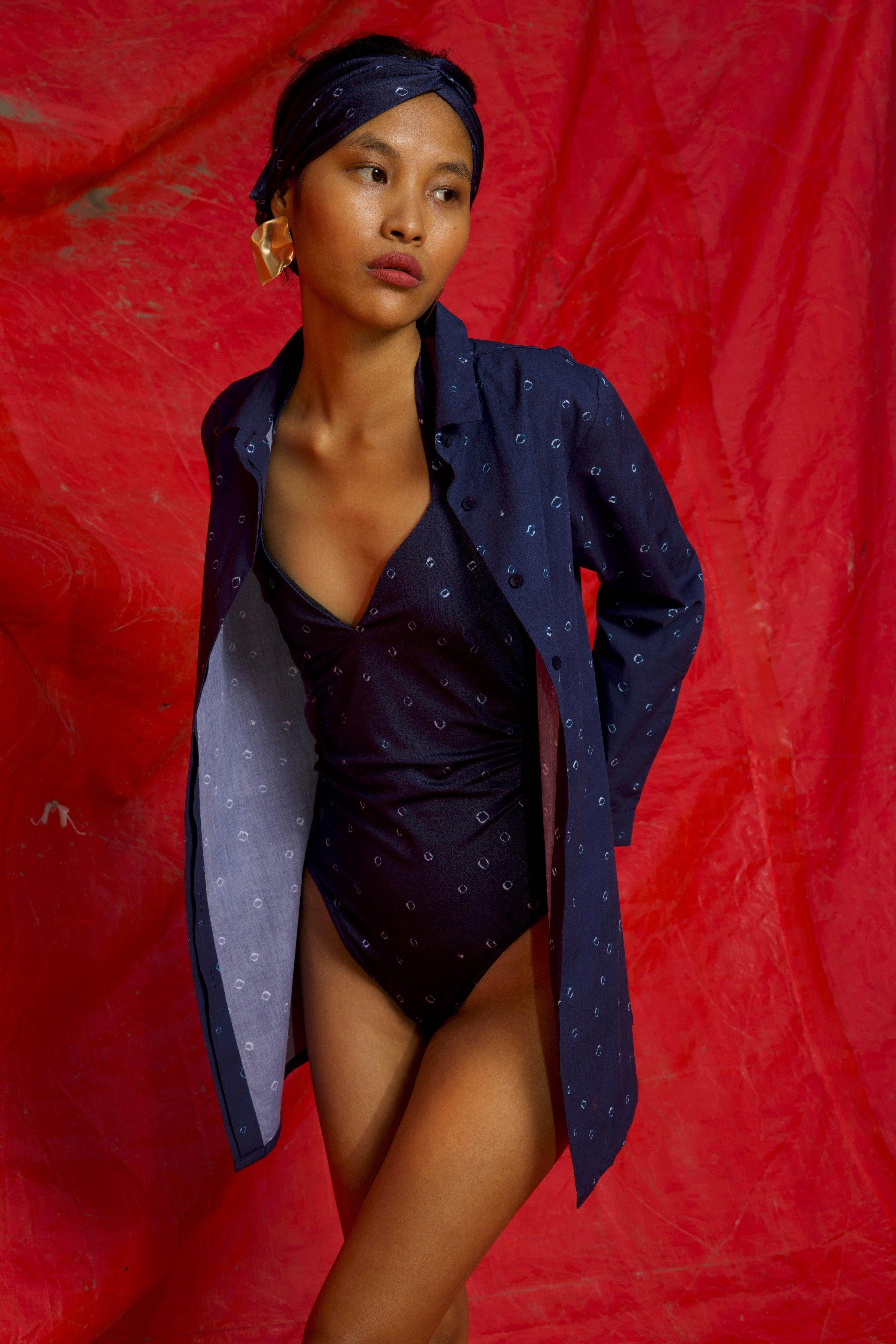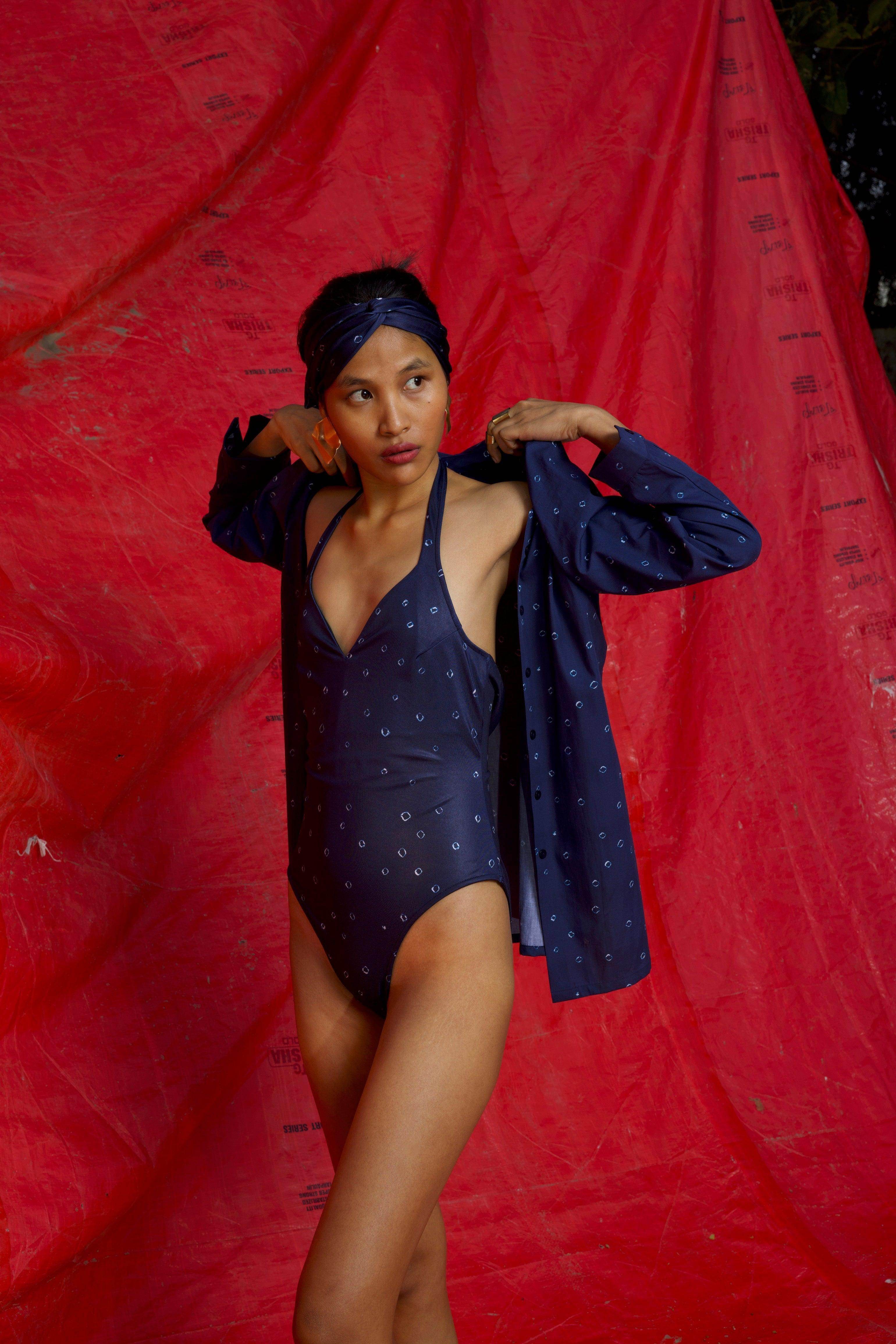 Bandhani printed one-piece swimsuit with halter neck detail. Button closure. Made of high-performance, sustainable techno-fabric; 100% recycled polyester from pre and post-consumer materials. Resistant to chlorine, suntan creams, and oils.