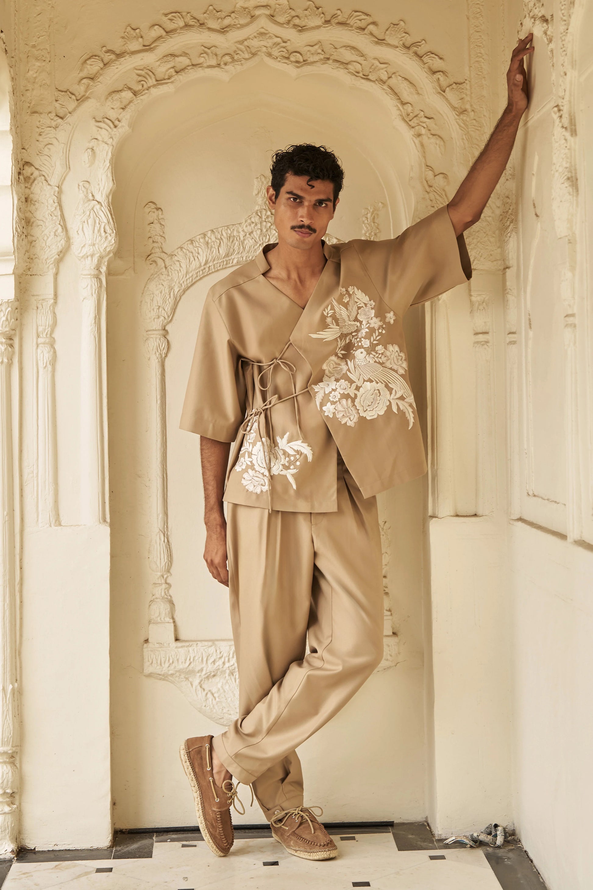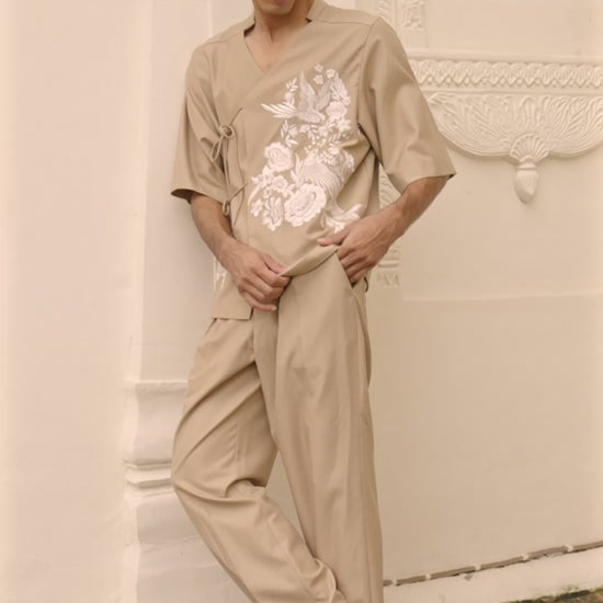 Khaki tapered pant with front pleats and buttoned cuffs at the hem. Semi-elasticated waistband with front zip closure. Pockets in the sides and patch pockets at the back. Relaxed fit.