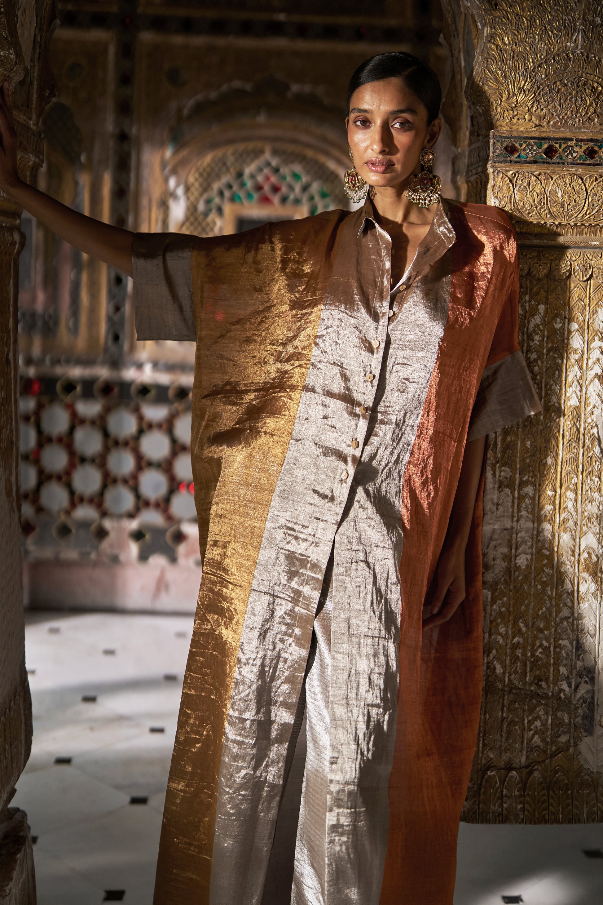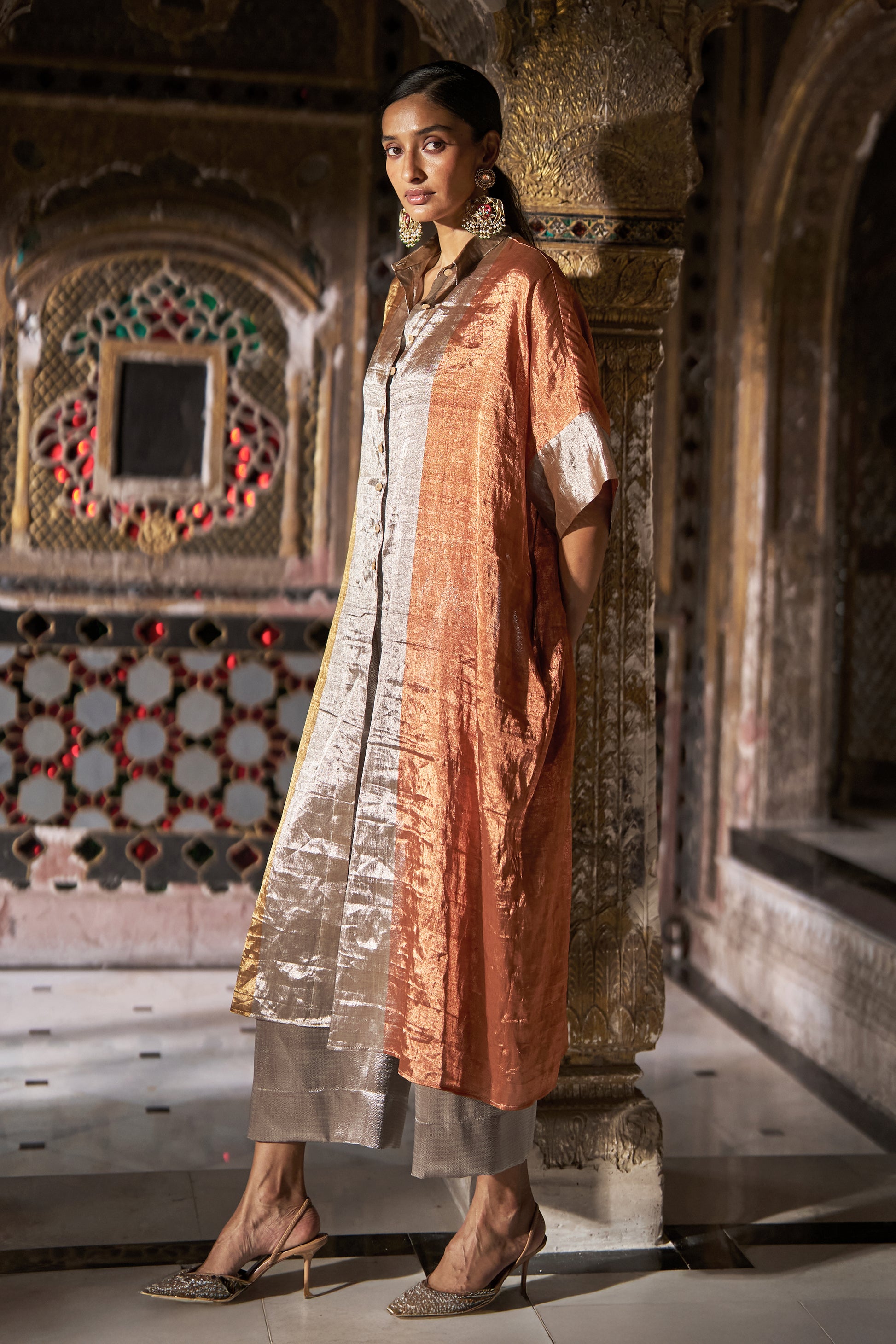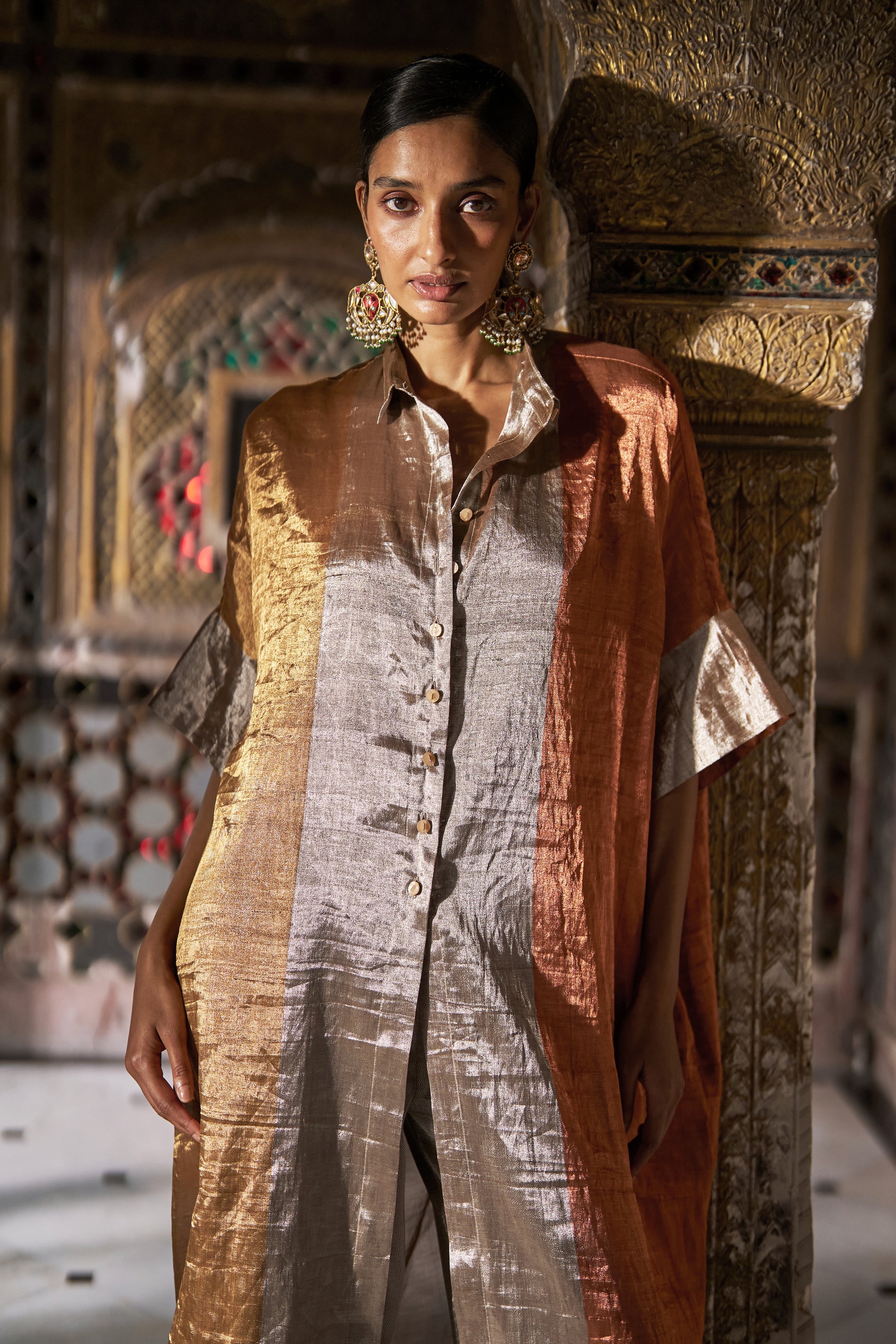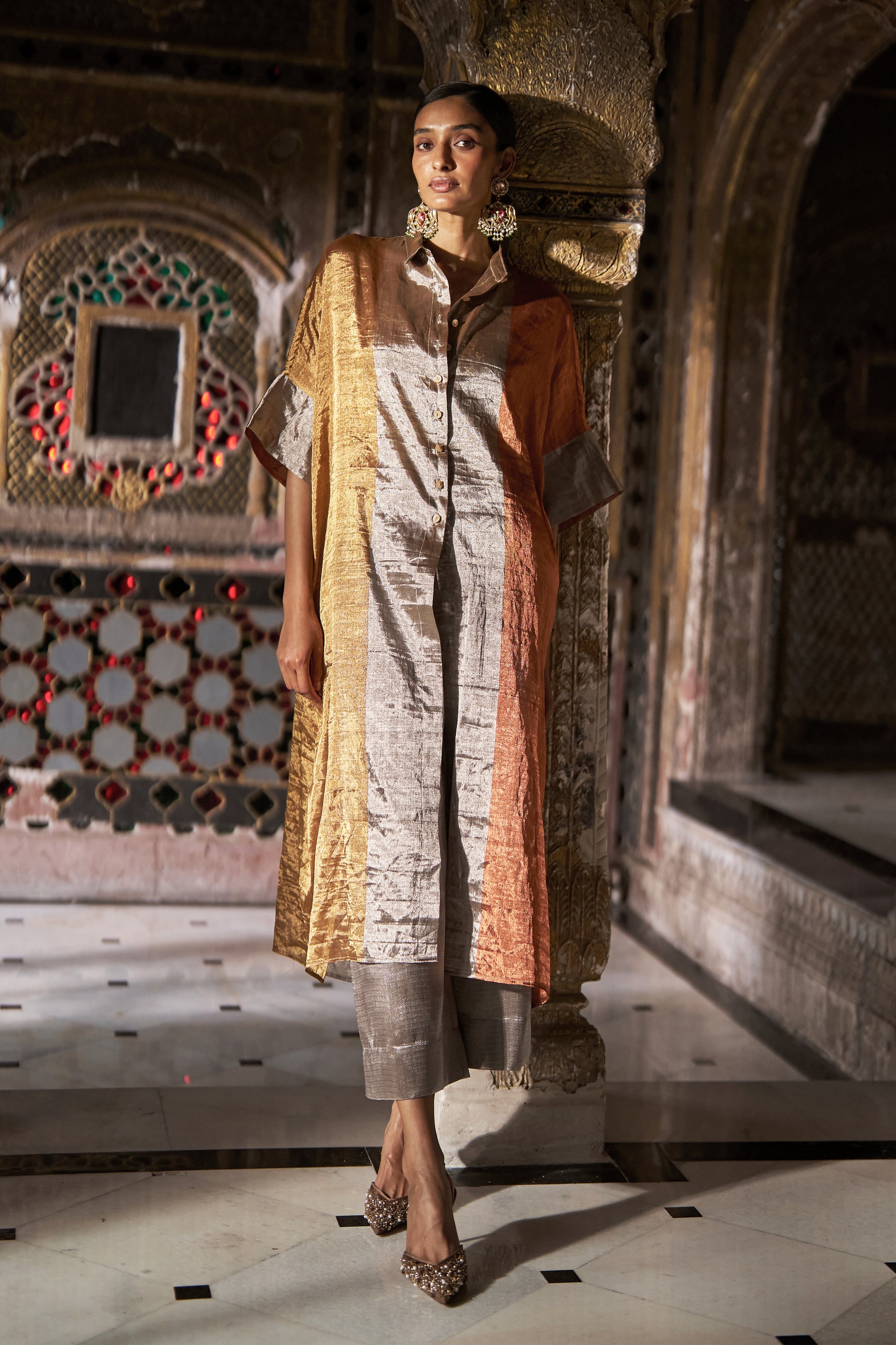 Longline top in Benares tissue with placed metallic stripes in tones of rust, gold, and silver. Boxy fit with dolman sleeves and exaggerated half-sleeve cuffs. Shirt collar with front closure in polished marble buttons with gold inlay. Relaxed fit. Comes with a slip. Paired with complementary straight-cut pant in self-tonal silver herringbone brocade jacquard. Soft construction with an elasticated waistband for comfort.