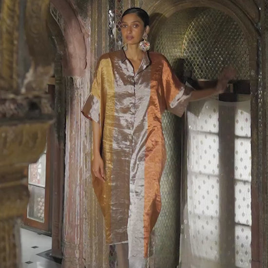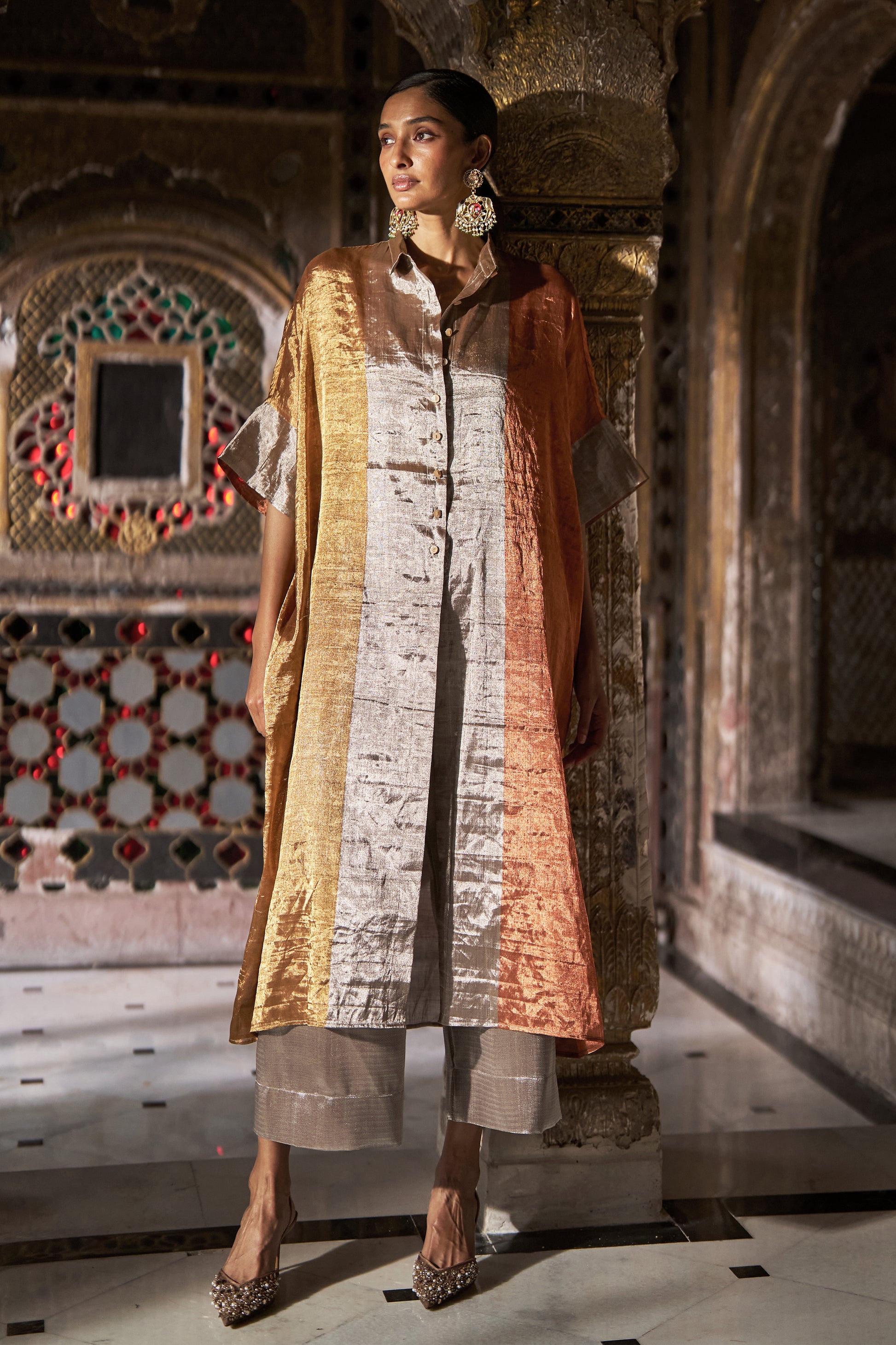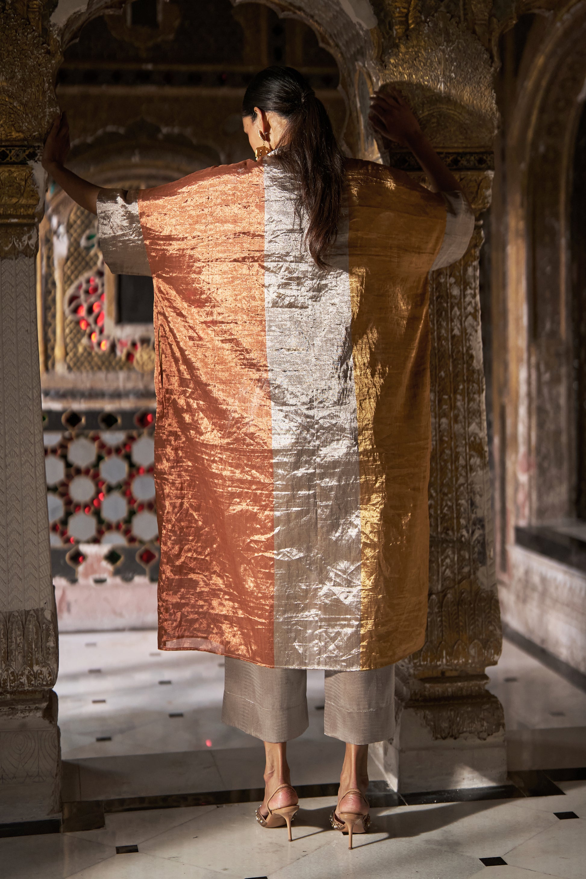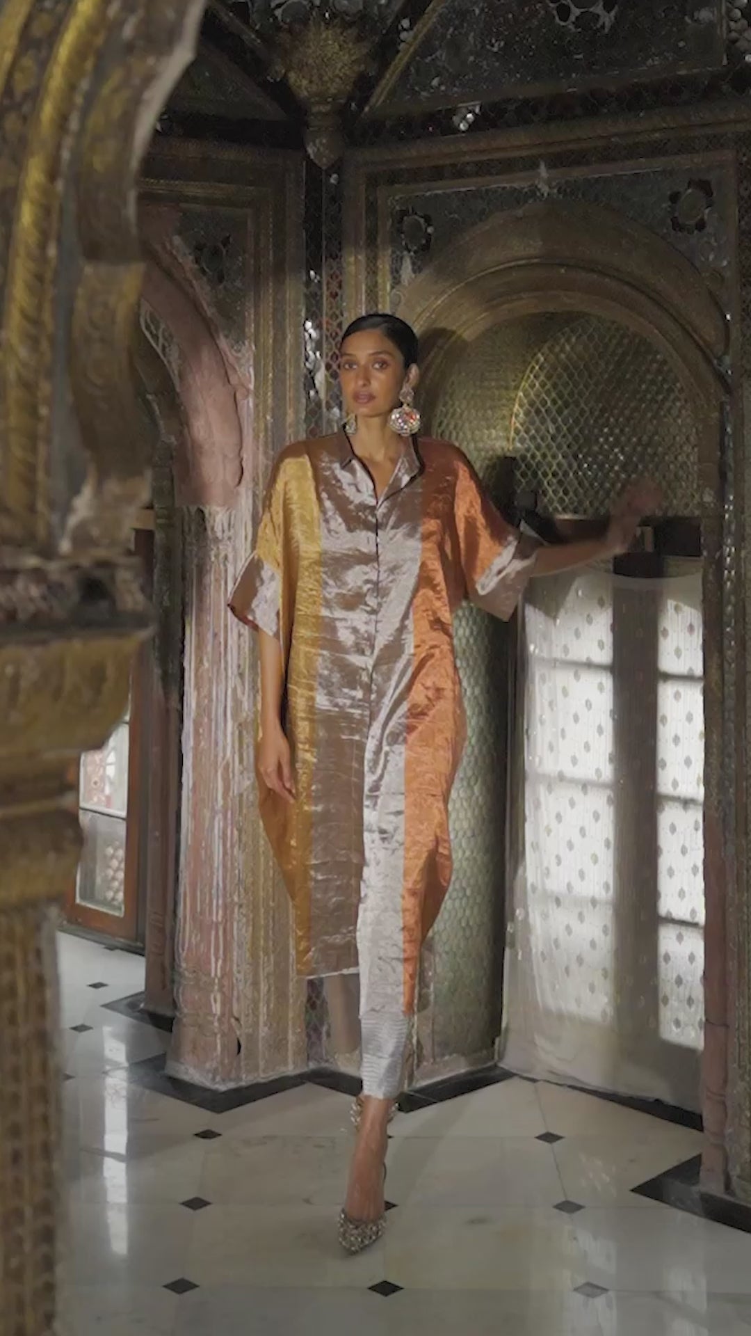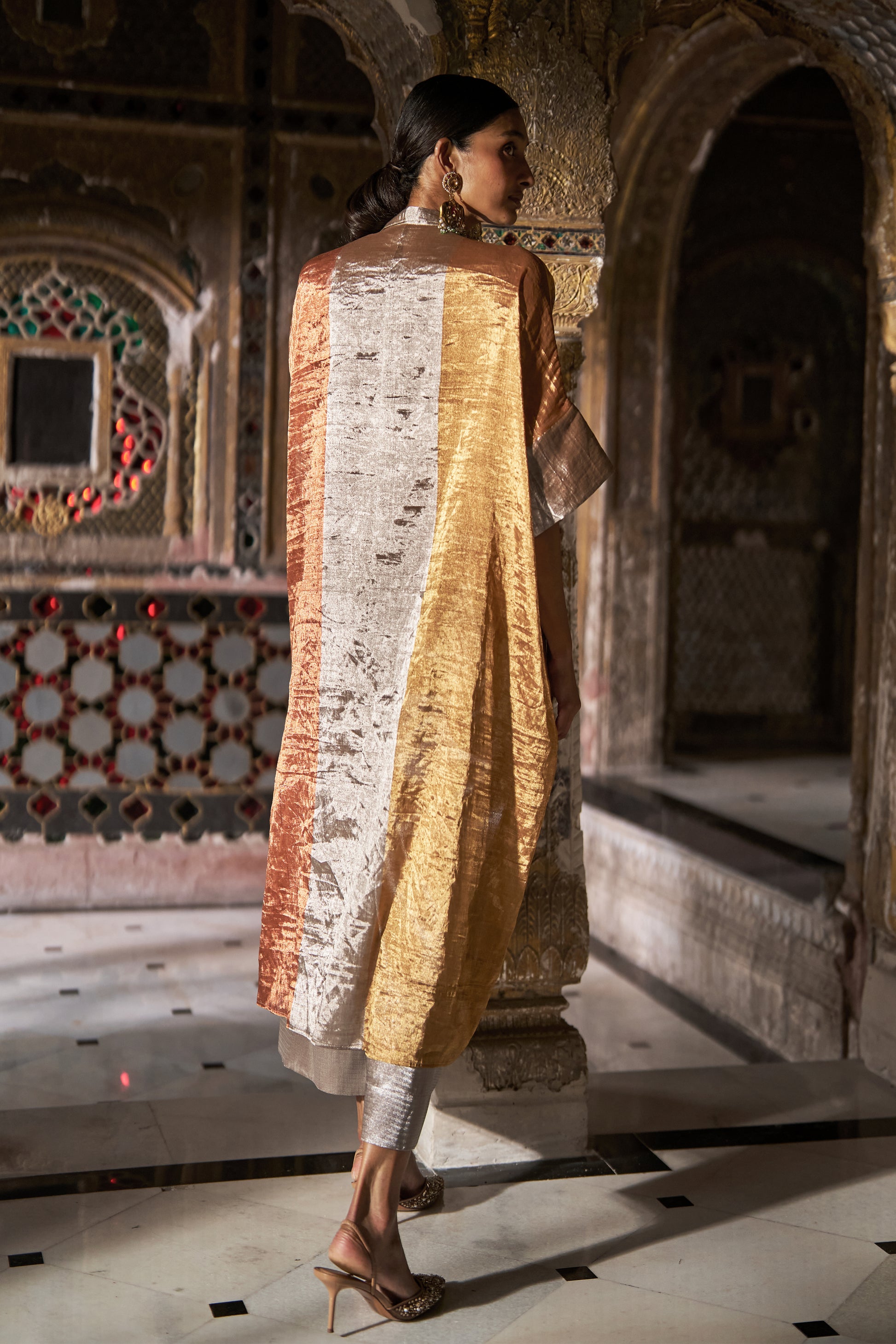Longline top in Benares tissue with placed metallic stripes in tones of rust, gold, and silver. Boxy fit with dolman sleeves and exaggerated half-sleeve cuffs. Shirt collar with front closure in polished marble buttons with gold inlay. Relaxed fit. Comes with a slip. Paired with complementary straight-cut pant in self-tonal silver herringbone brocade jacquard. Soft construction with an elasticated waistband for comfort.