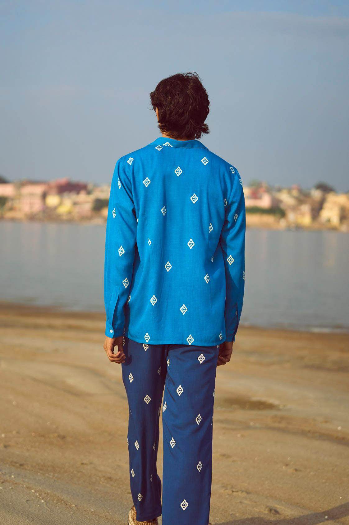 Ink blue straight-fit pants in allover Ikkat-inspired print. Hook and zip closure at the front. Pockets on the side and back. Belt loops.