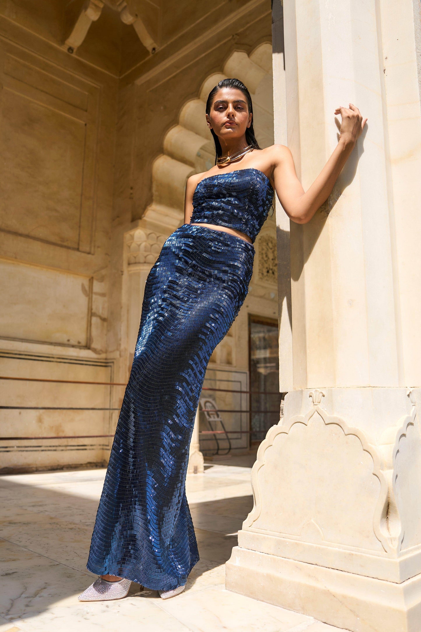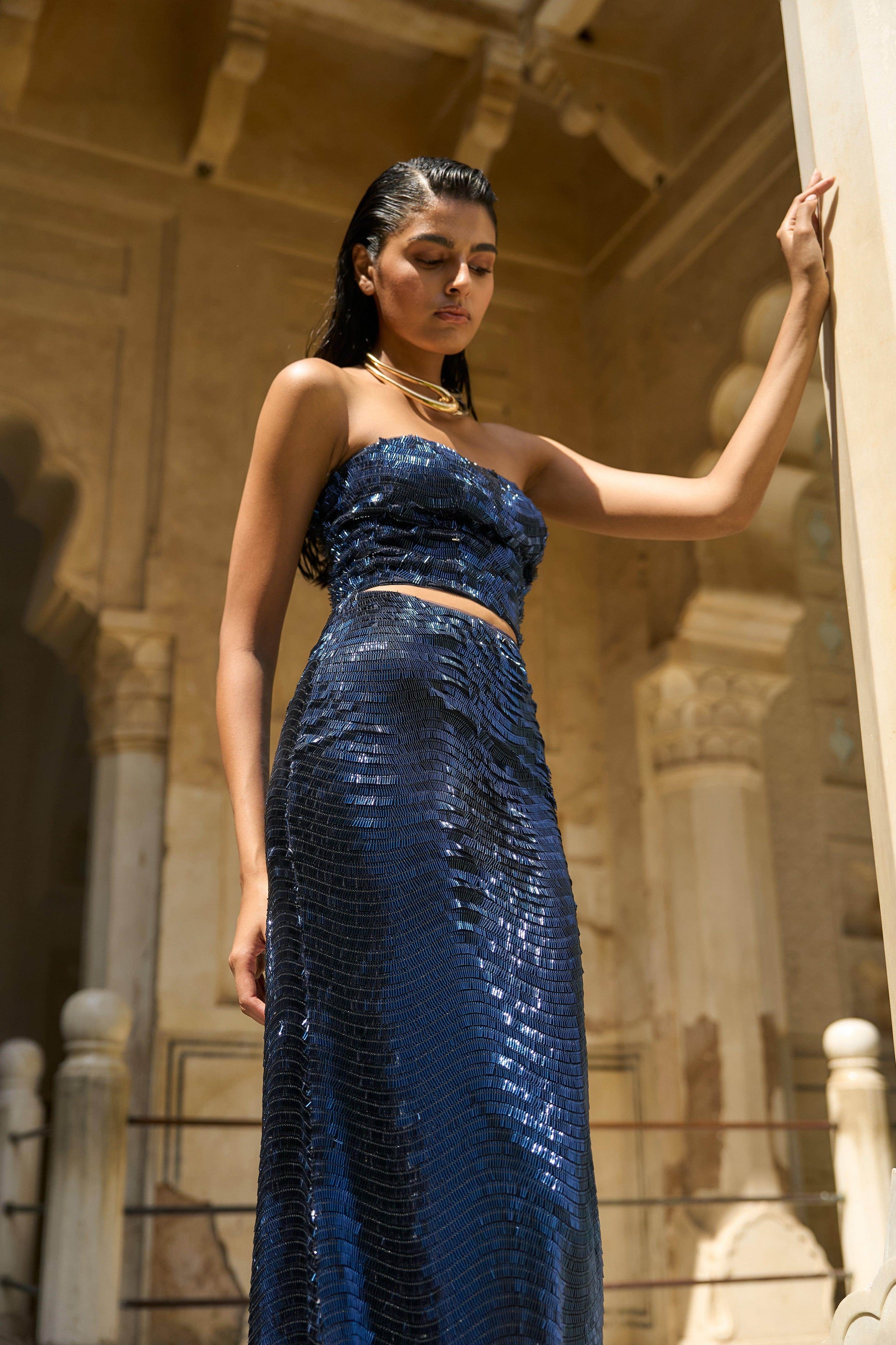 Bandeau bralette in a shimmering blue allover sequin embroidery. Single side sewn pipe bead sequins in a flattering wave pattern. Removable pad pockets. Zipper in the back. Garment is fully lined.