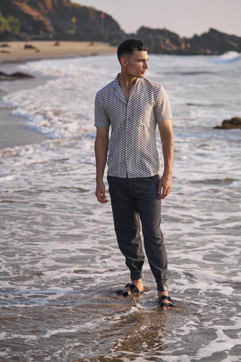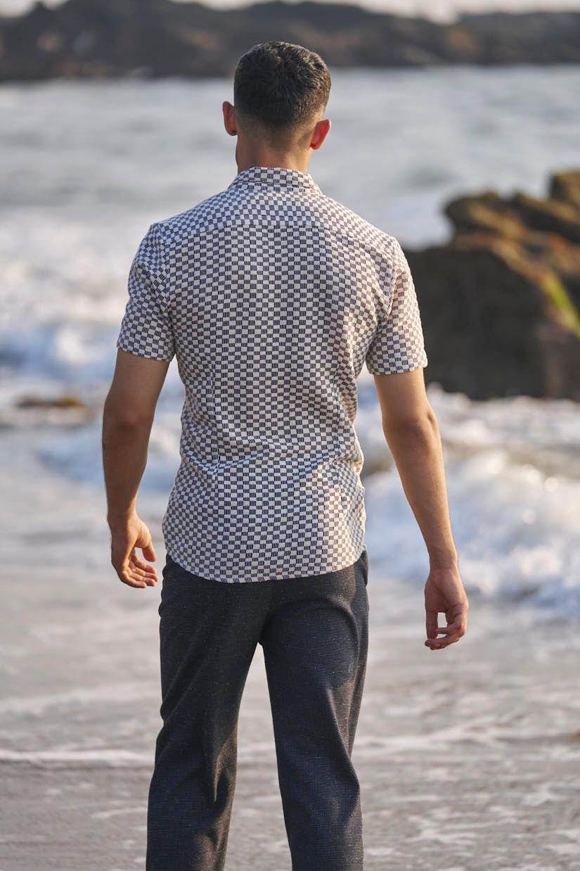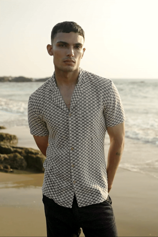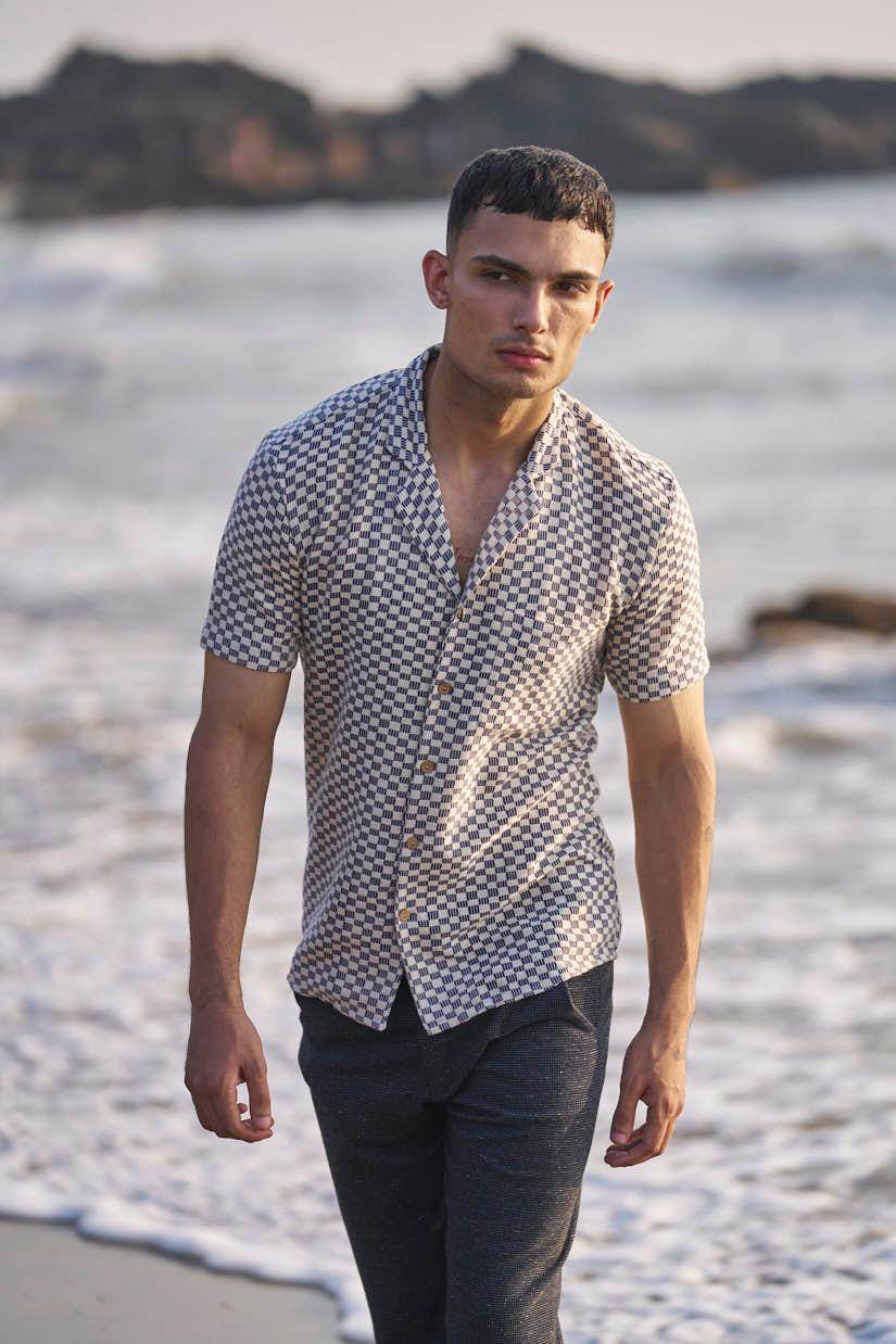 Textured half sleeve shirt in a box check pattern in knitted lace inspired fabric. Cuban collar, half sleeves.