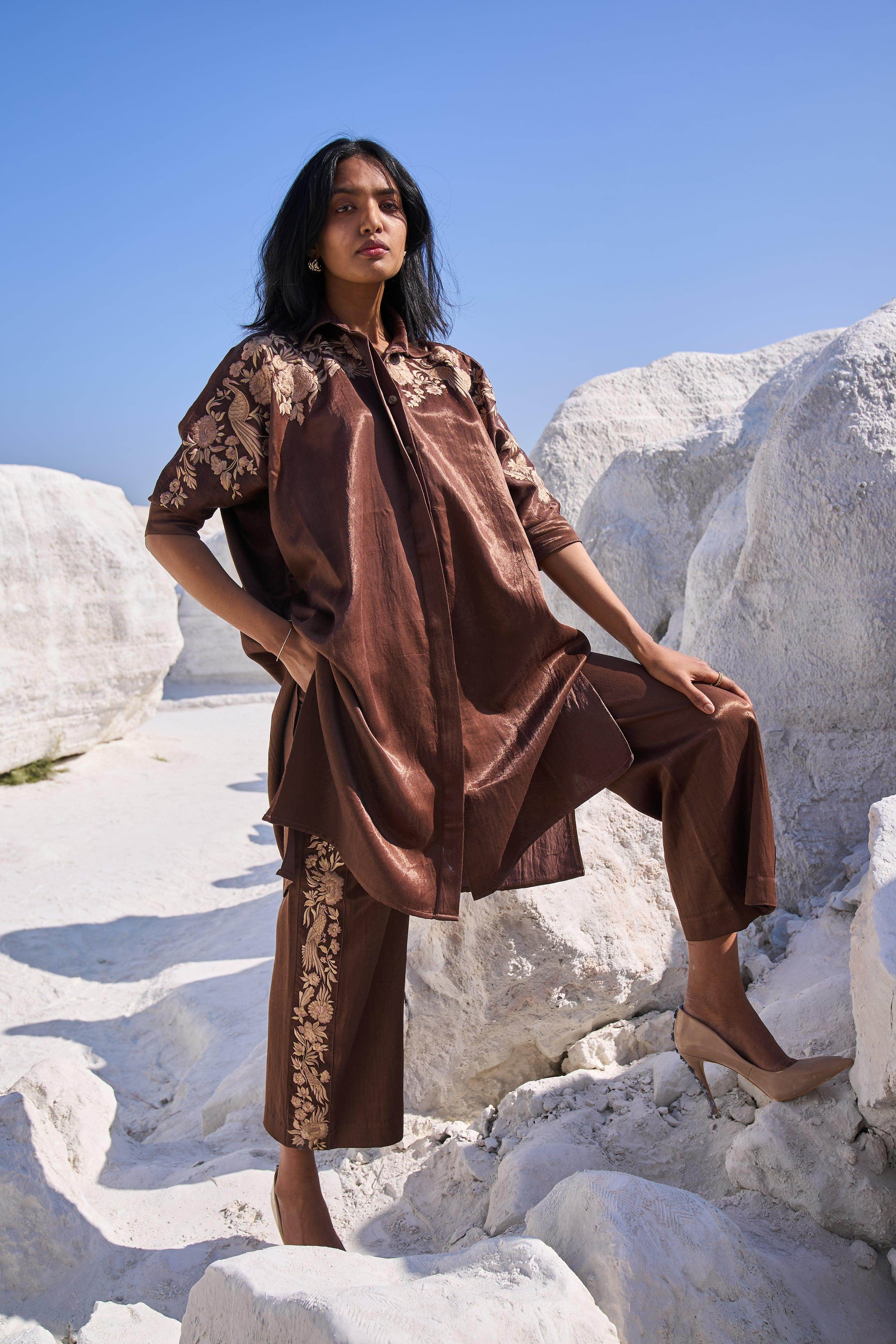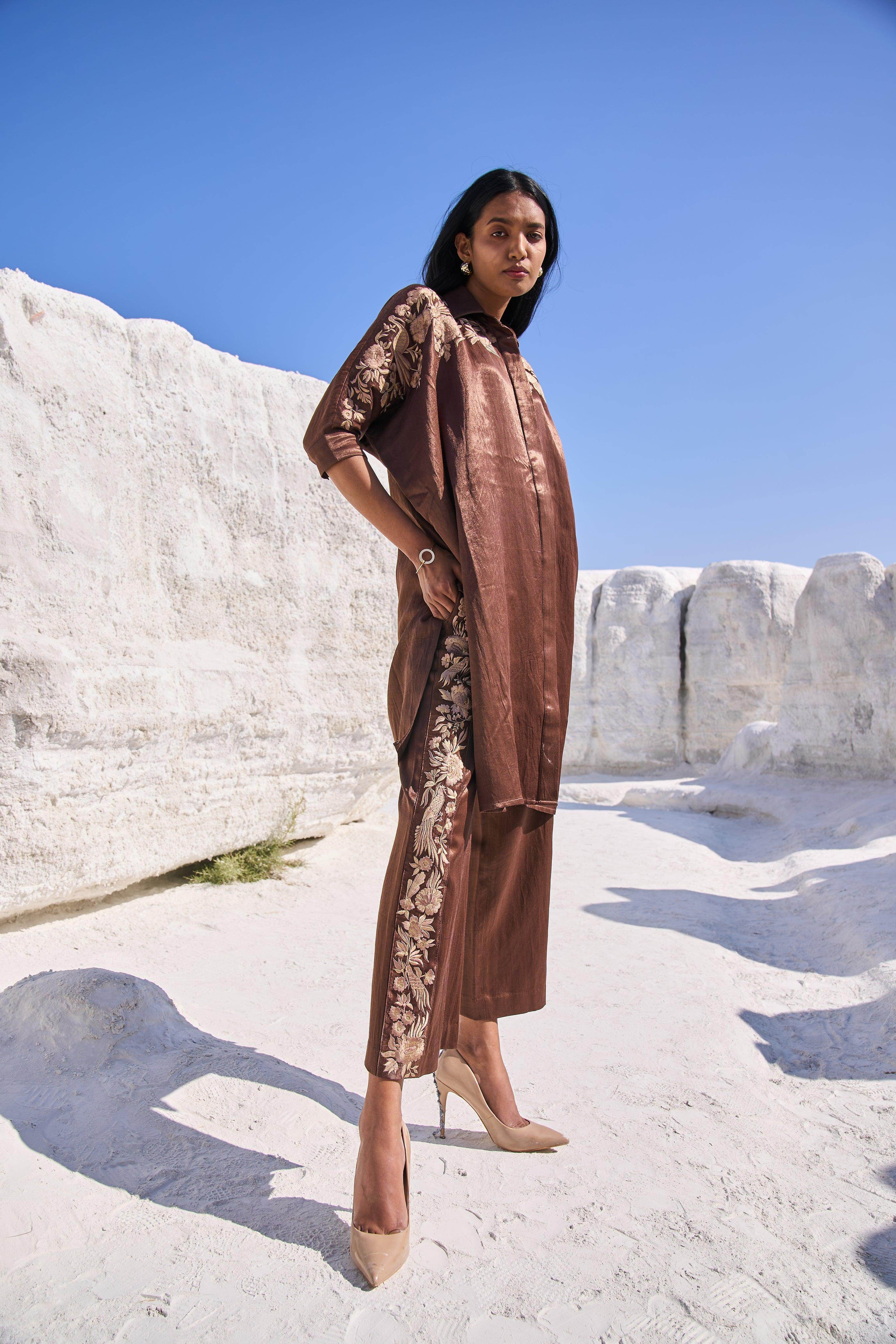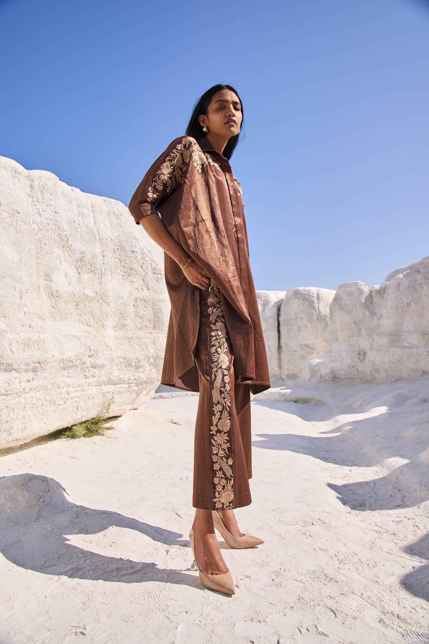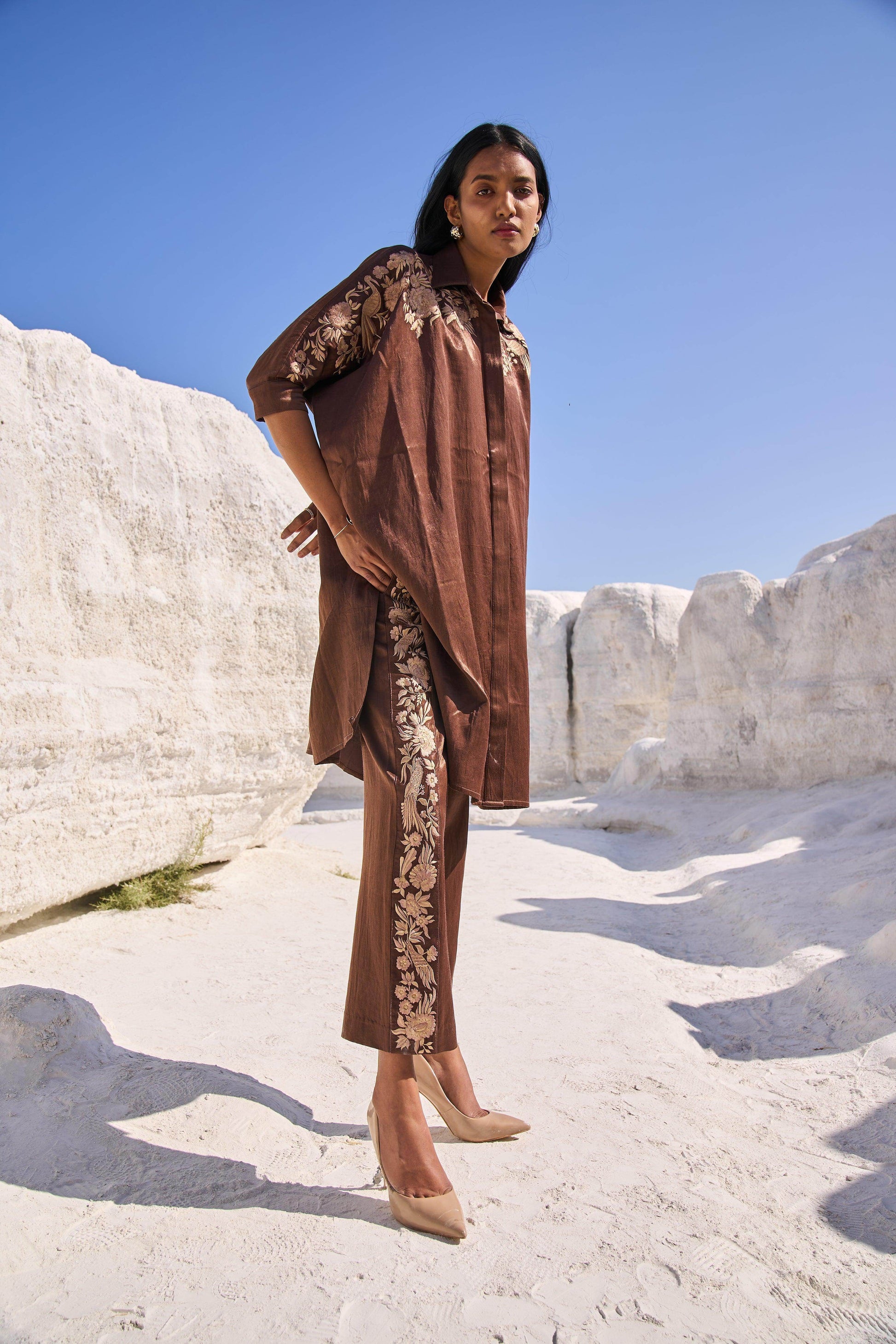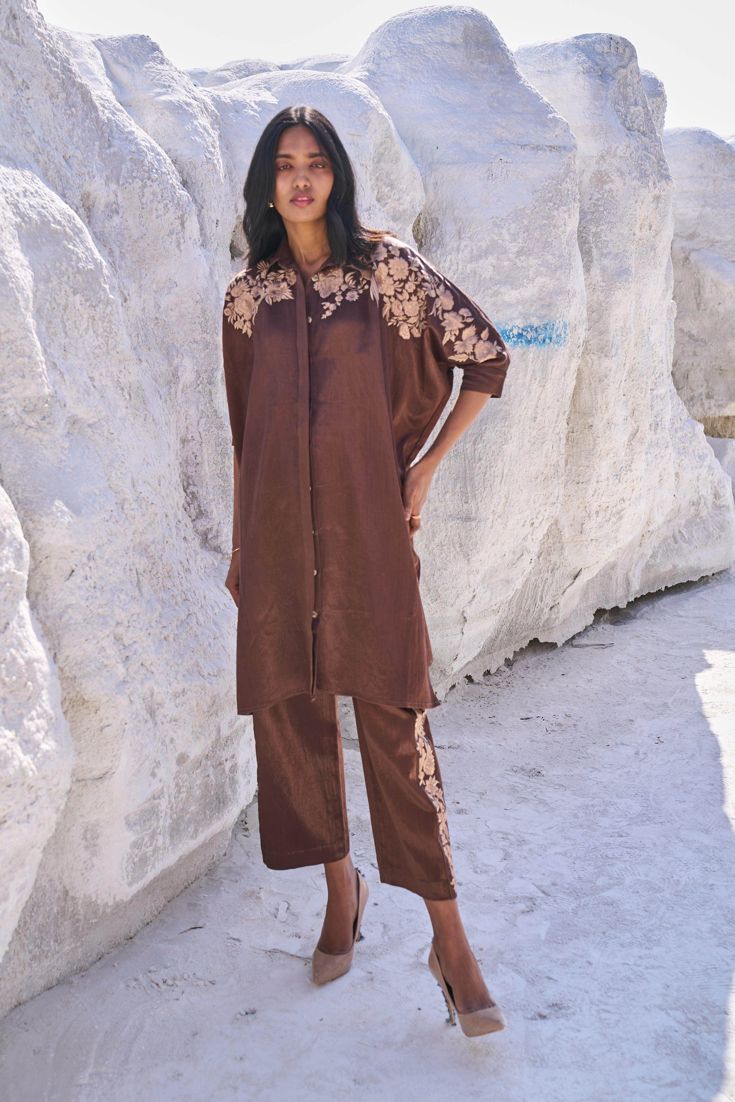 Boxy longline shirt with placed gara stitch inspired embroidery across the shoulders and sleeves. Shirt collar. Concealed button placket. Paired with pants with a similar embroidery detailing down the sides. Pockets on the side. Hook and zip closure at the front.