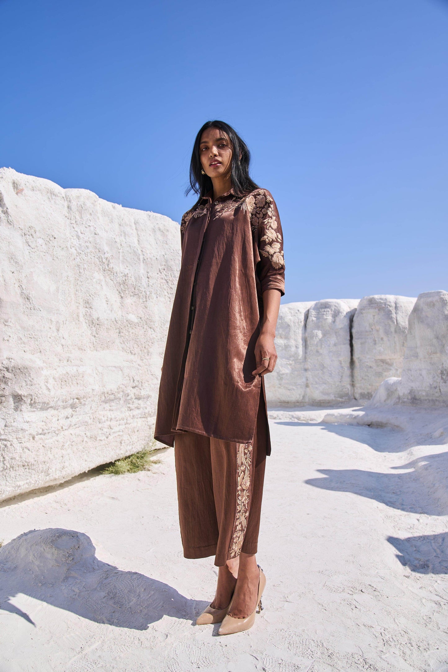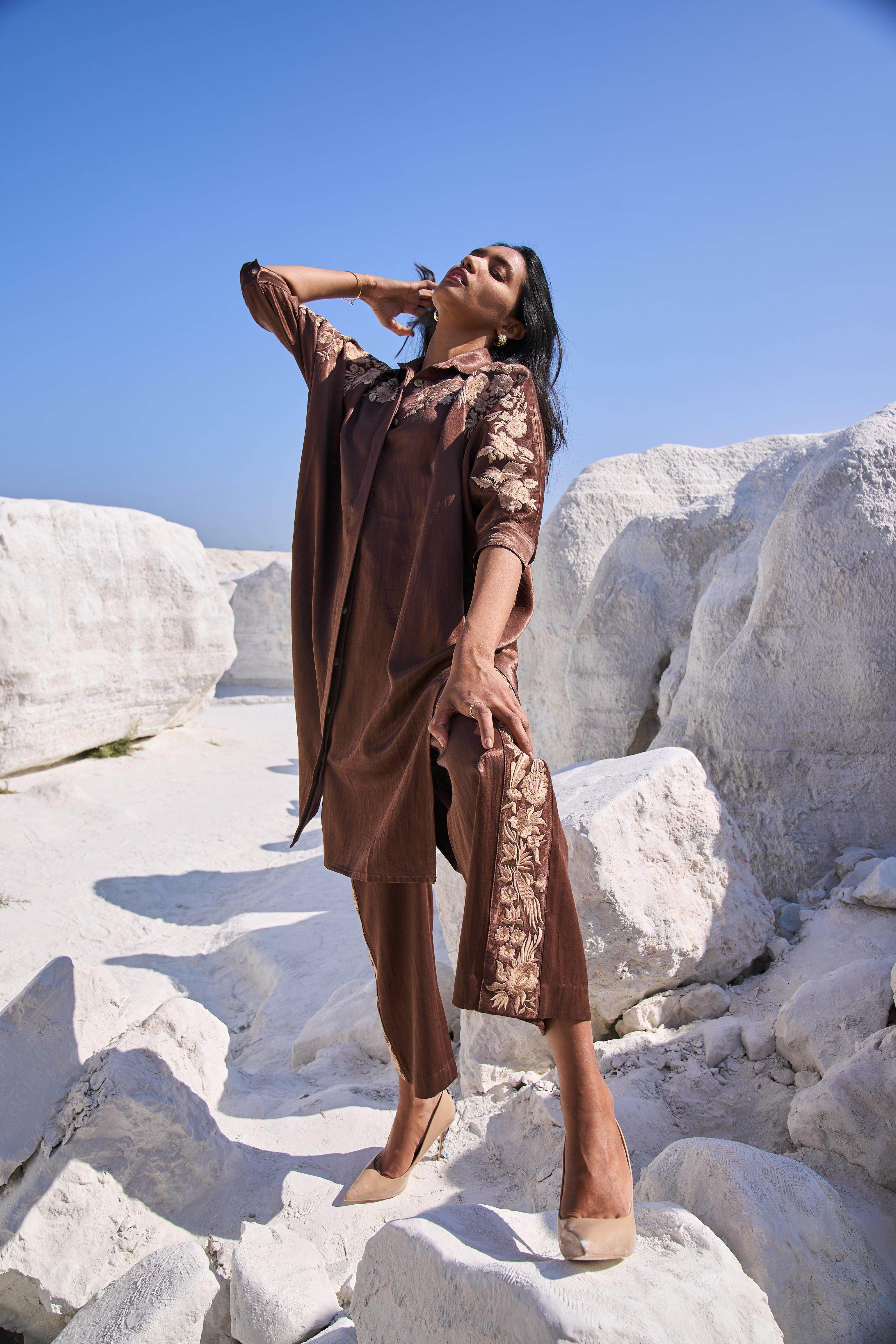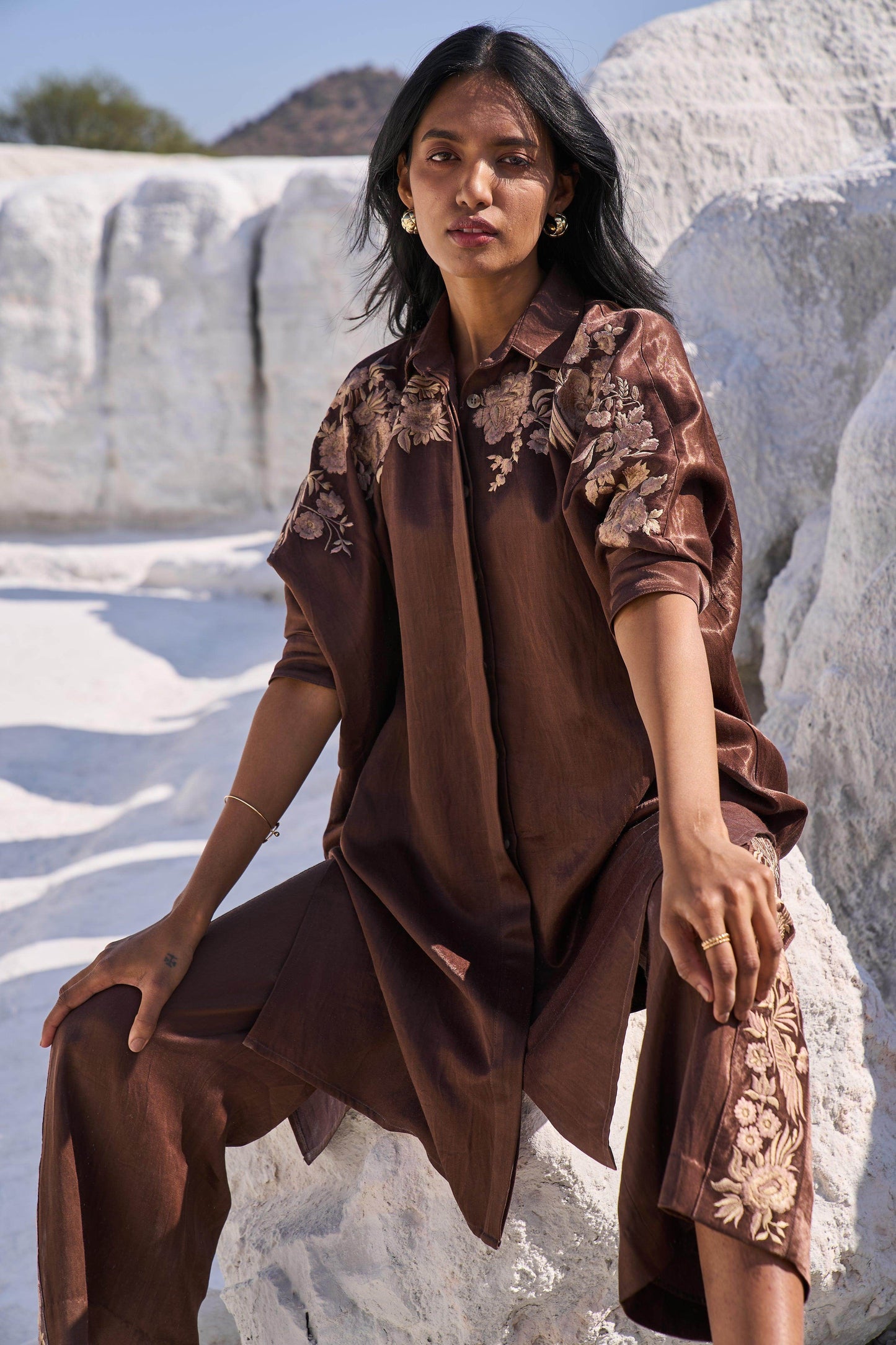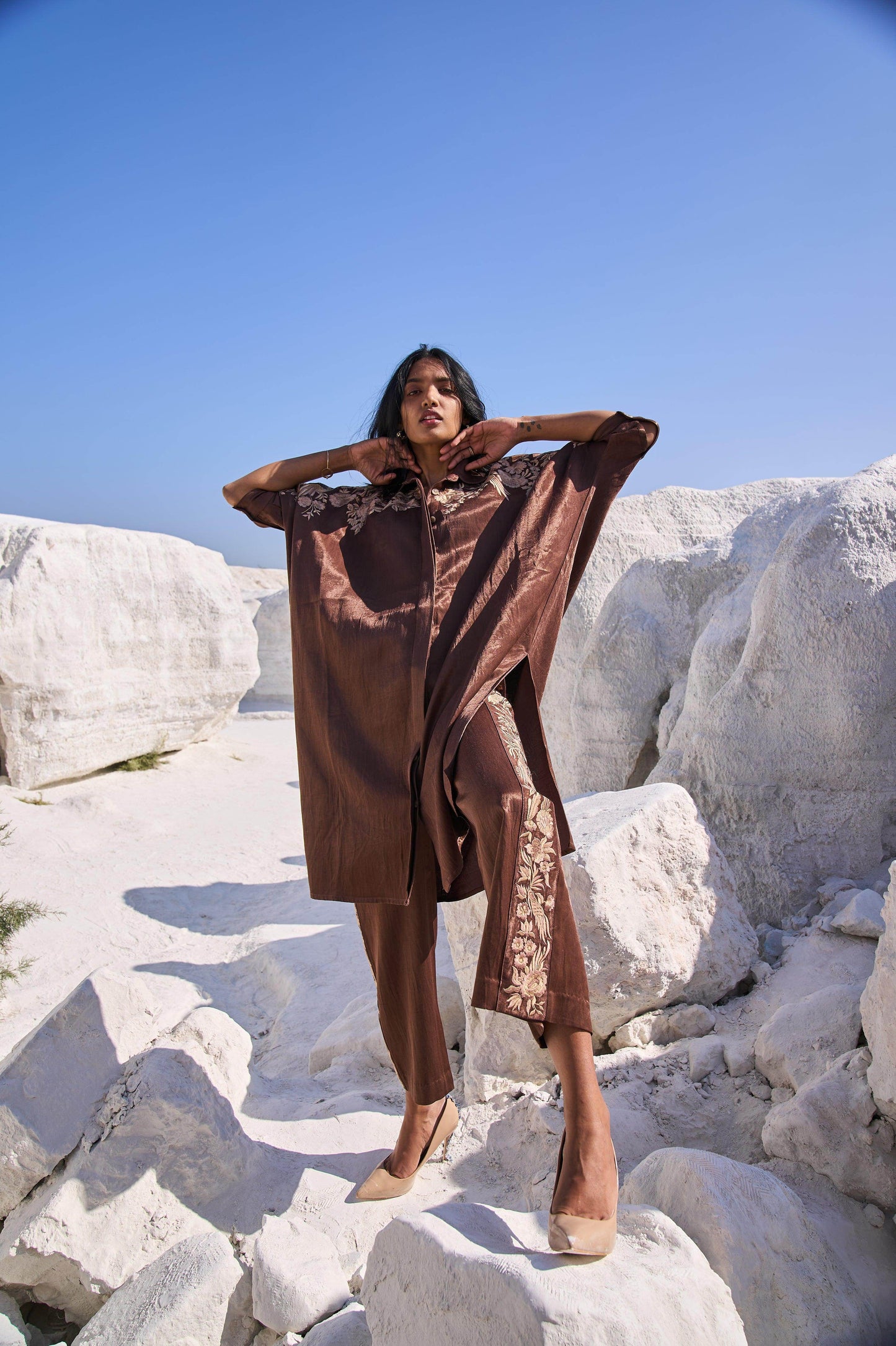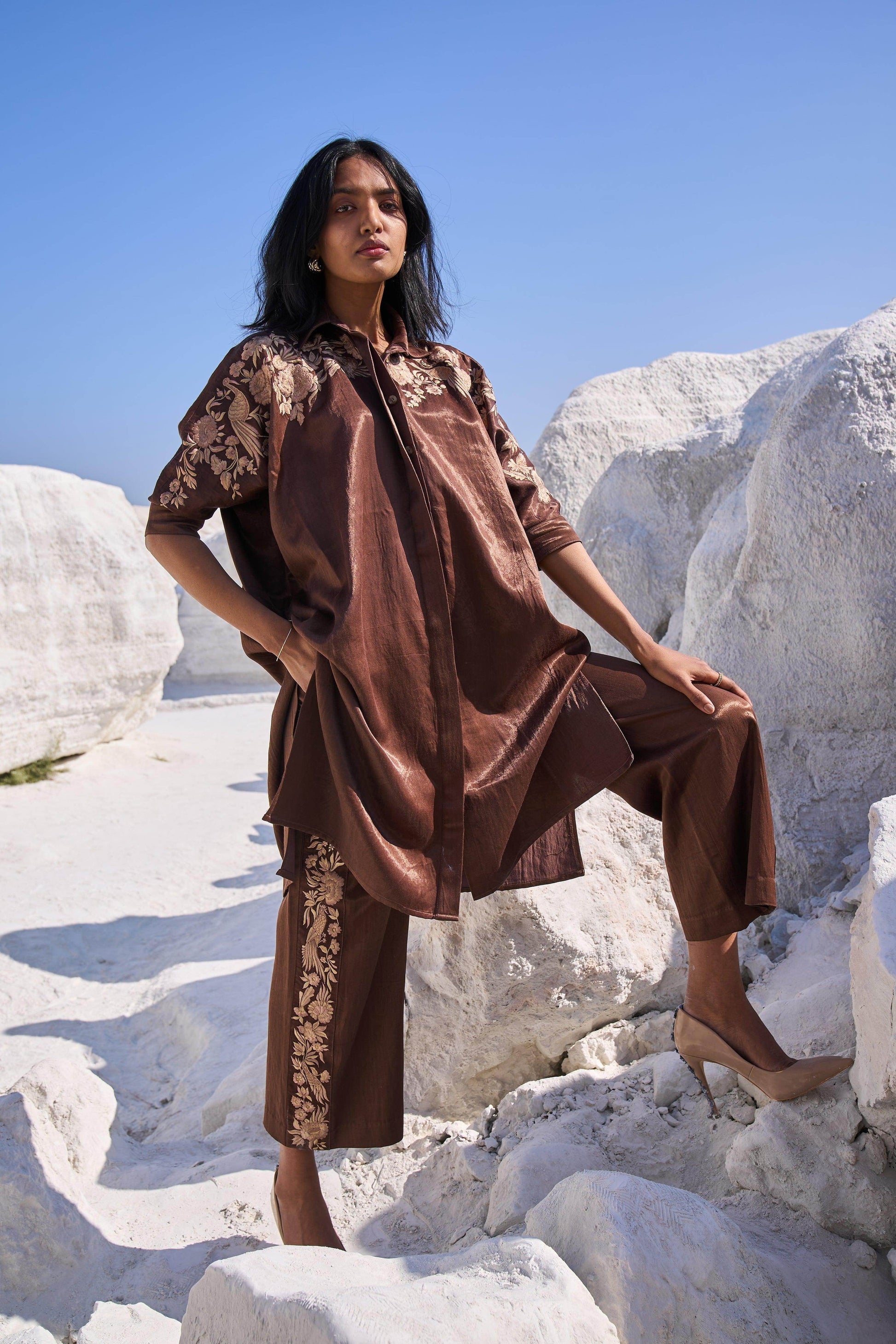 Boxy longline shirt with placed gara stitch inspired embroidery across the shoulders and sleeves. Shirt collar. Concealed button placket. Paired with pants with a similar embroidery detailing down the sides. Pockets on the side. Hook and zip closure at the front.