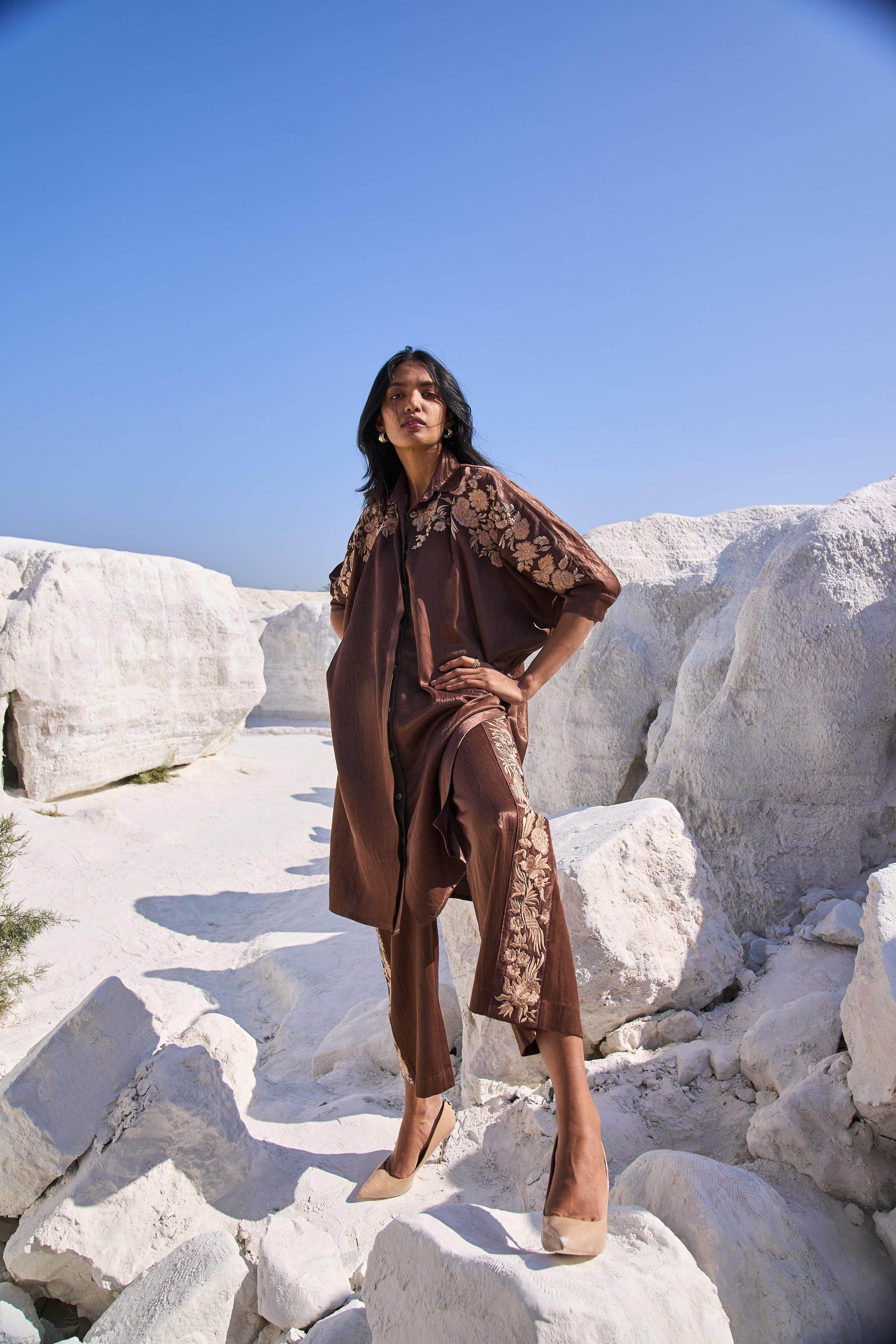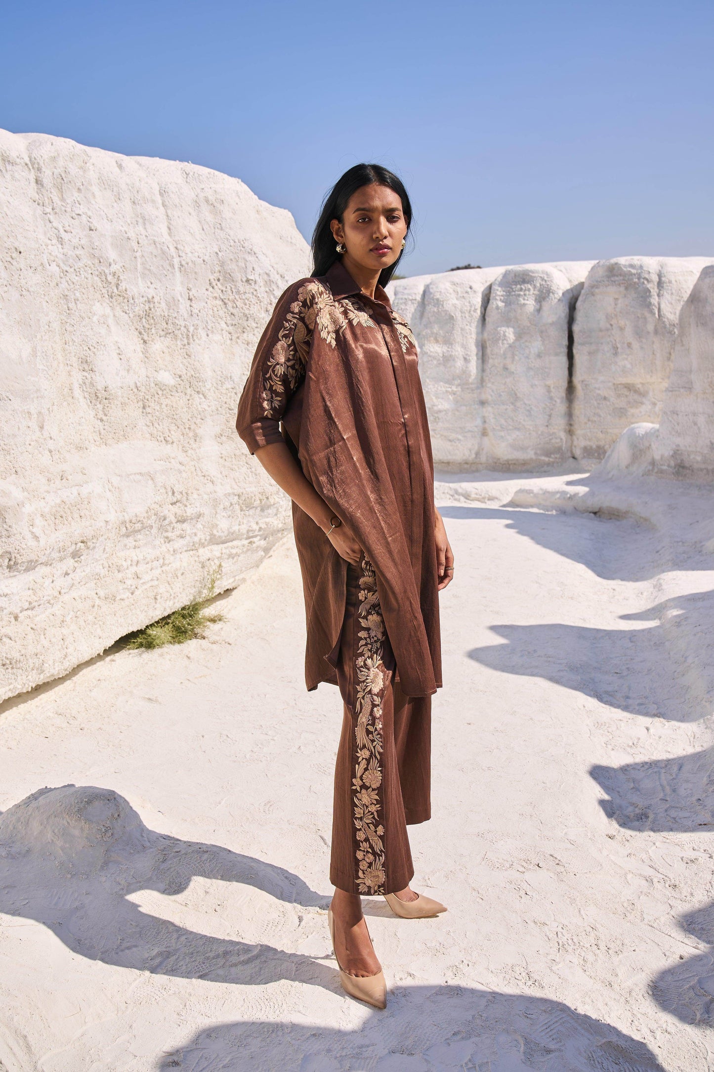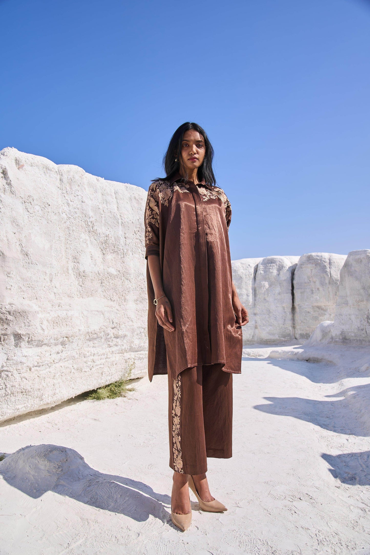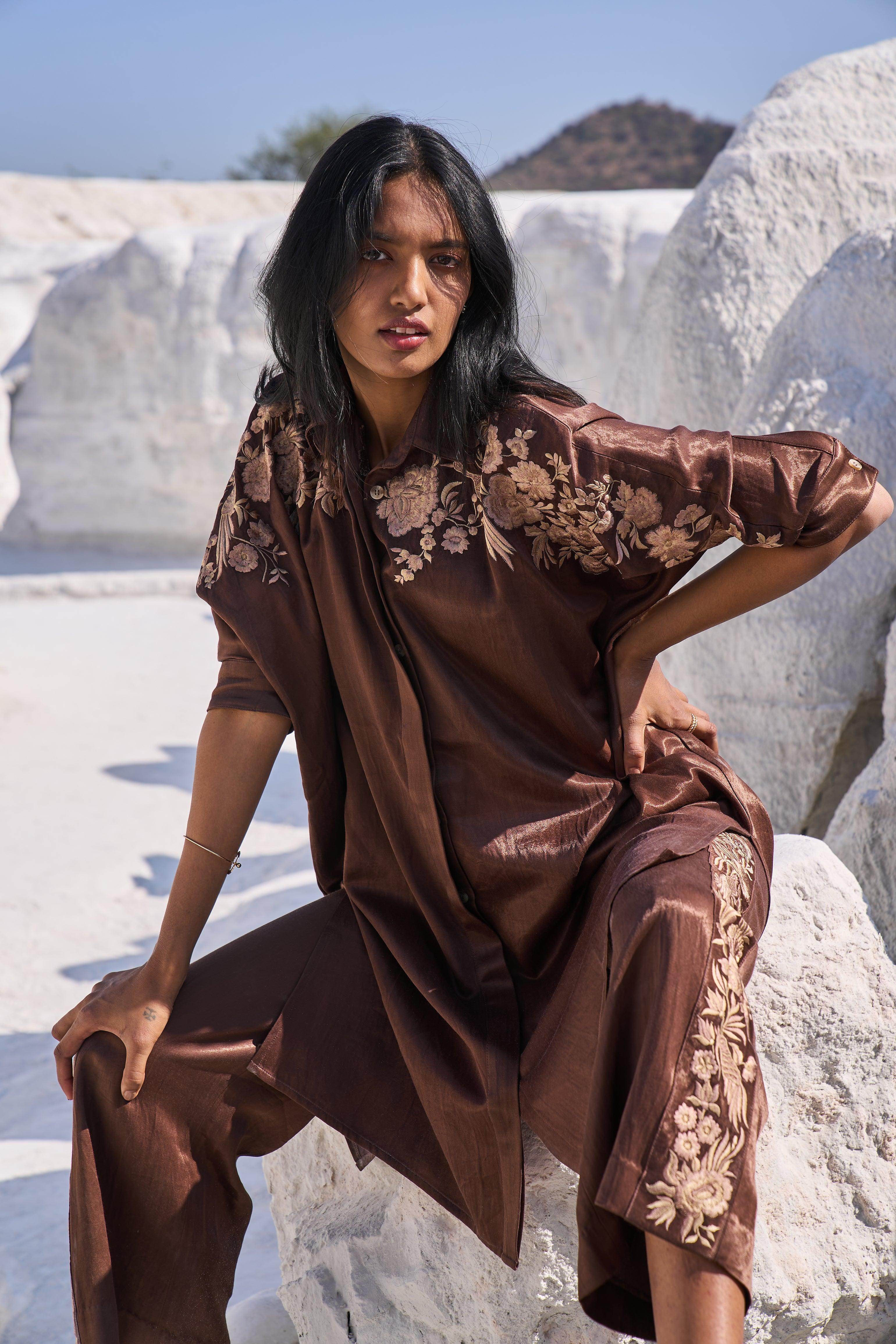 Boxy longline shirt with placed gara stitch inspired embroidery across the shoulders and sleeves. Shirt collar. Concealed button placket. Paired with pants with a similar embroidery detailing down the sides. Pockets on the side. Hook and zip closure at the front.