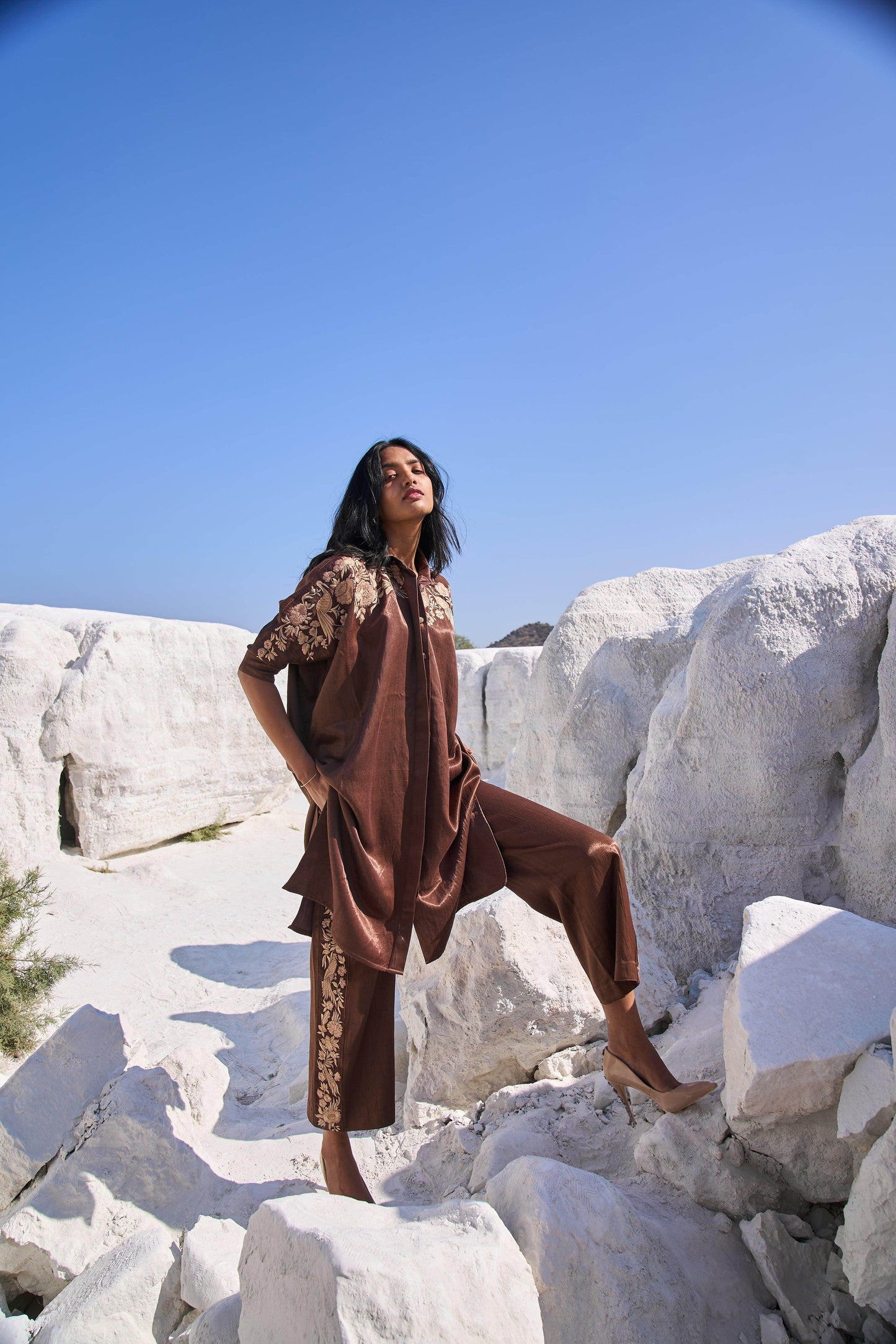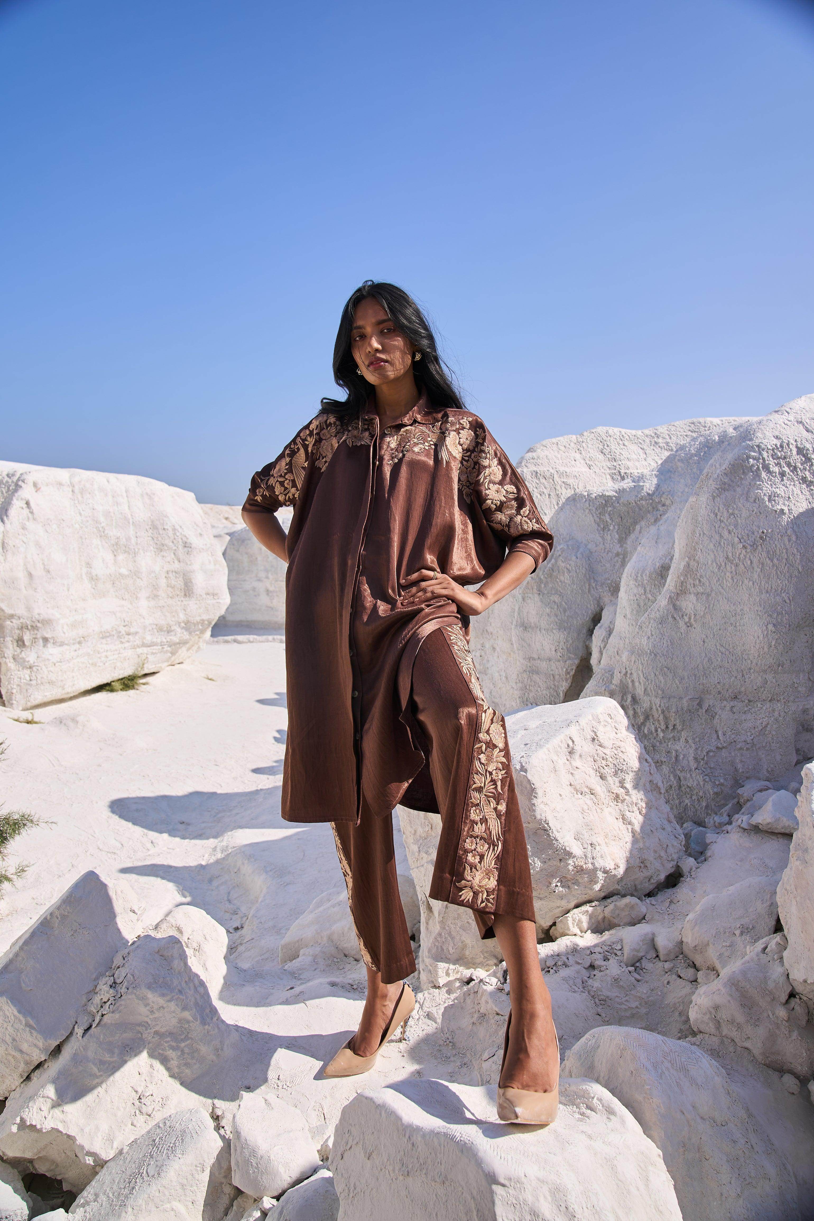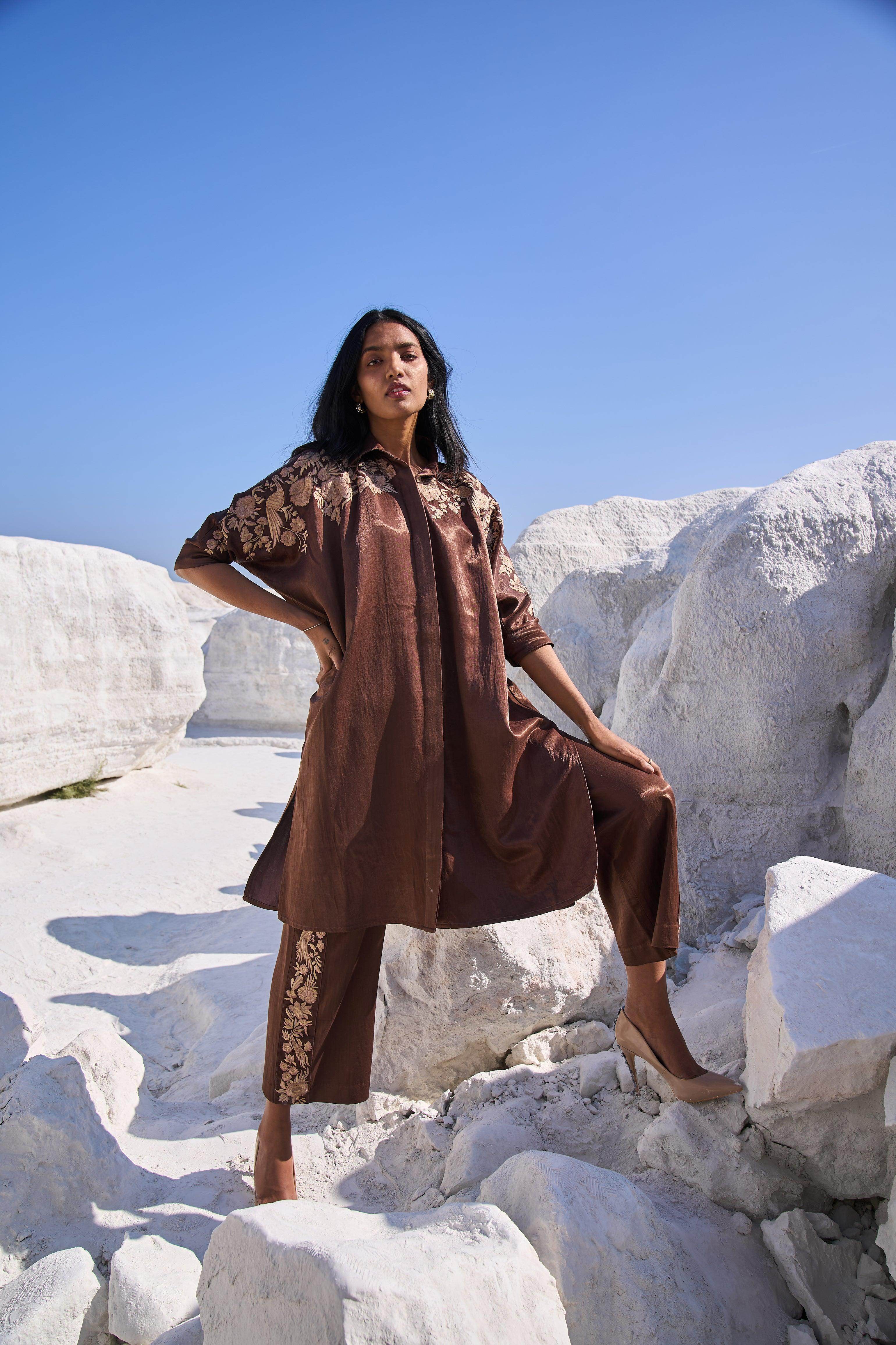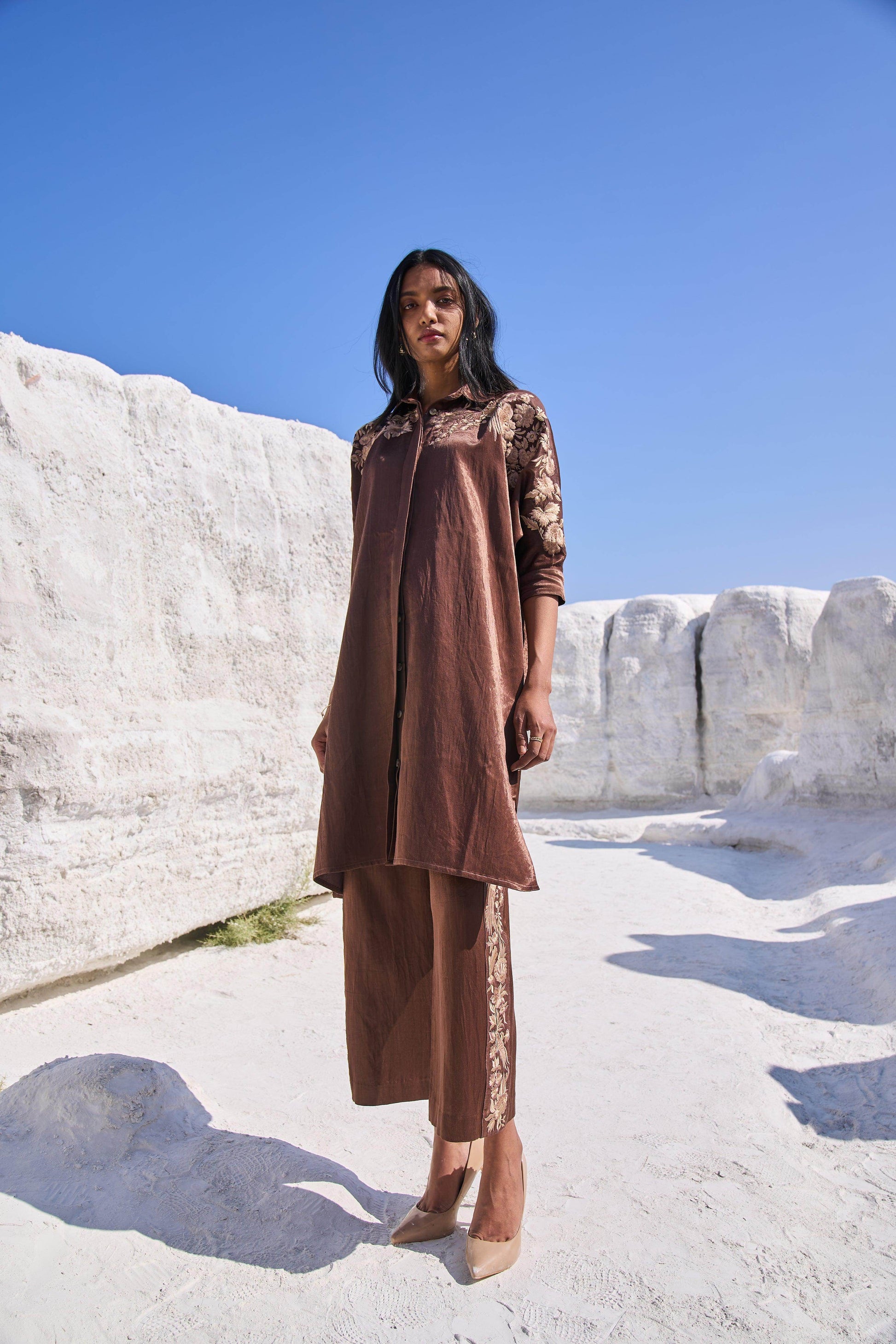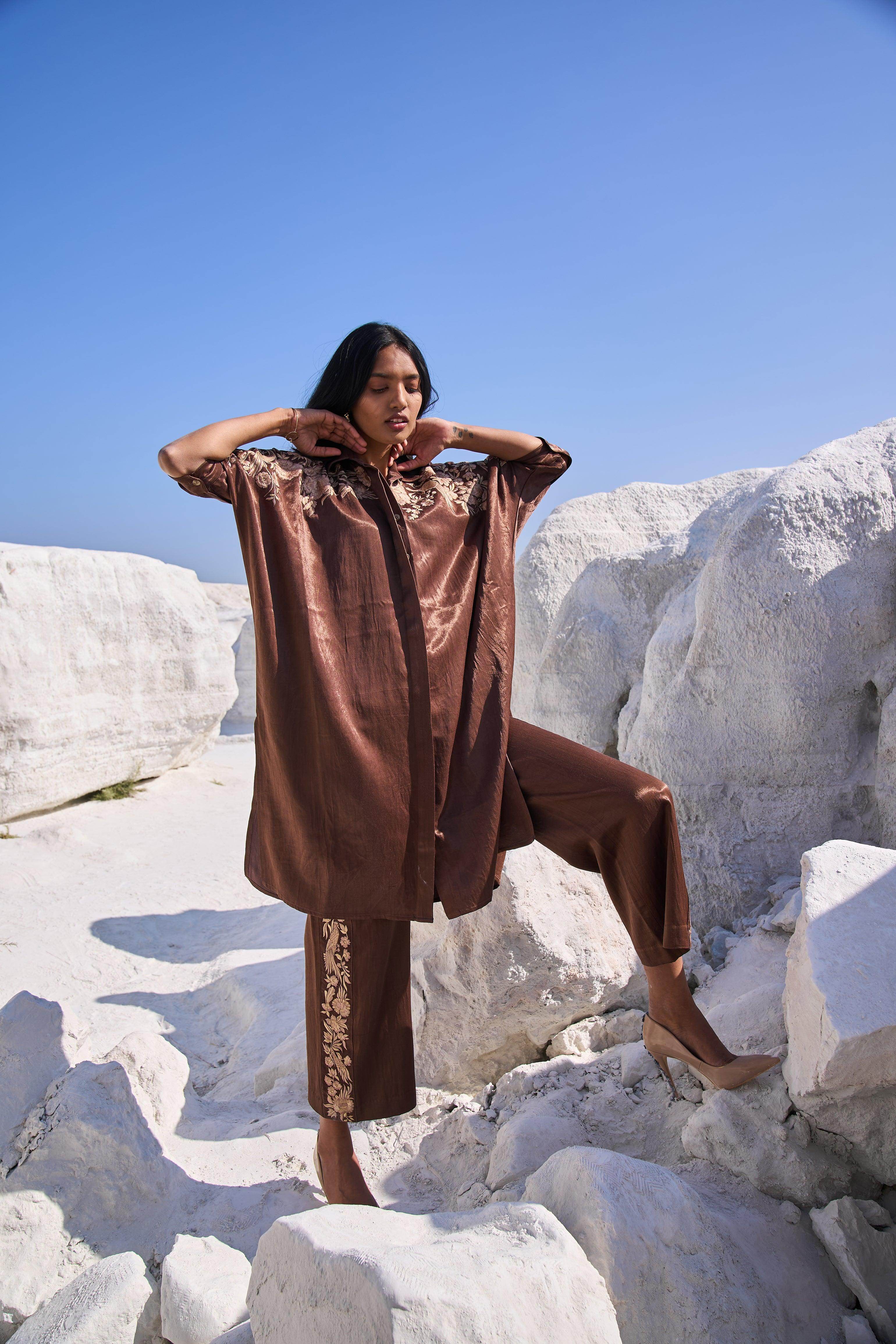 Boxy longline shirt with placed gara stitch inspired embroidery across the shoulders and sleeves. Shirt collar. Concealed button placket. Paired with pants with a similar embroidery detailing down the sides. Pockets on the side. Hook and zip closure at the front.