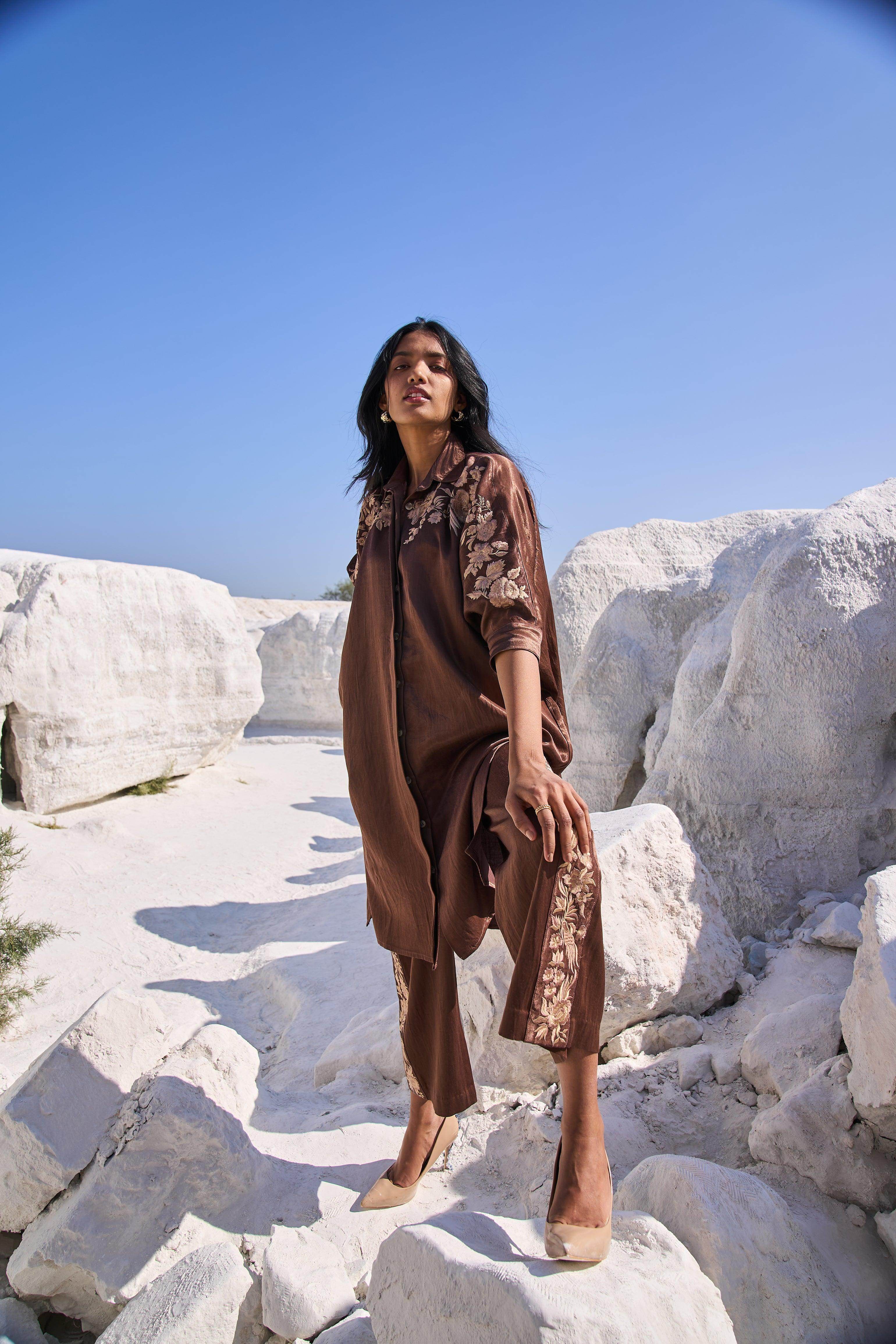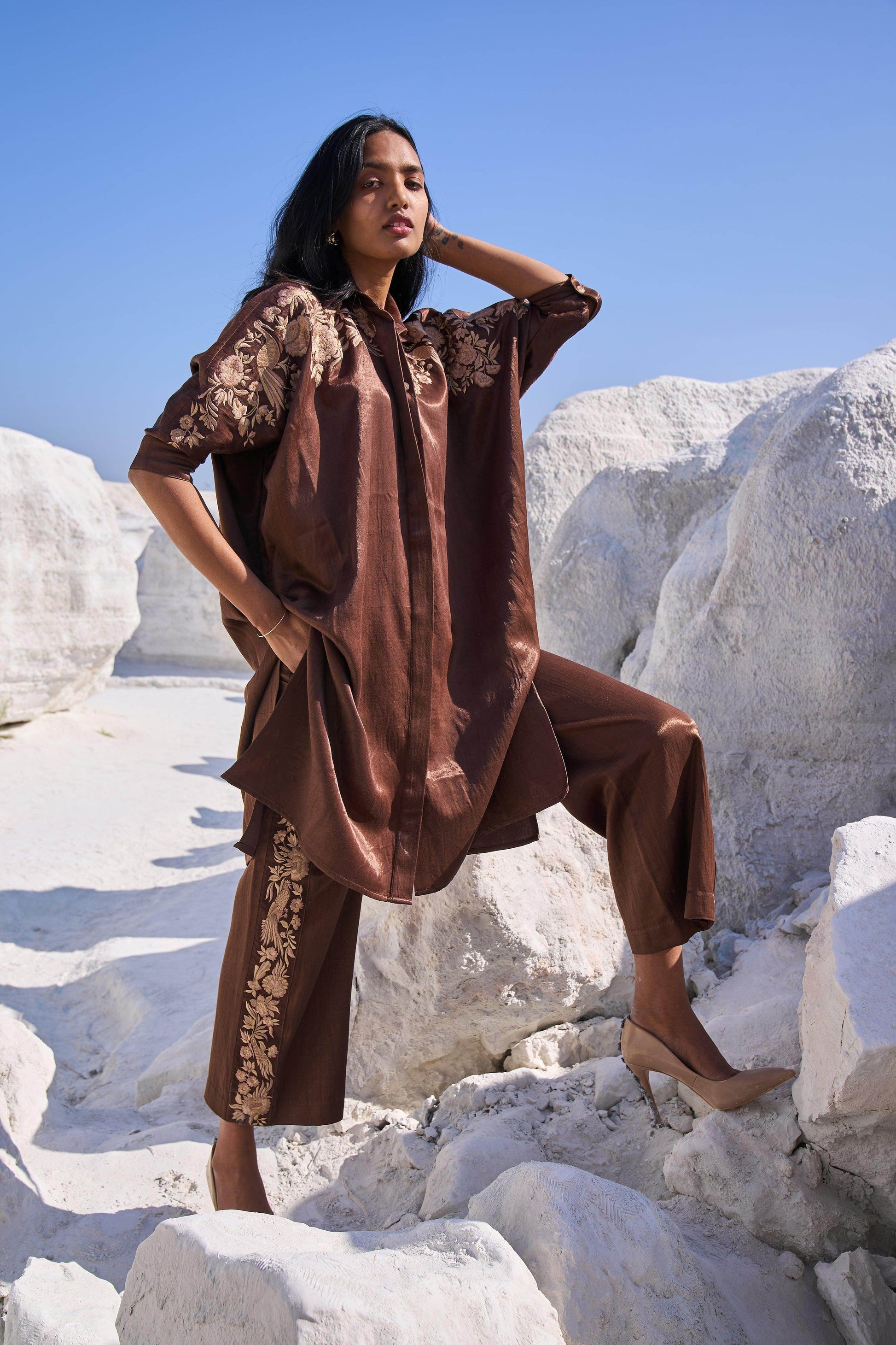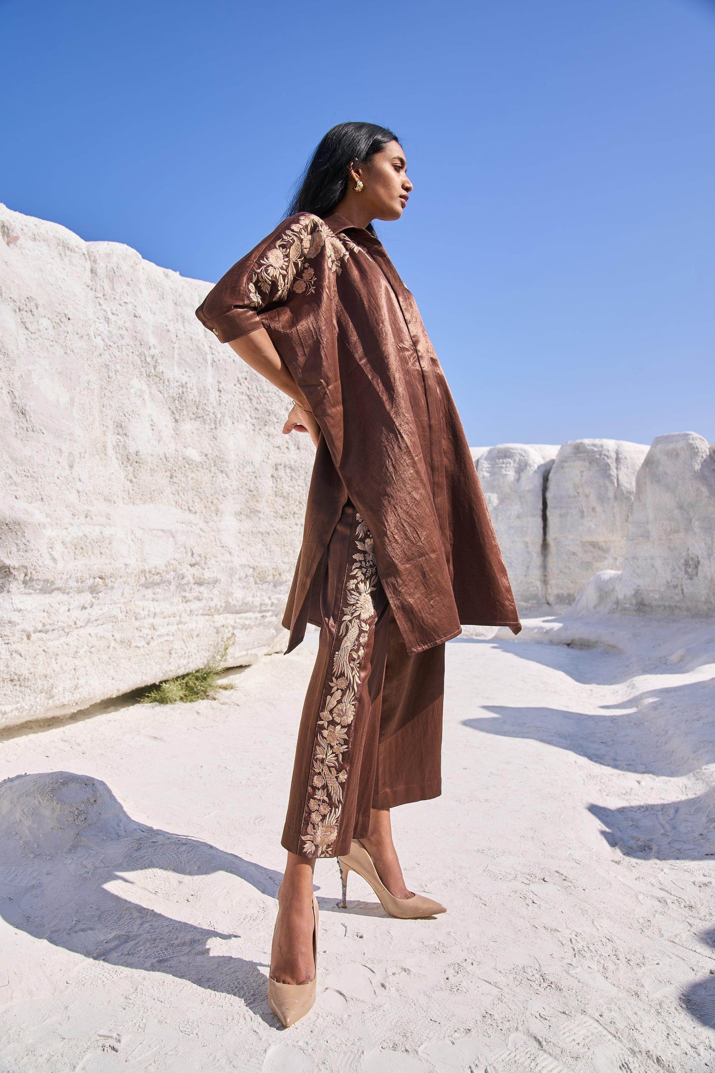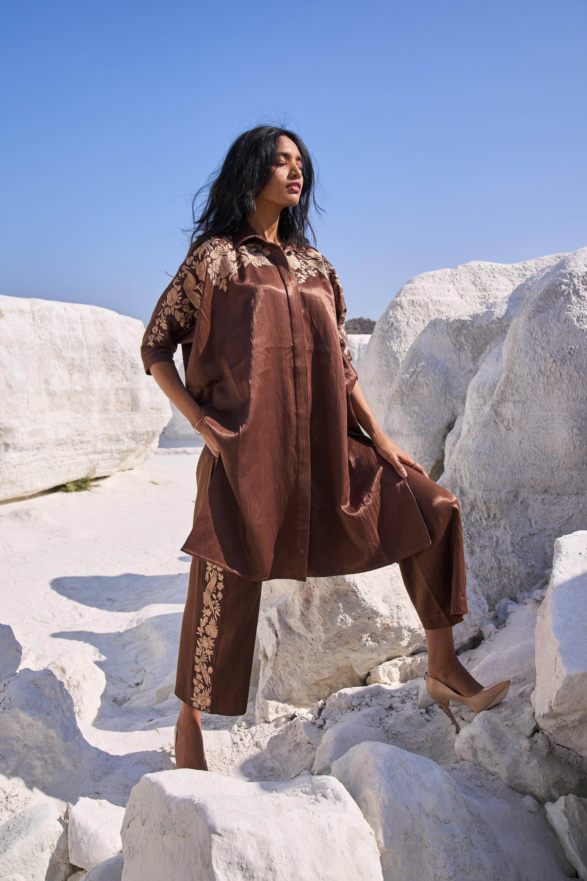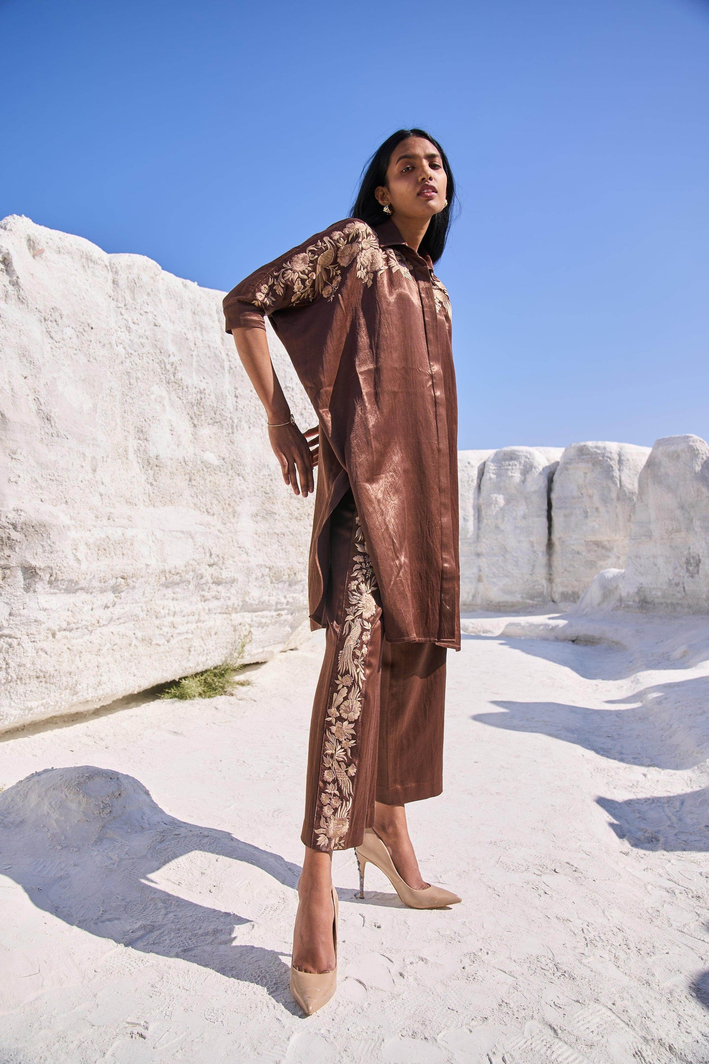 Boxy longline shirt with placed gara stitch inspired embroidery across the shoulders and sleeves. Shirt collar. Concealed button placket. Paired with pants with a similar embroidery detailing down the sides. Pockets on the side. Hook and zip closure at the front.