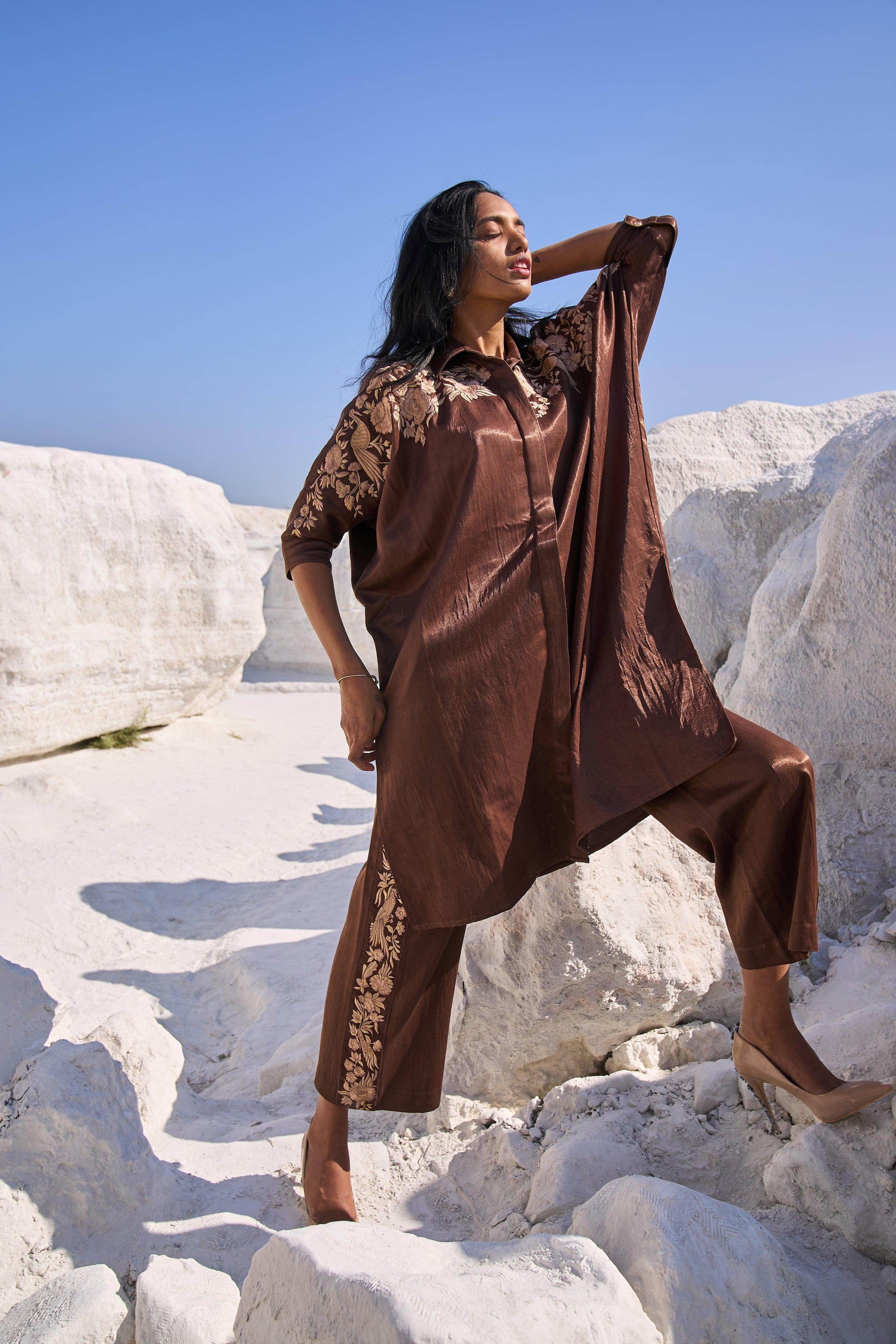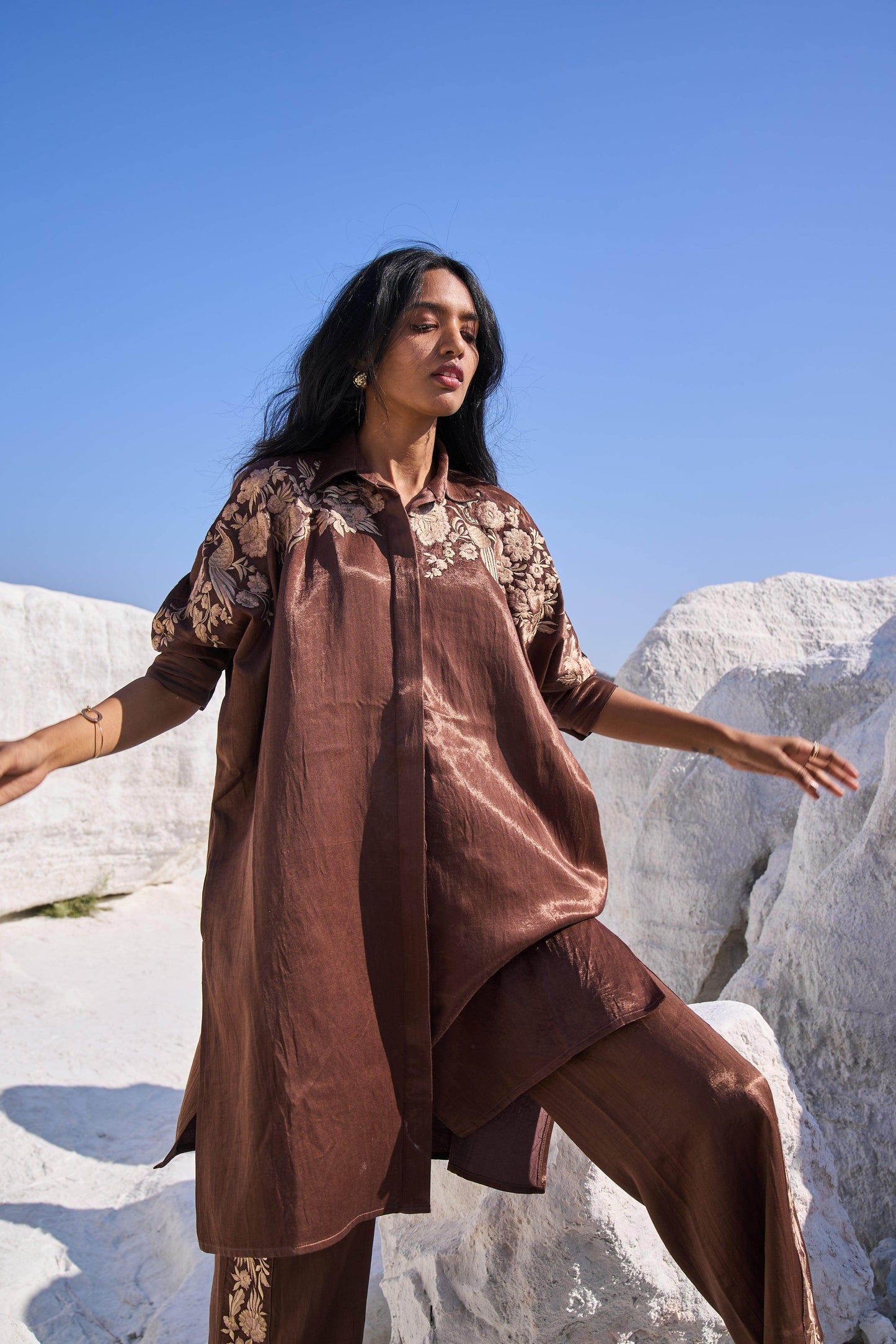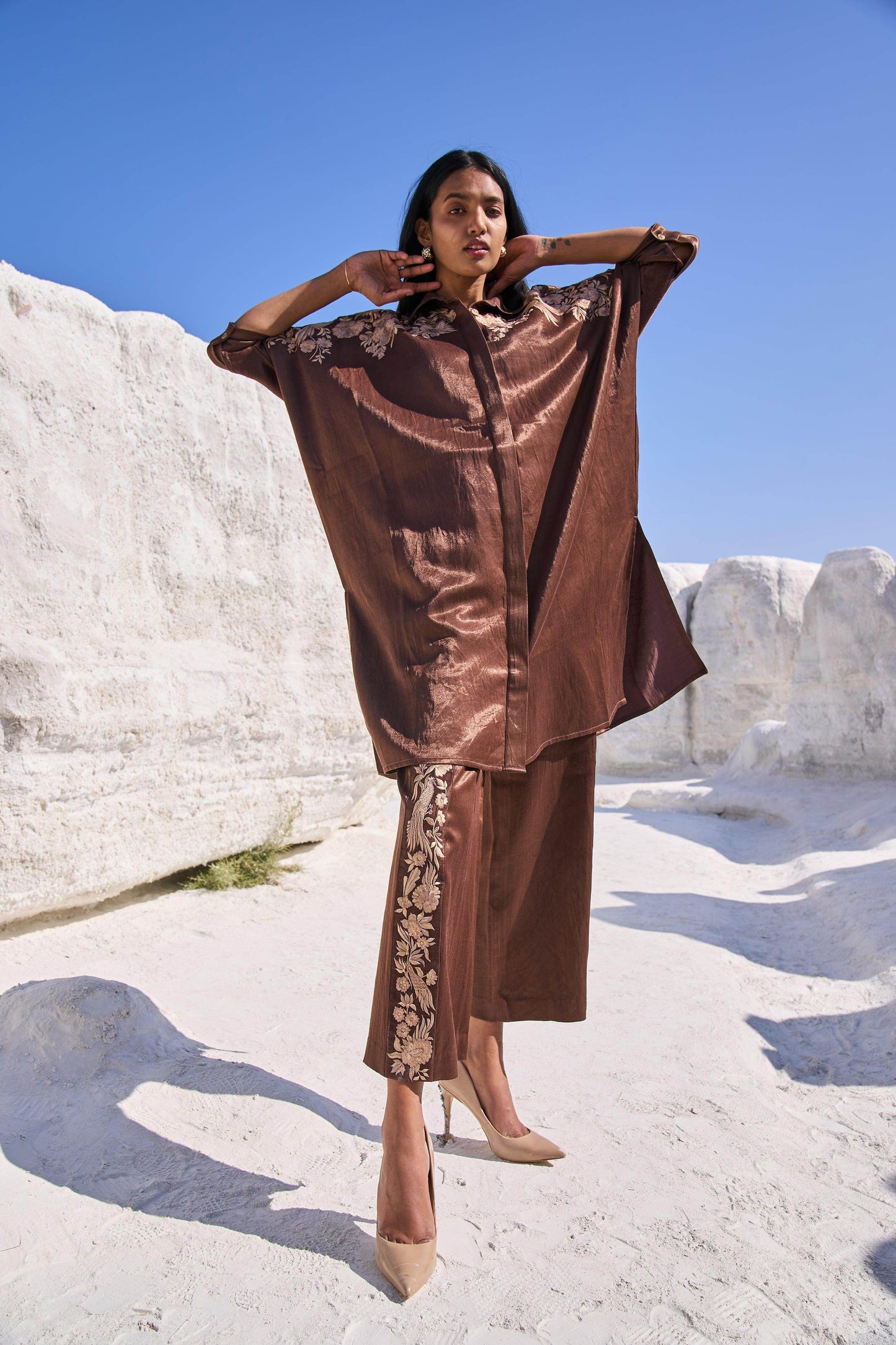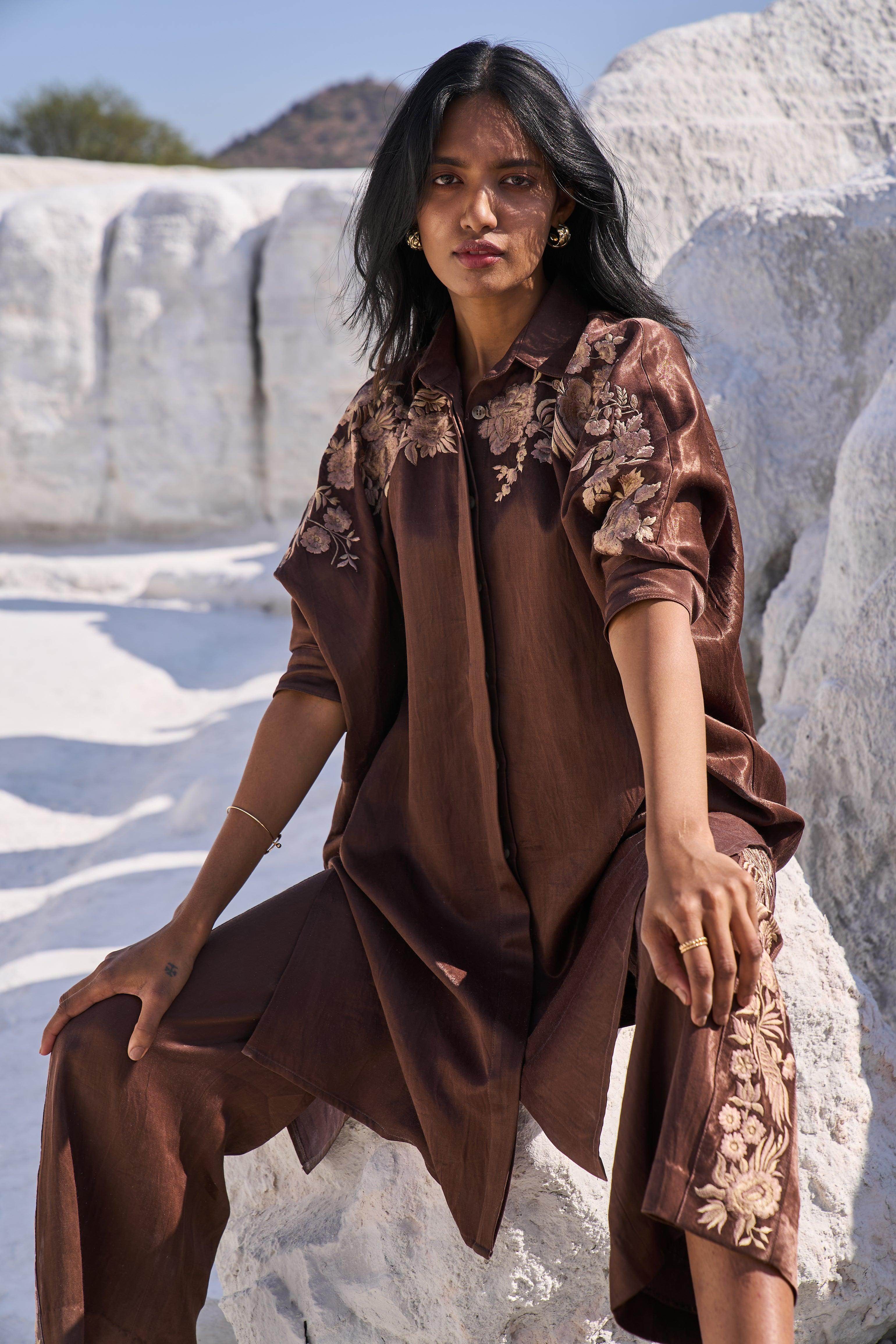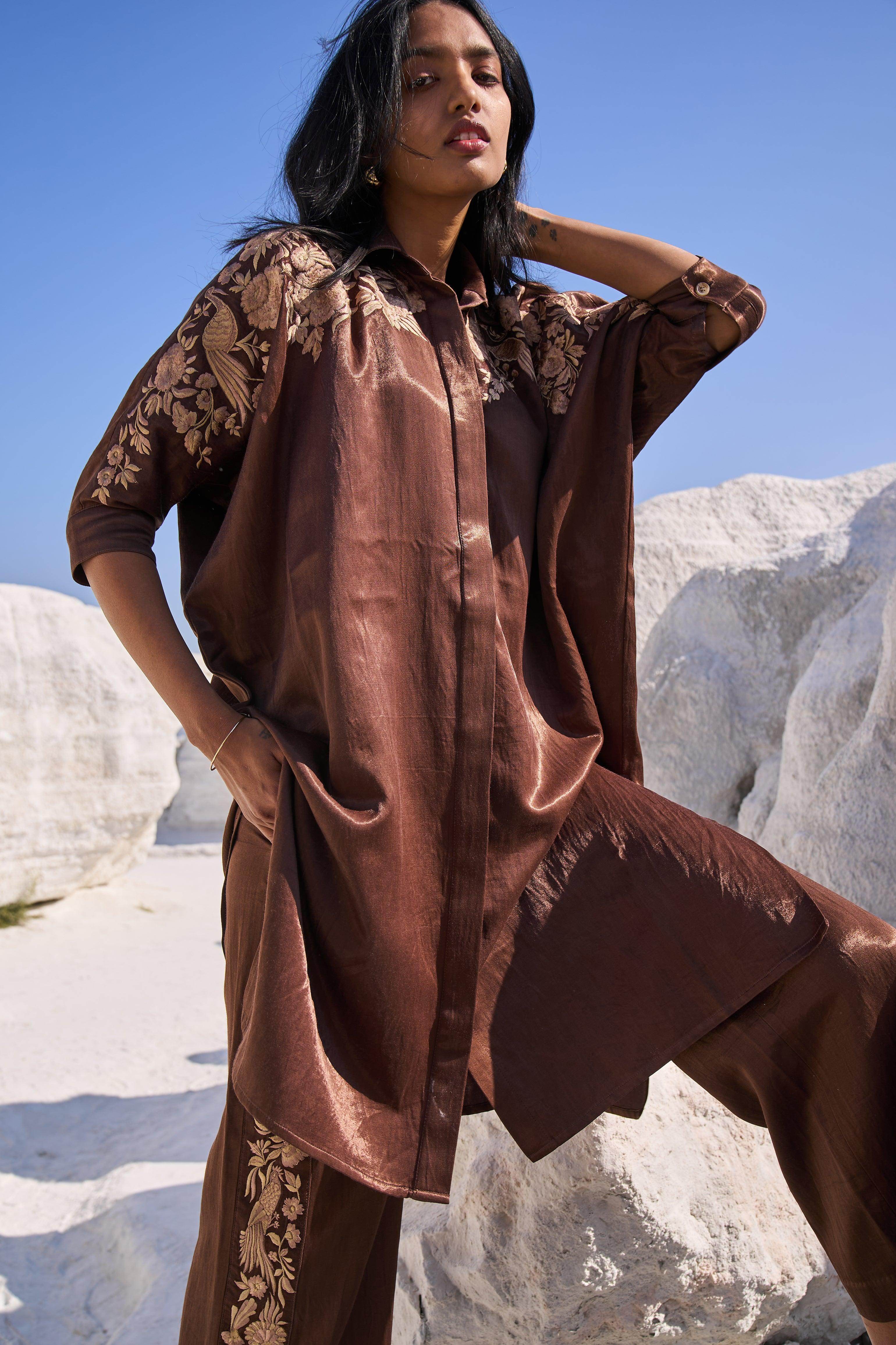 Boxy longline shirt with placed gara stitch inspired embroidery across the shoulders and sleeves. Shirt collar. Concealed button placket. Paired with pants with a similar embroidery detailing down the sides. Pockets on the side. Hook and zip closure at the front.